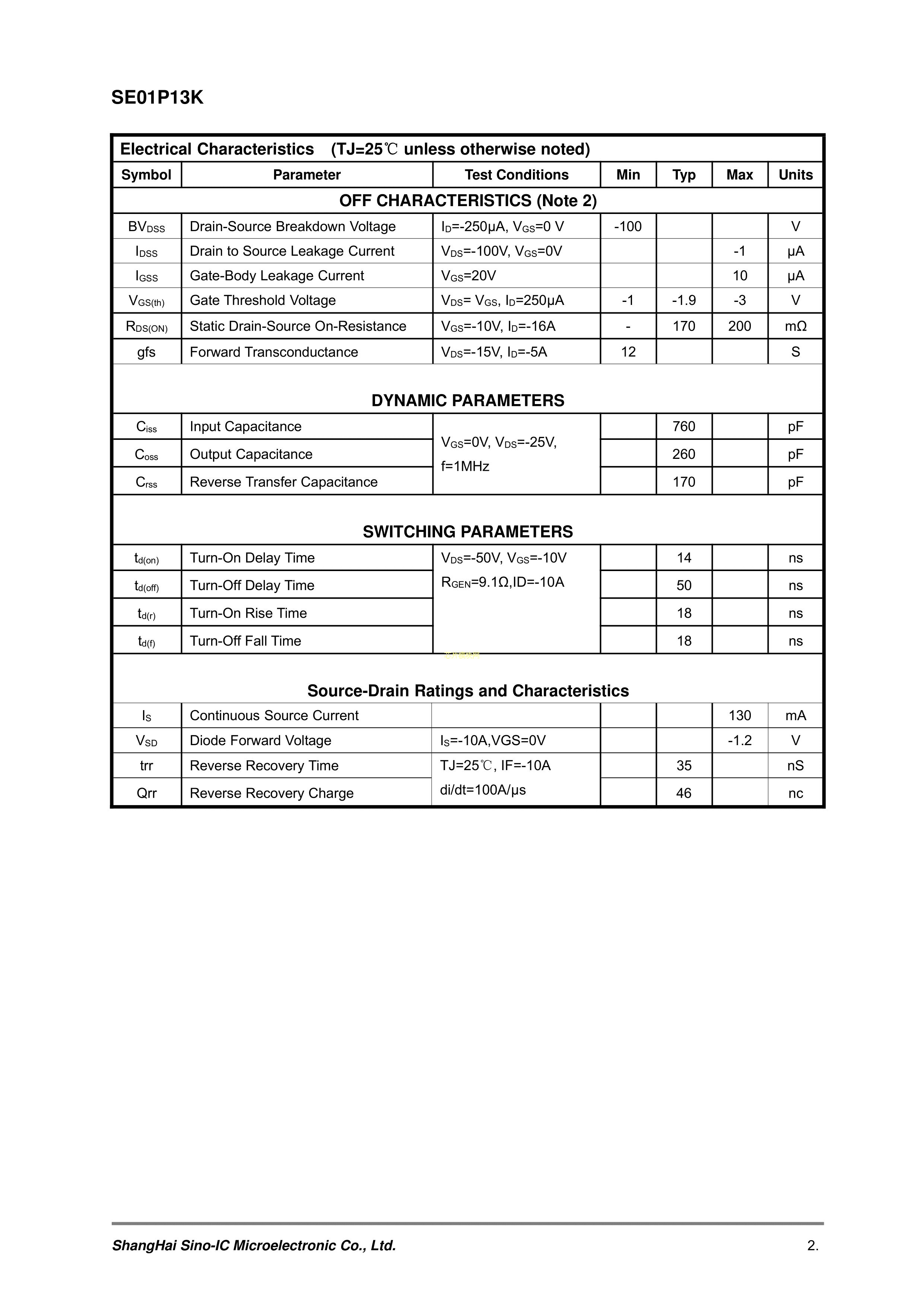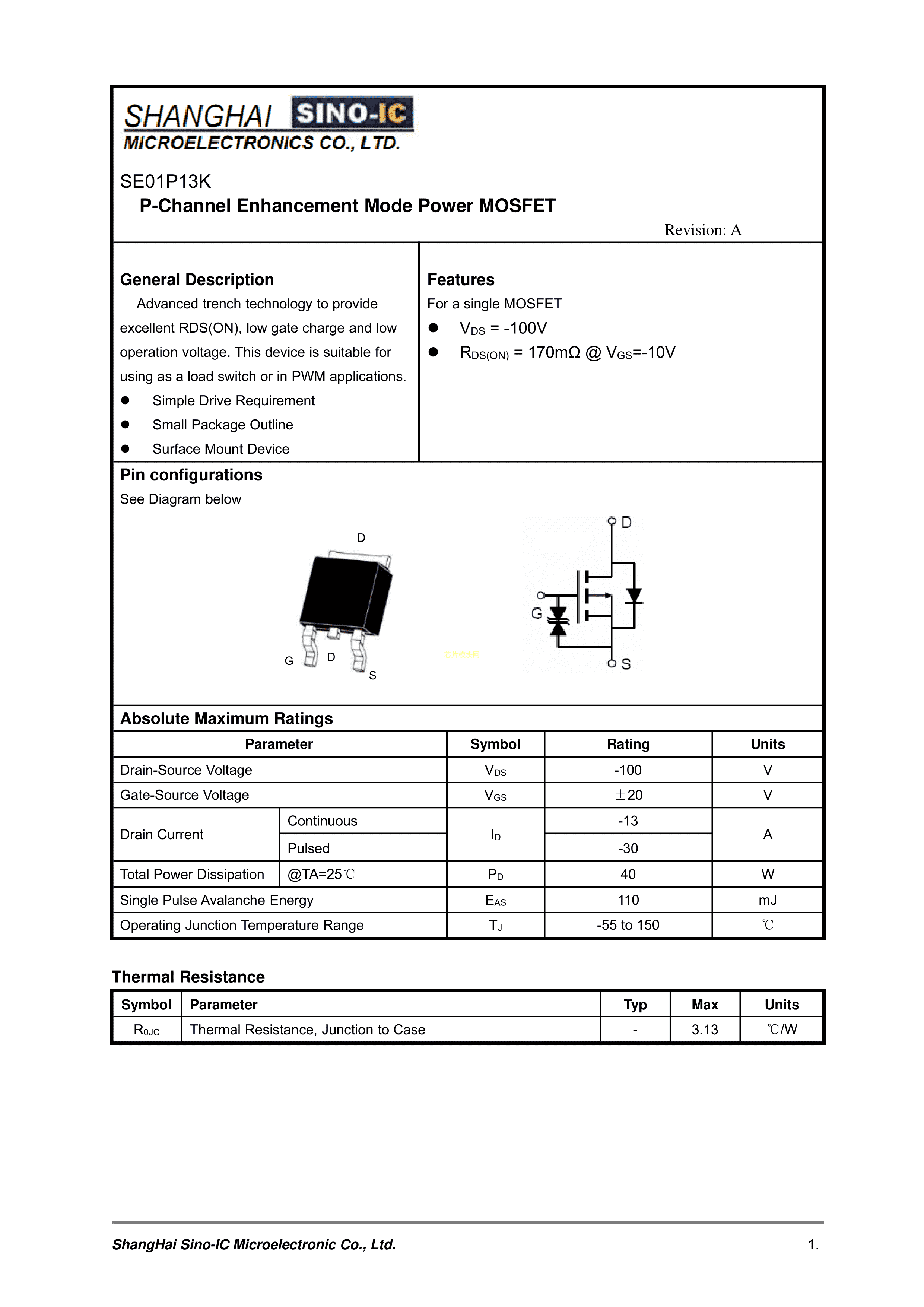 SE01P13K数据手册TO-252-2(DPAK)封装SINO-IC(光宇睿芯)PDF规格书,中英文下载