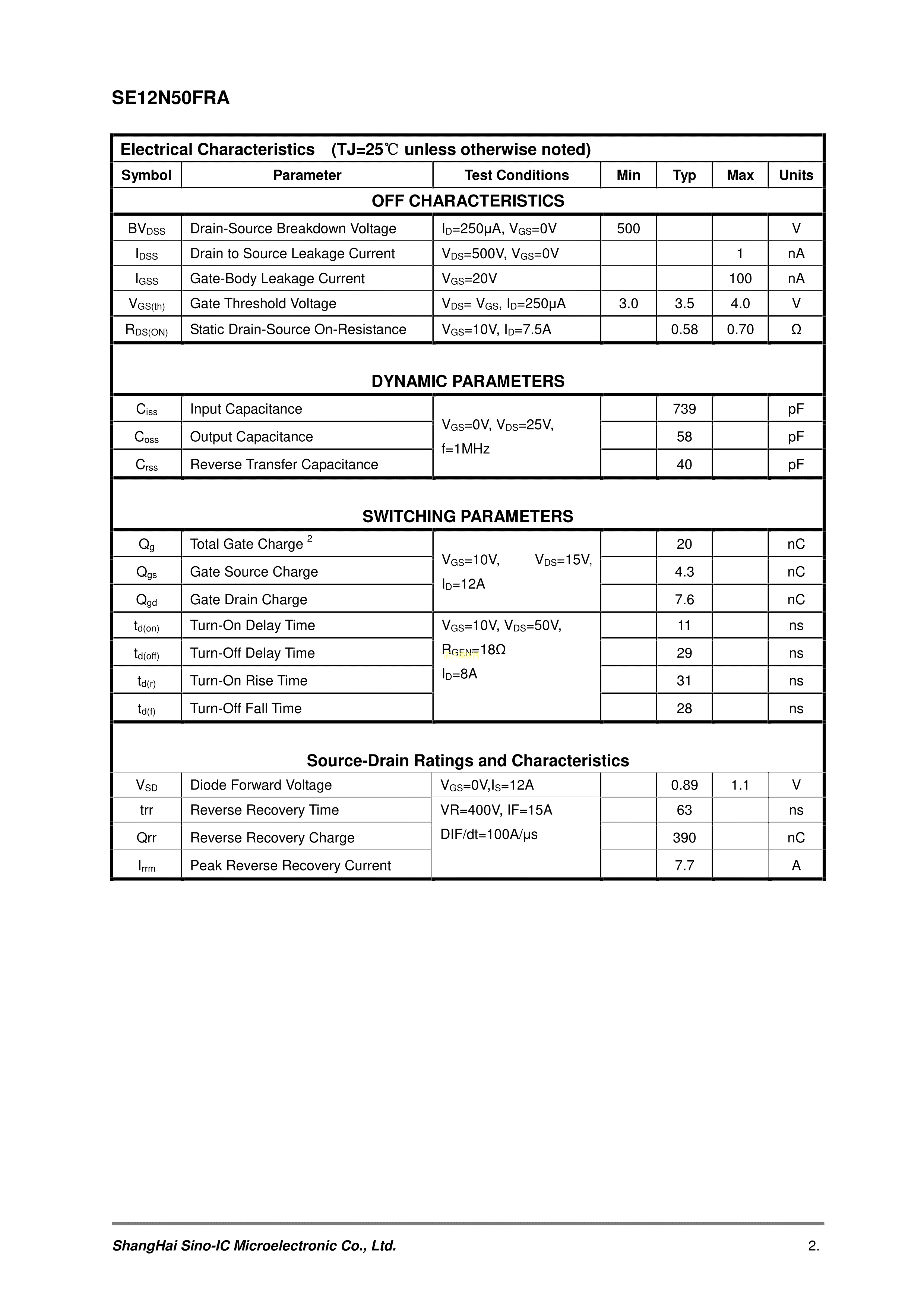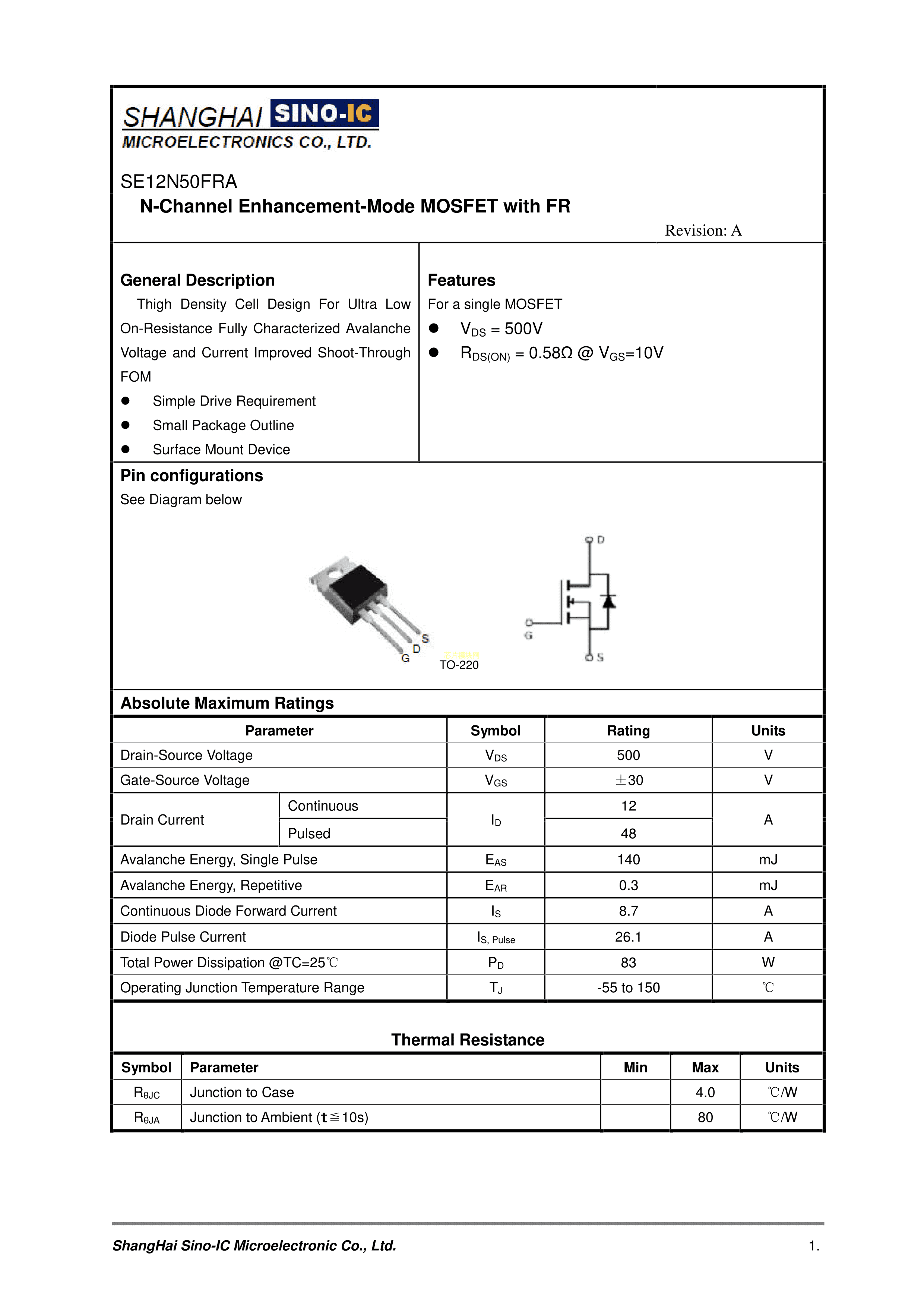 SE12N50FRA数据手册TO-220封装SINO-IC(光宇睿芯)PDF规格书,中英文下载