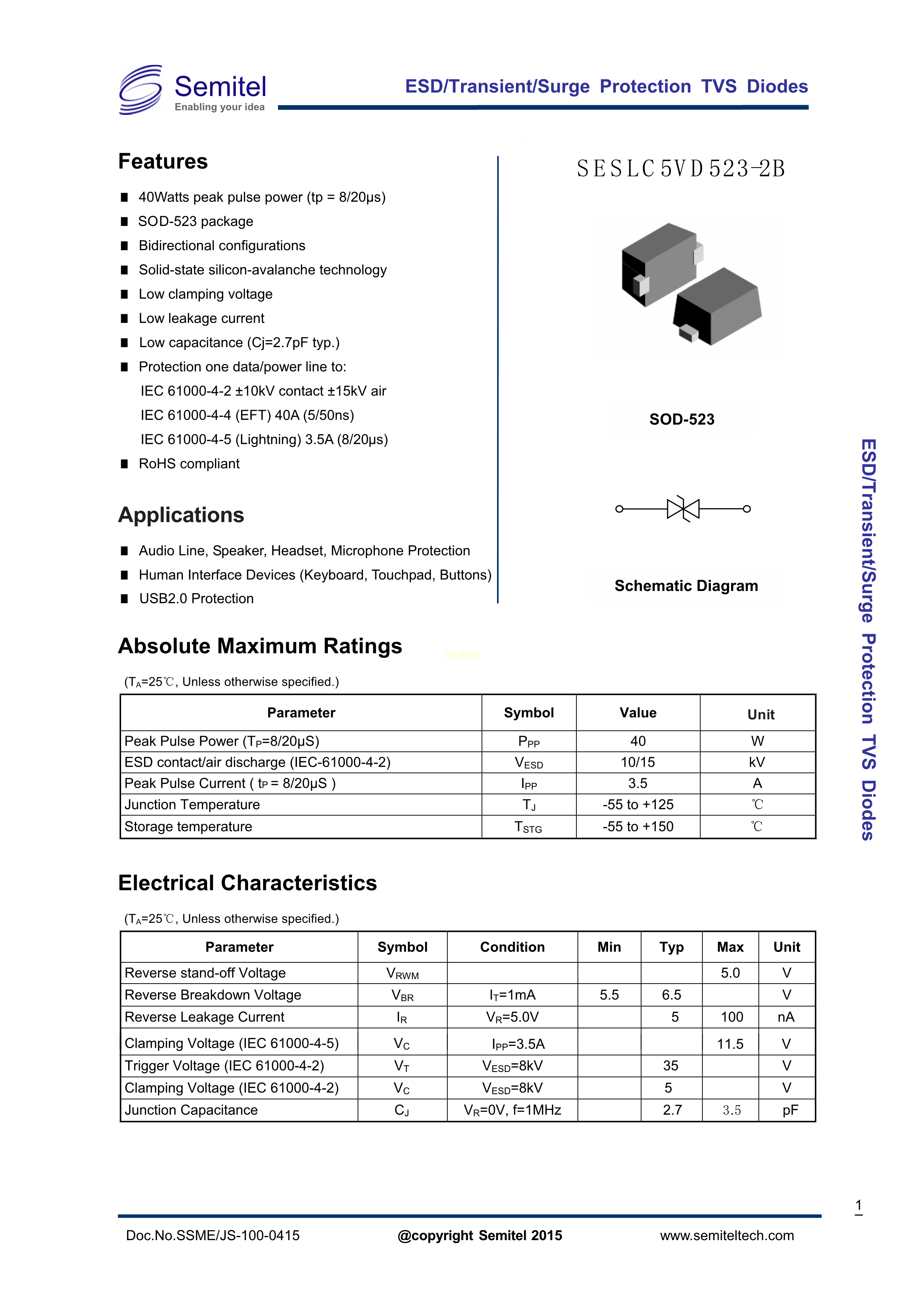 SESLC5VD523-2B数据手册SOD-523封装Semitel(晶讯)PDF规格书,中英文下载
