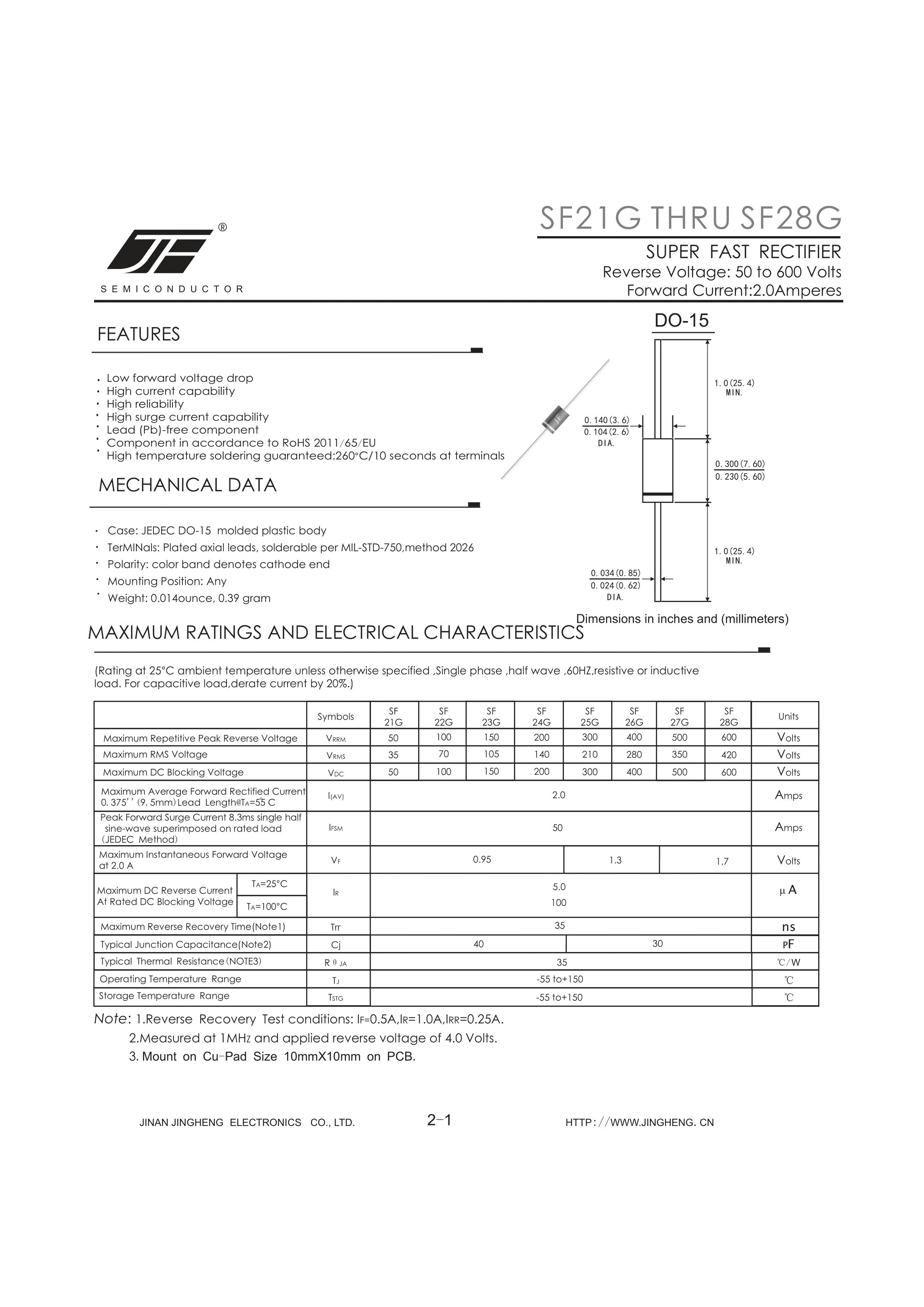 SF26G数据手册DO-15封装JF(吉福)PDF规格书,中英文下载