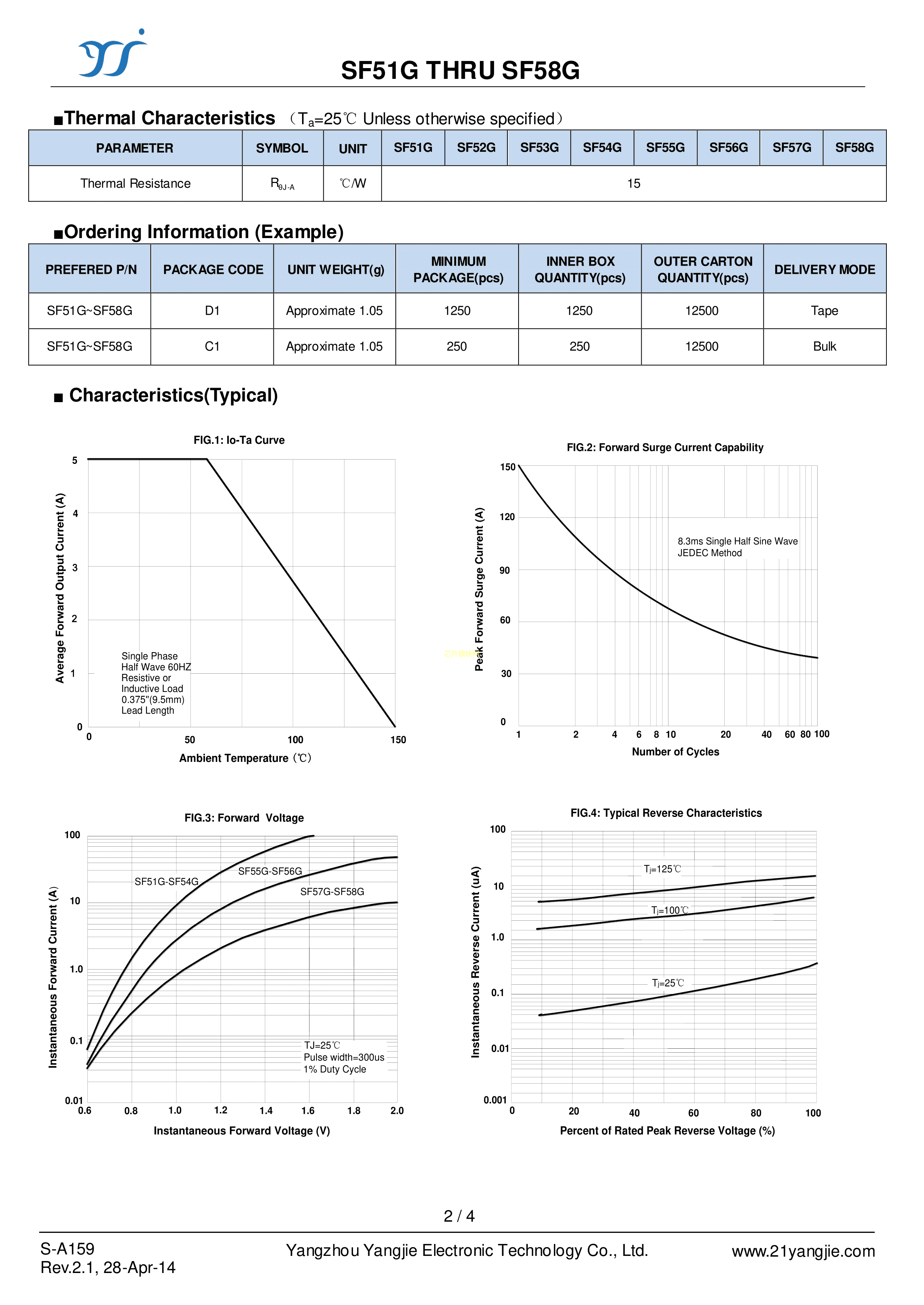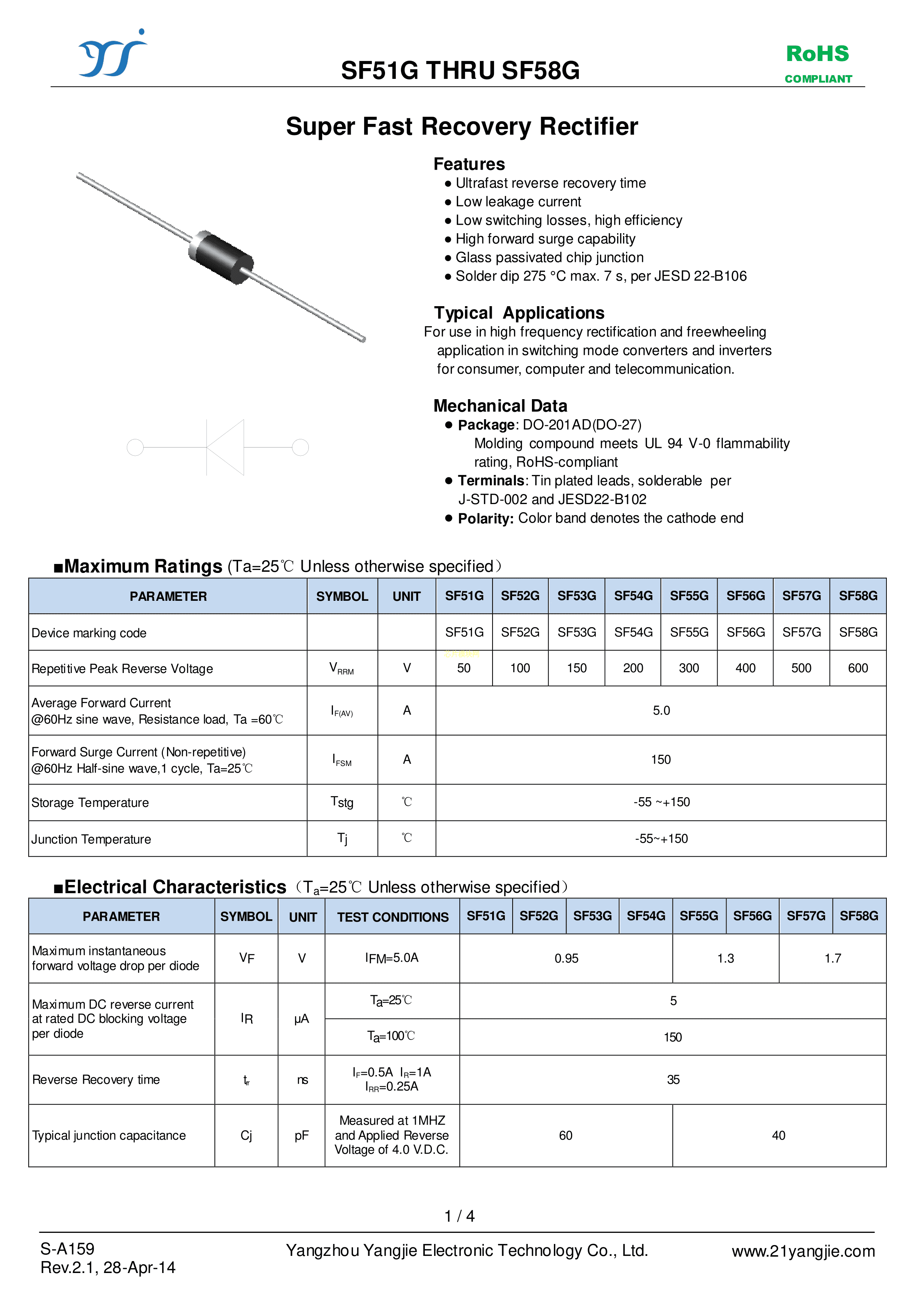 SF56G数据手册DO-27封装YANGJIE(扬杰)PDF规格书,中英文下载