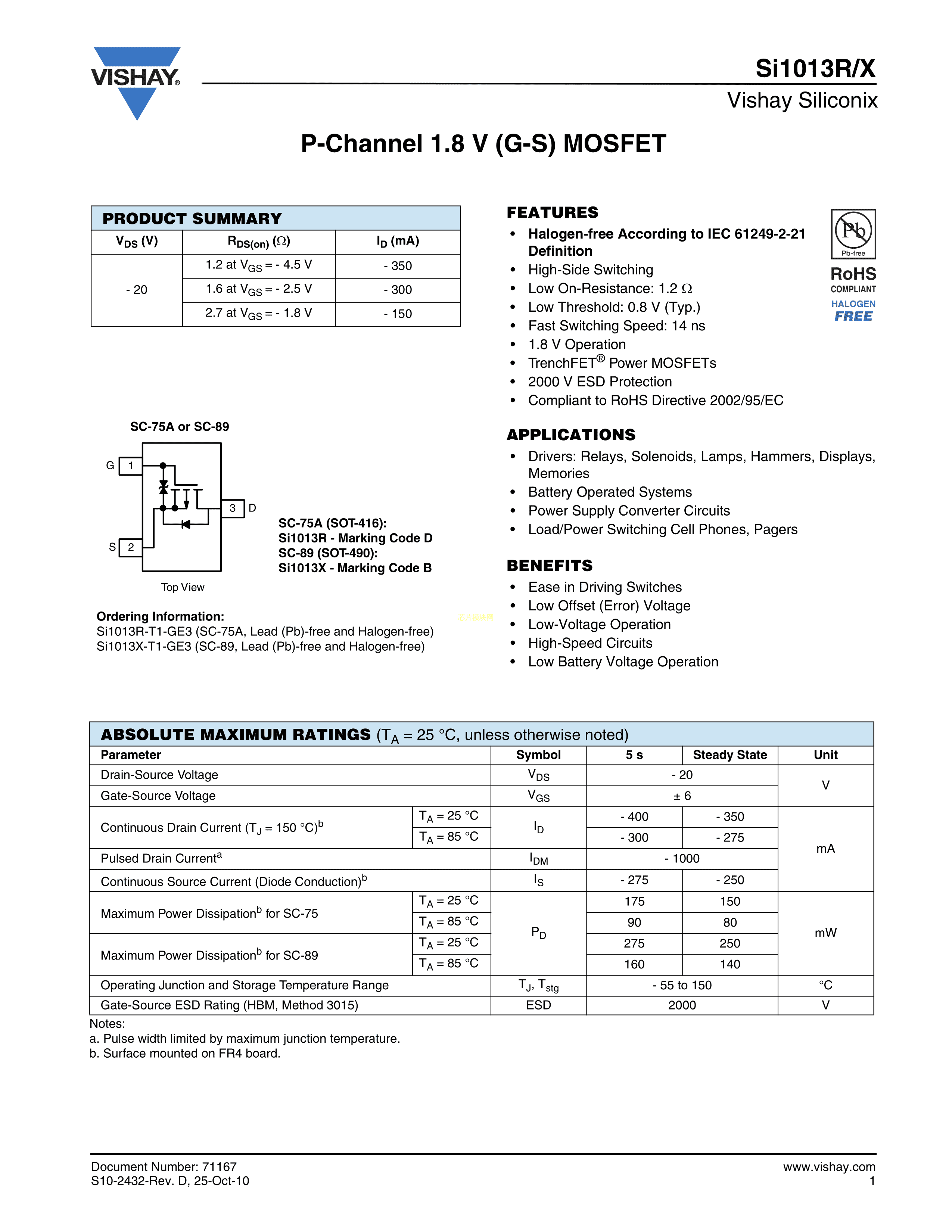 SI1013R-T1-GE3数据手册SC-75A封装VISHAY(威世)PDF规格书,中英文下载
