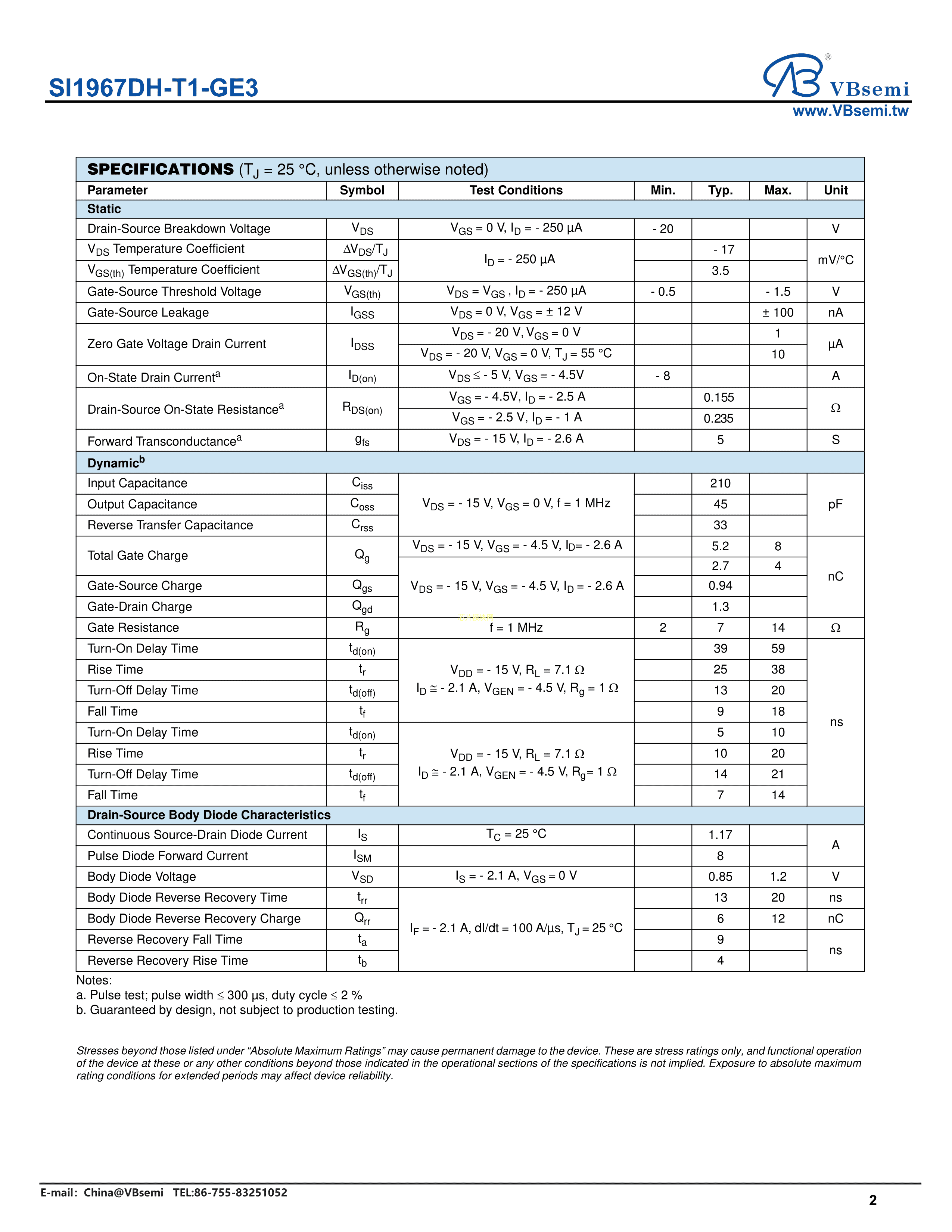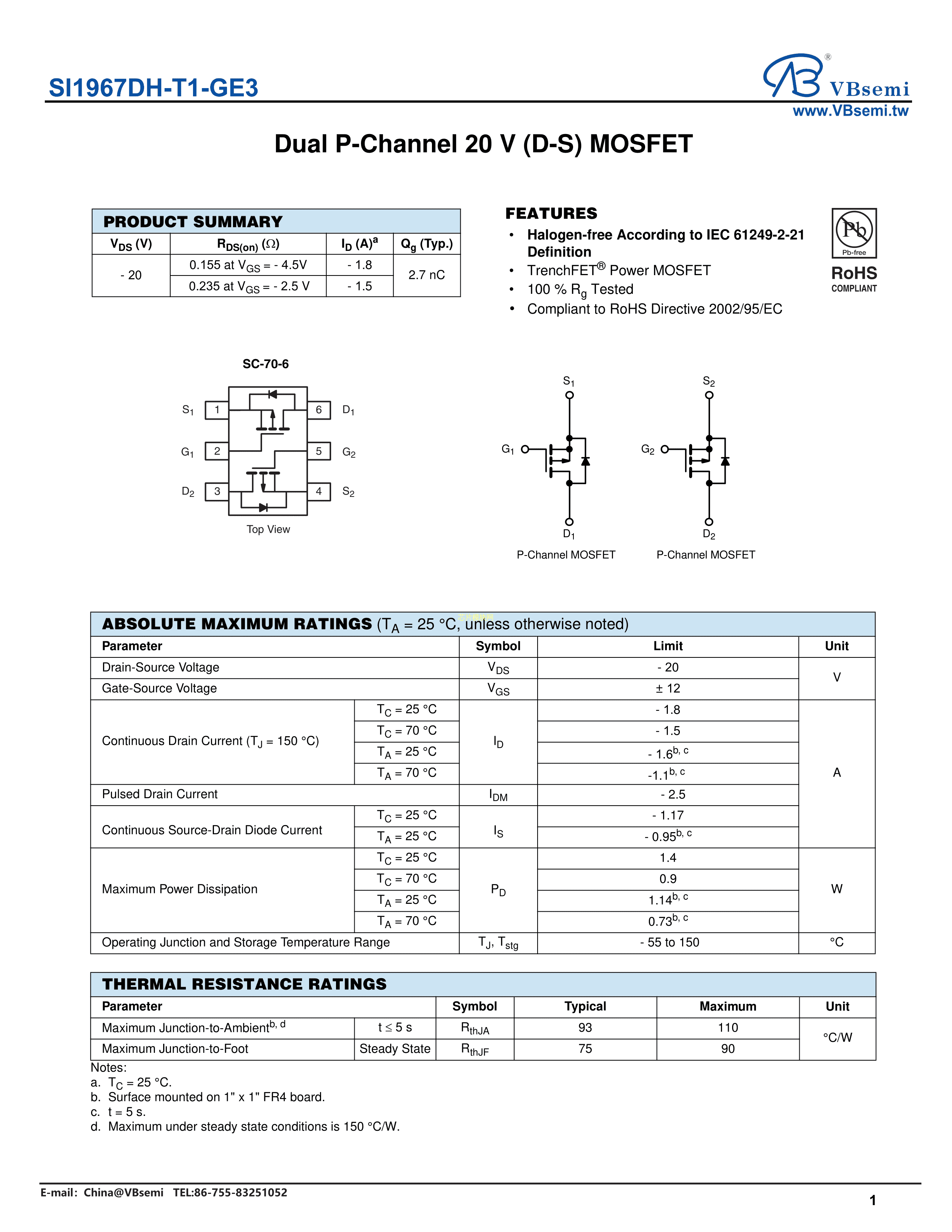 SI1967DH-T1-GE3数据手册SC-70-6封装VBsemi(台湾微碧)PDF规格书,中英文下载