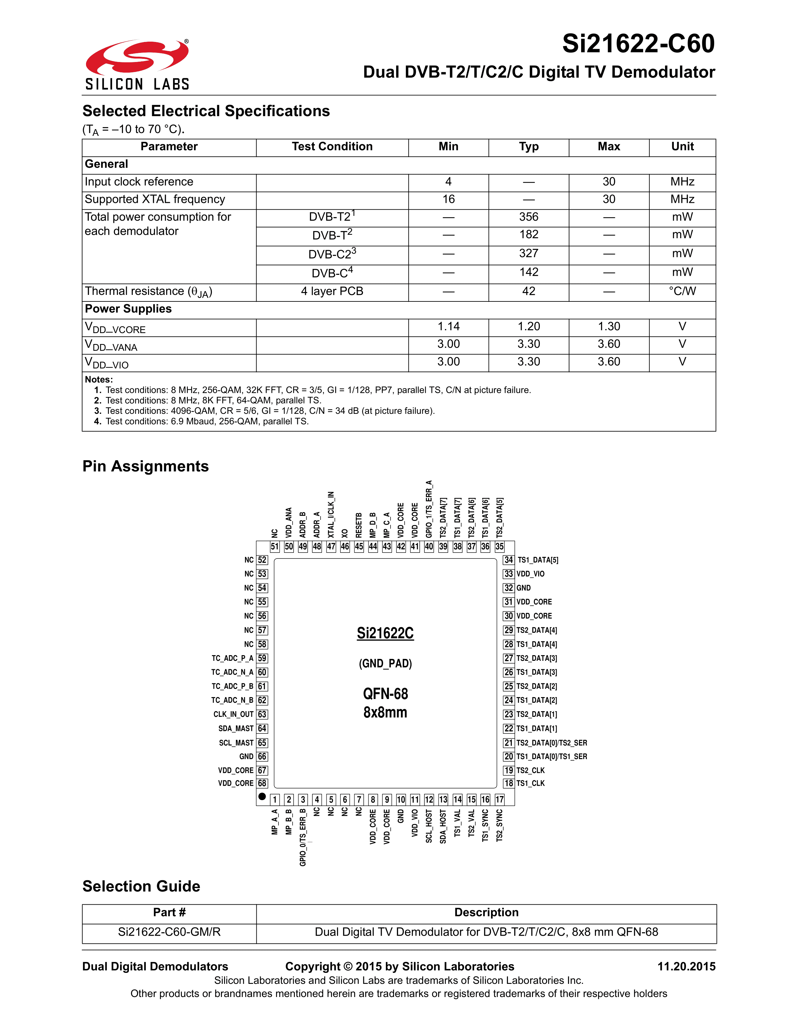 SI21622-C60-GMR数据手册QFN-68(8x8)封装SILICON LABS(芯科)PD