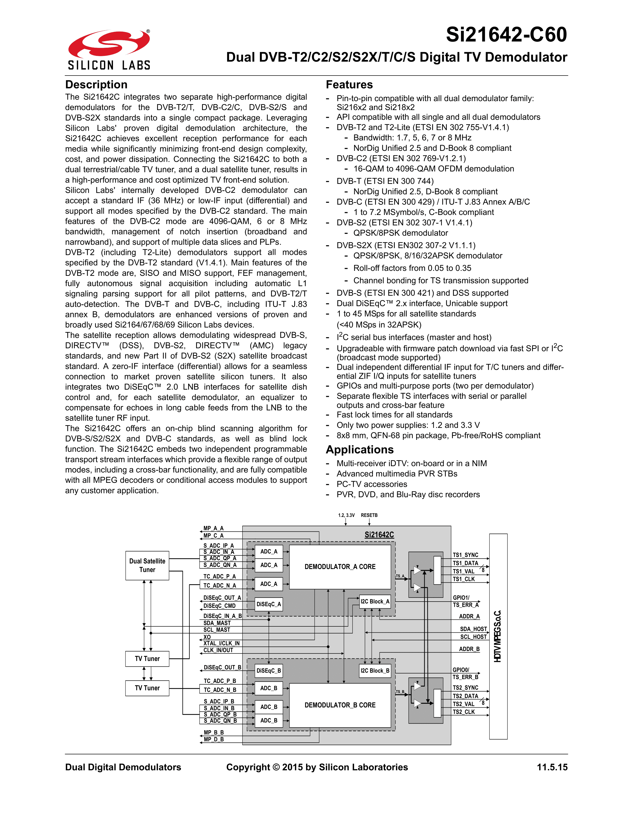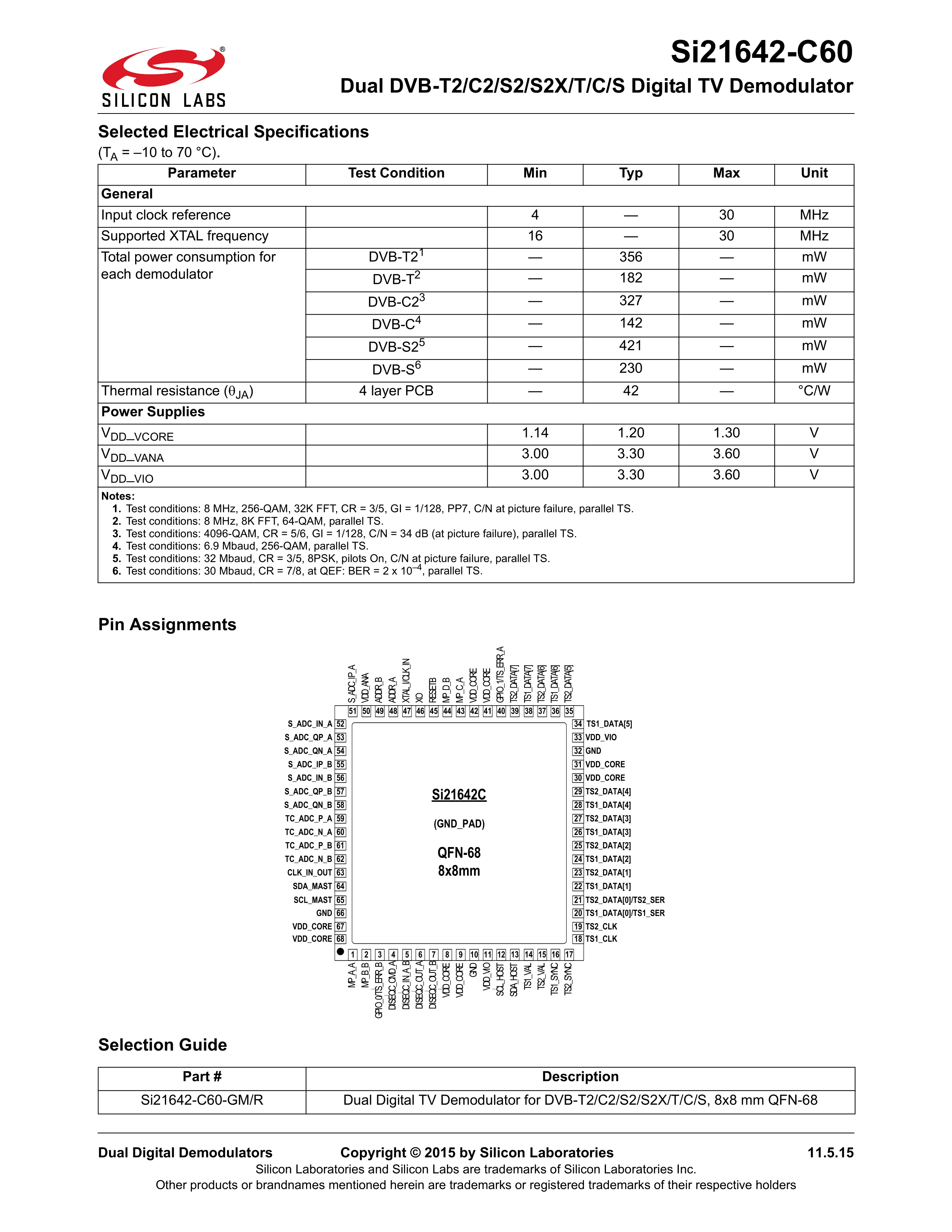 SI21642-C60-GMR数据手册QFN-68(8x8)封装SILICON LABS(芯科)PD