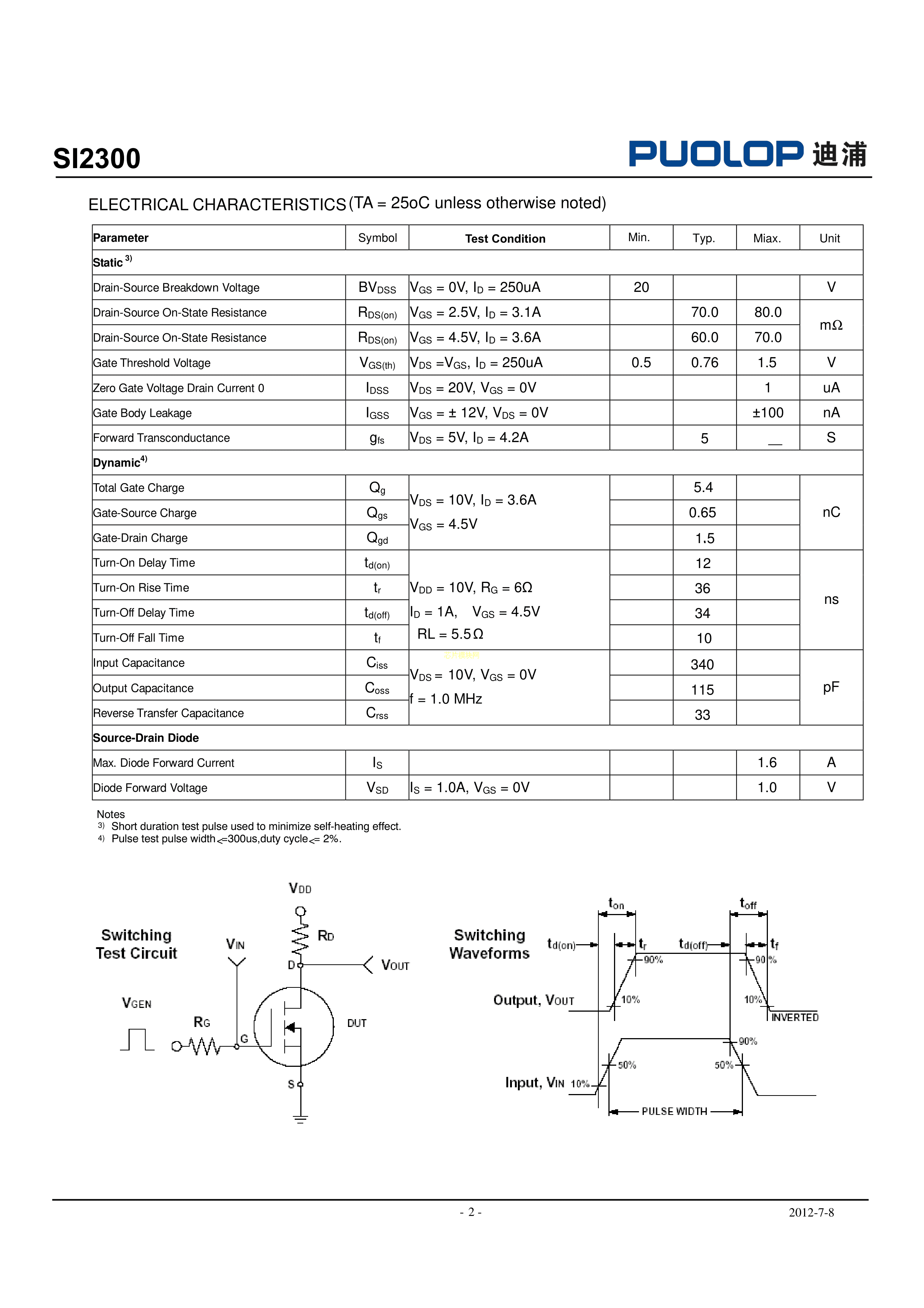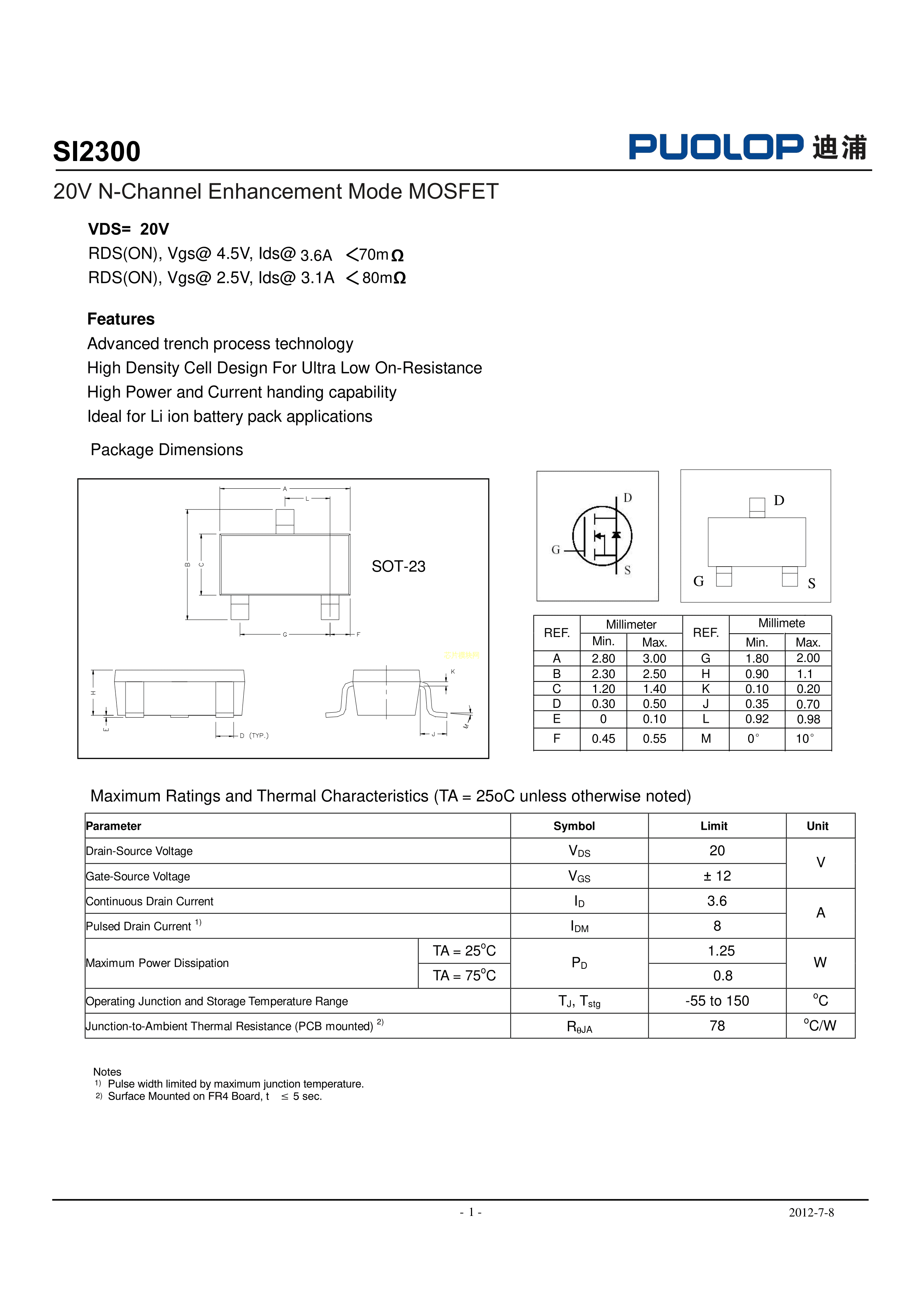 SI2300数据手册SOT-23封装PUOLOP(迪浦)PDF规格书,中英文下载