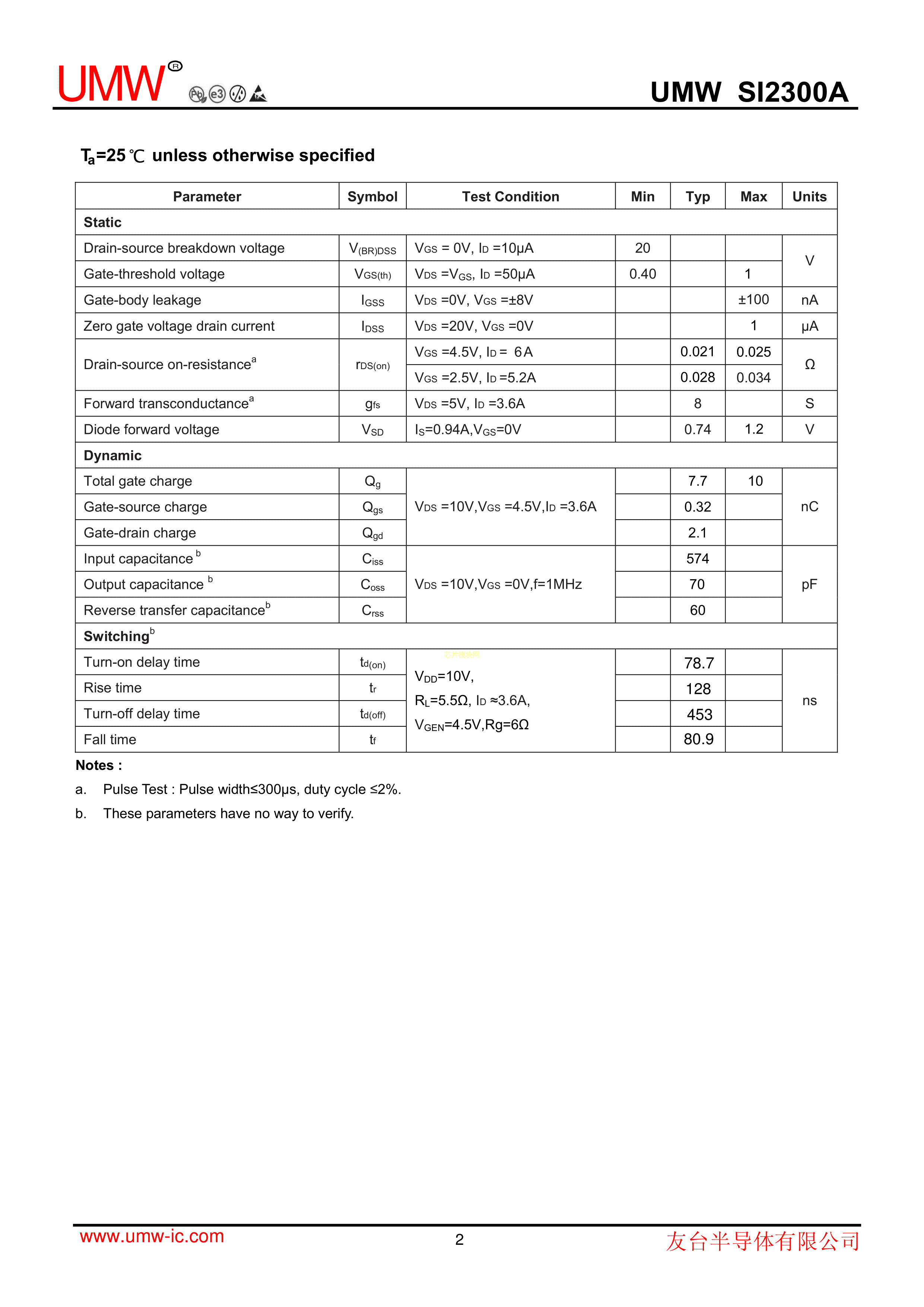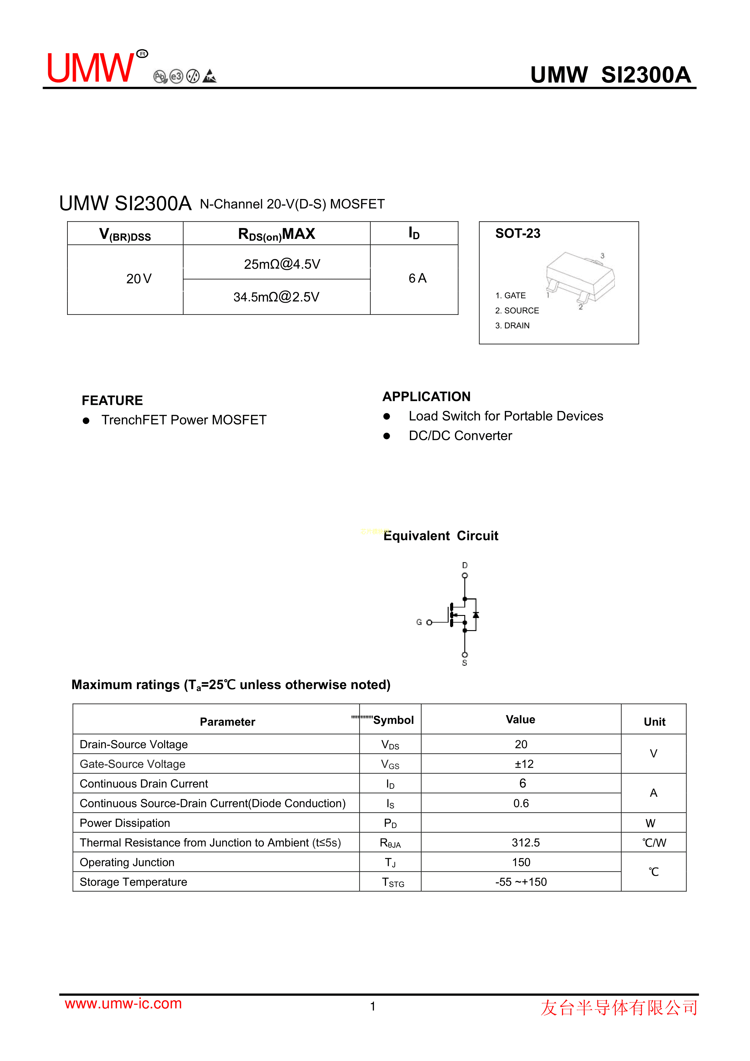 SI2300A数据手册SOT-23封装UMW(友台半导体)PDF规格书,中英文下载