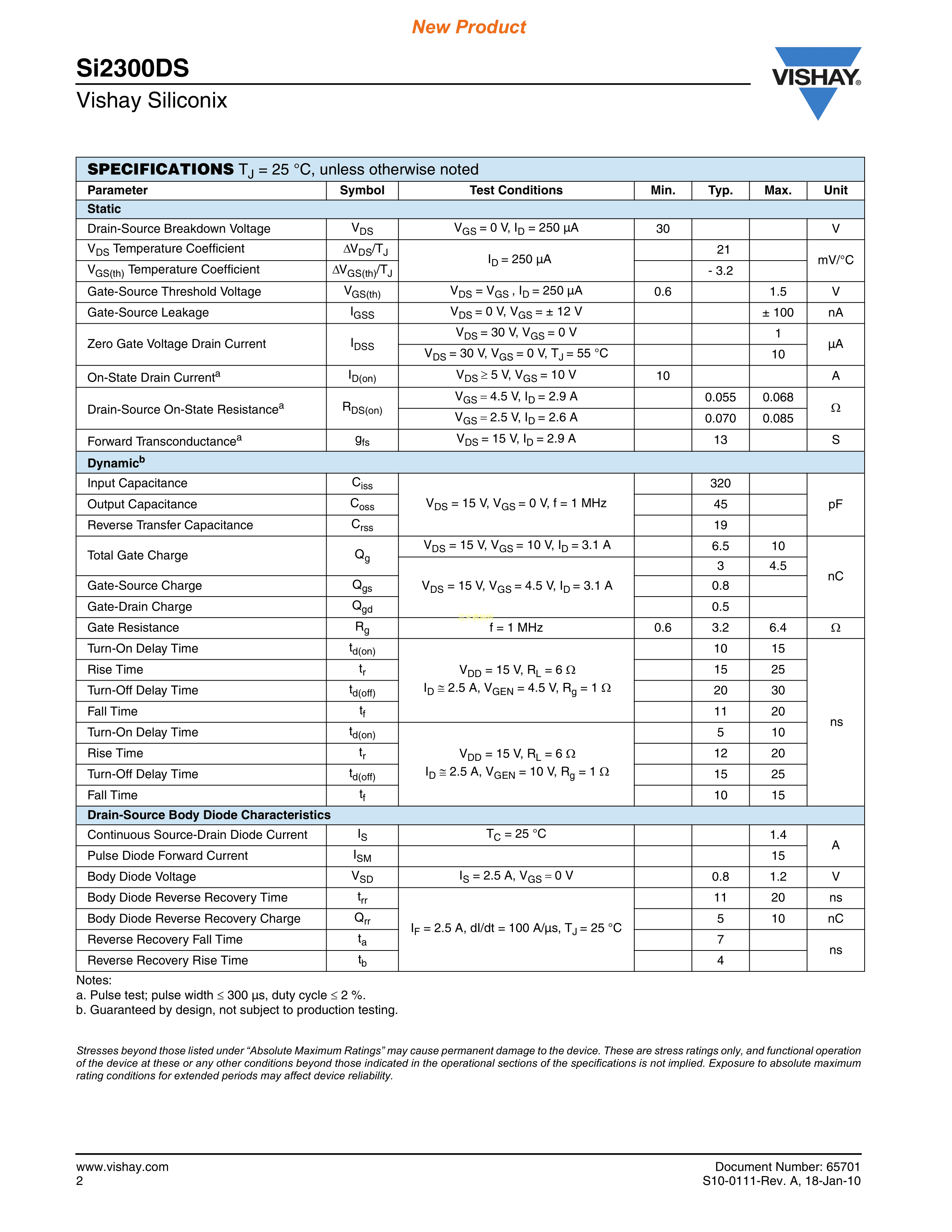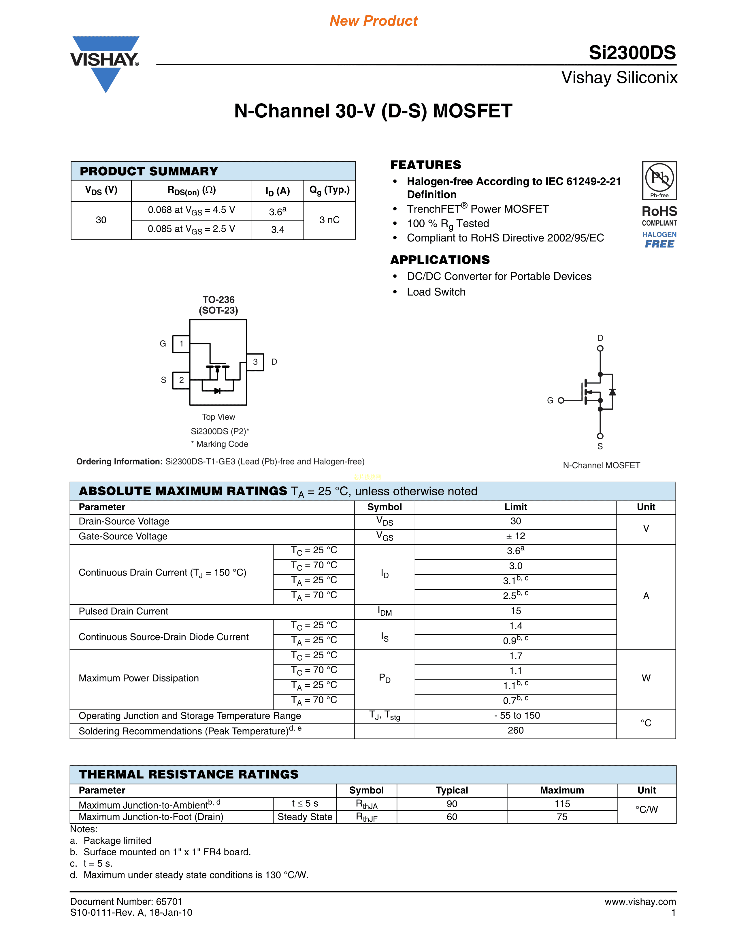 SI2300DS-T1-GE3数据手册SOT-23(SOT-23-3)封装VISHAY(威世)PDF规格书,中英文下载