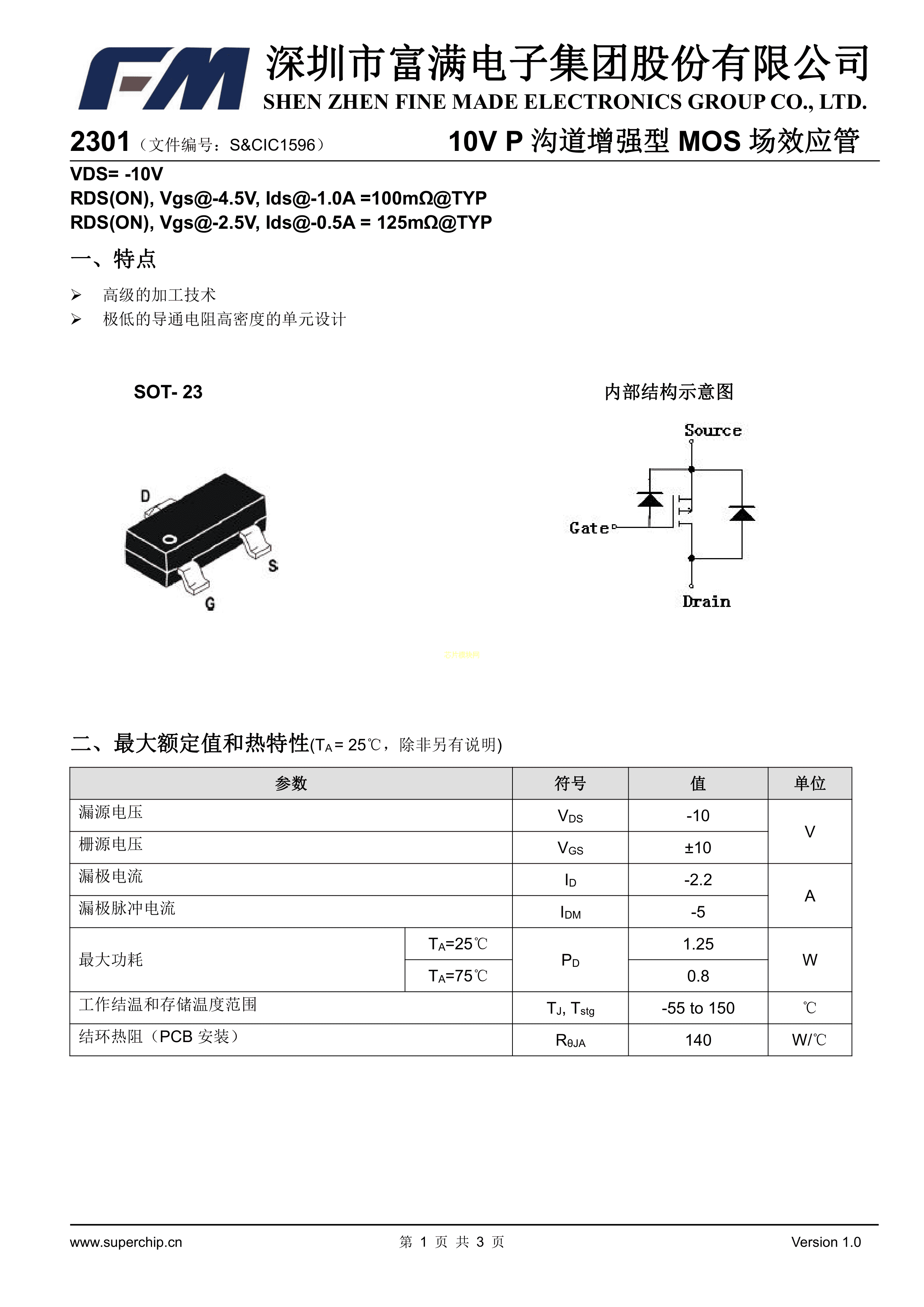 SI2301数据手册SOT-23(SOT-23-3)封装FM(富满)PDF规格书,中英文下载