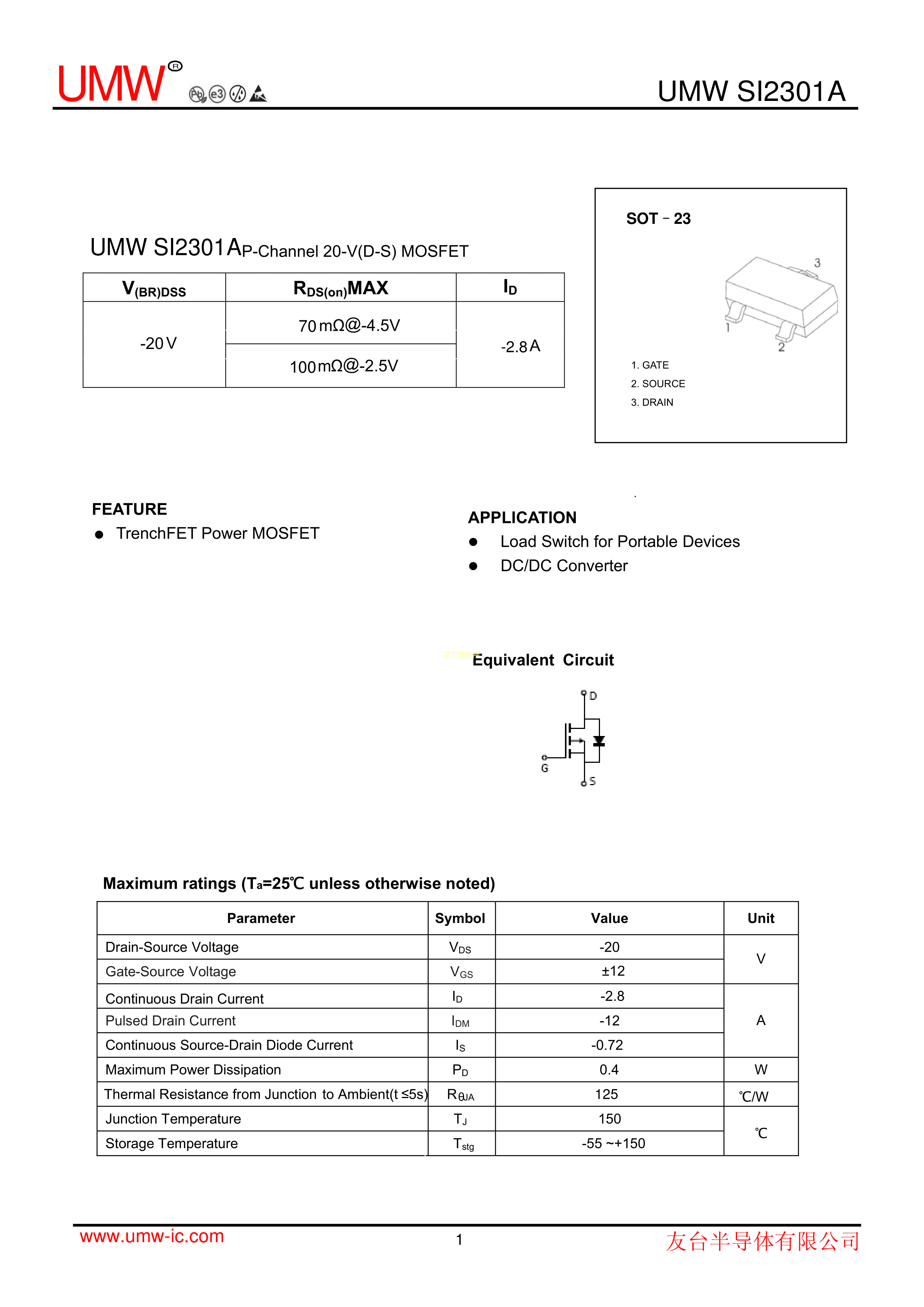 SI2301A数据手册SOT-23封装UMW(友台半导体)PDF规格书,中英文下载