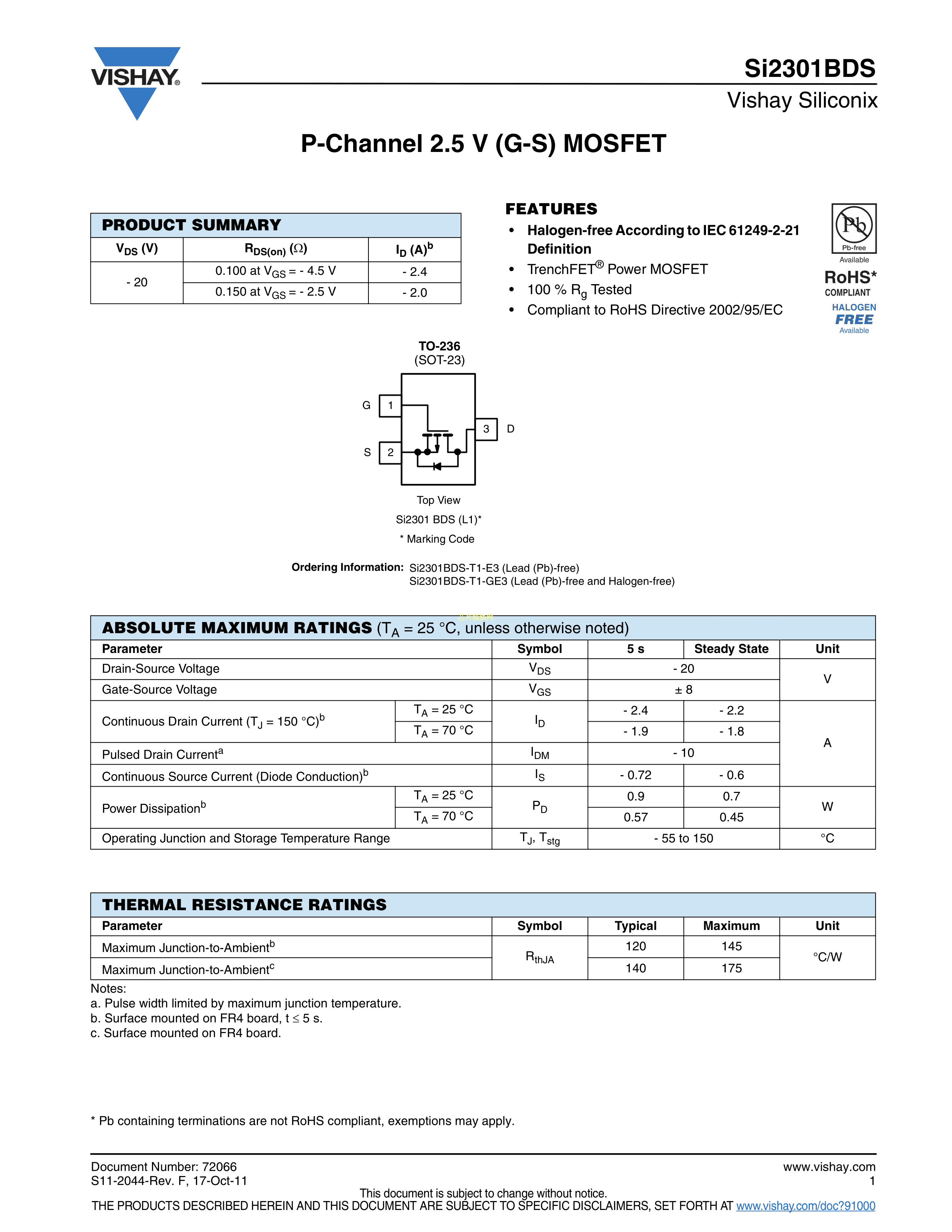 SI2301BDS-T1-GE3数据手册SOT-23-3封装VISHAY(威世)PDF规格书,中英文下载