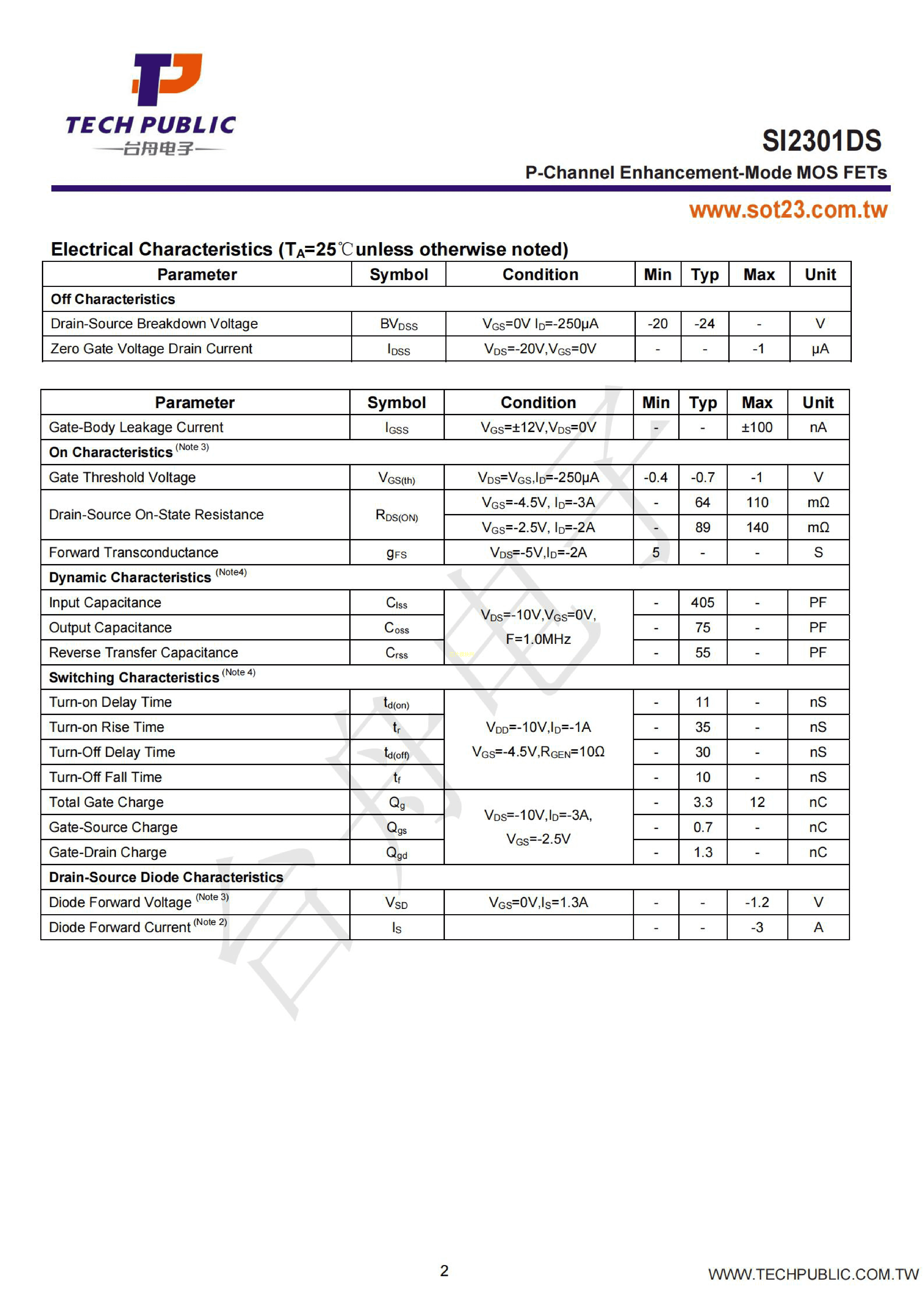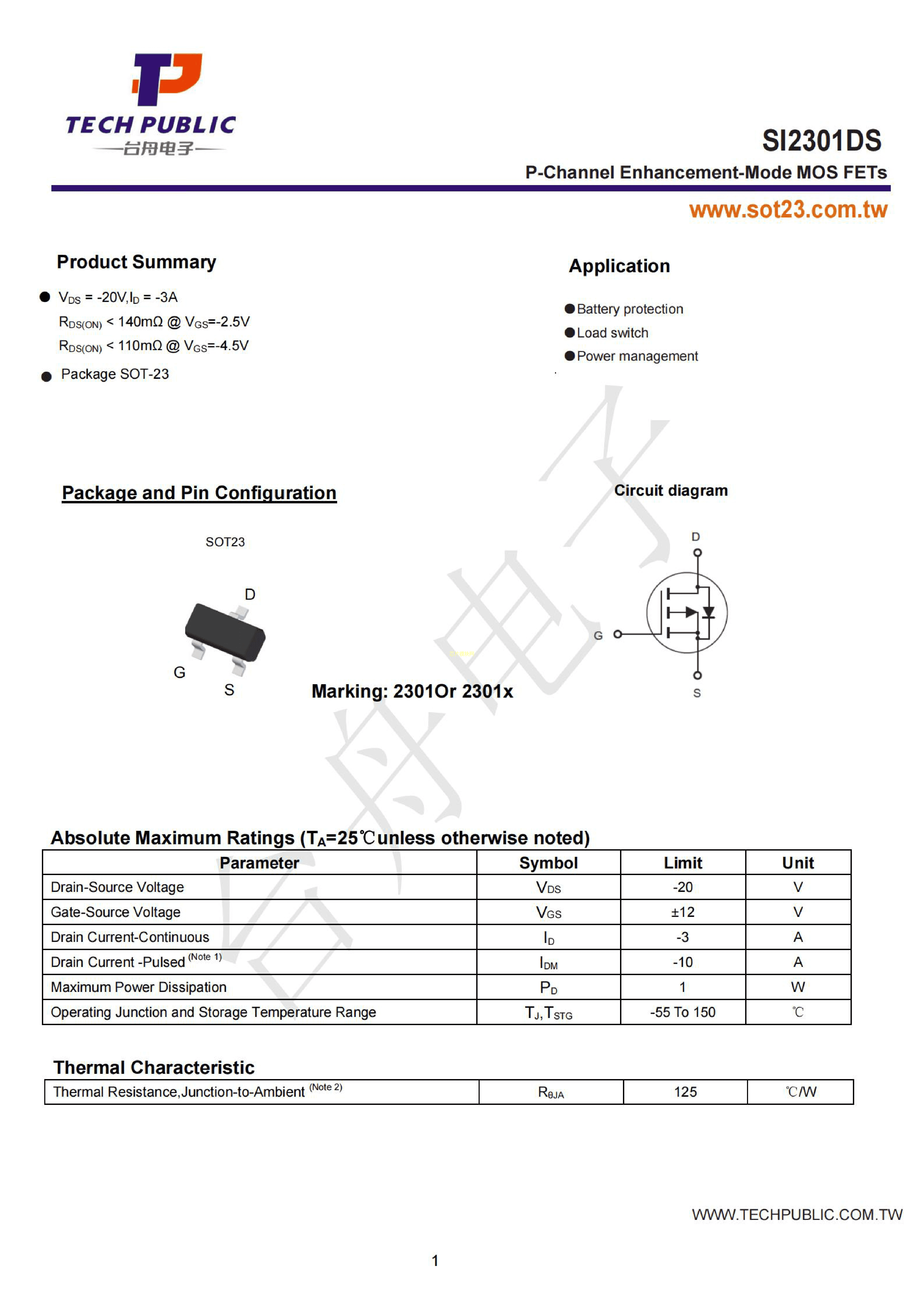 SI2301DS数据手册SOT-23-3封装TECH PUBLIC(台舟)PDF规格书,中英文下载