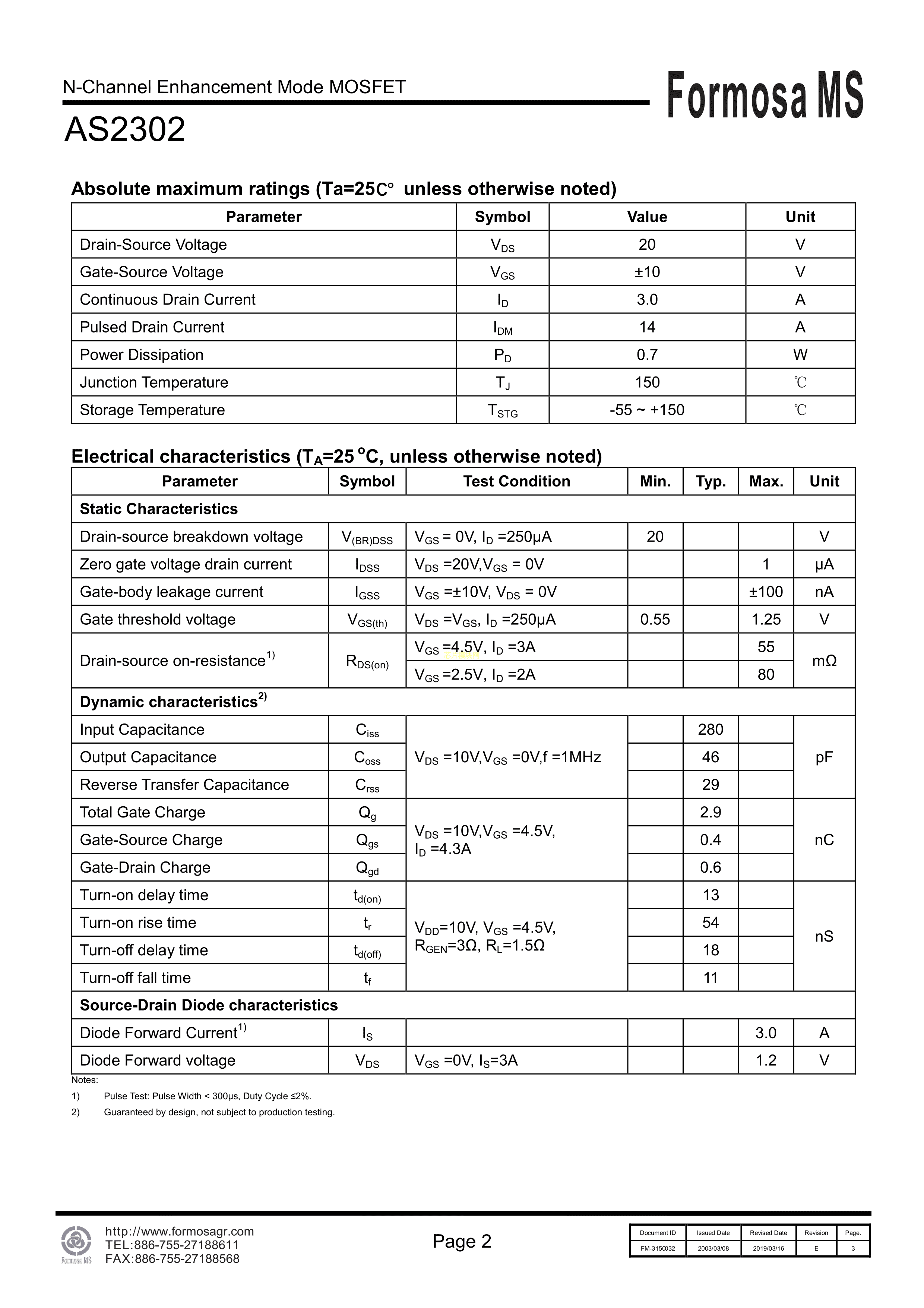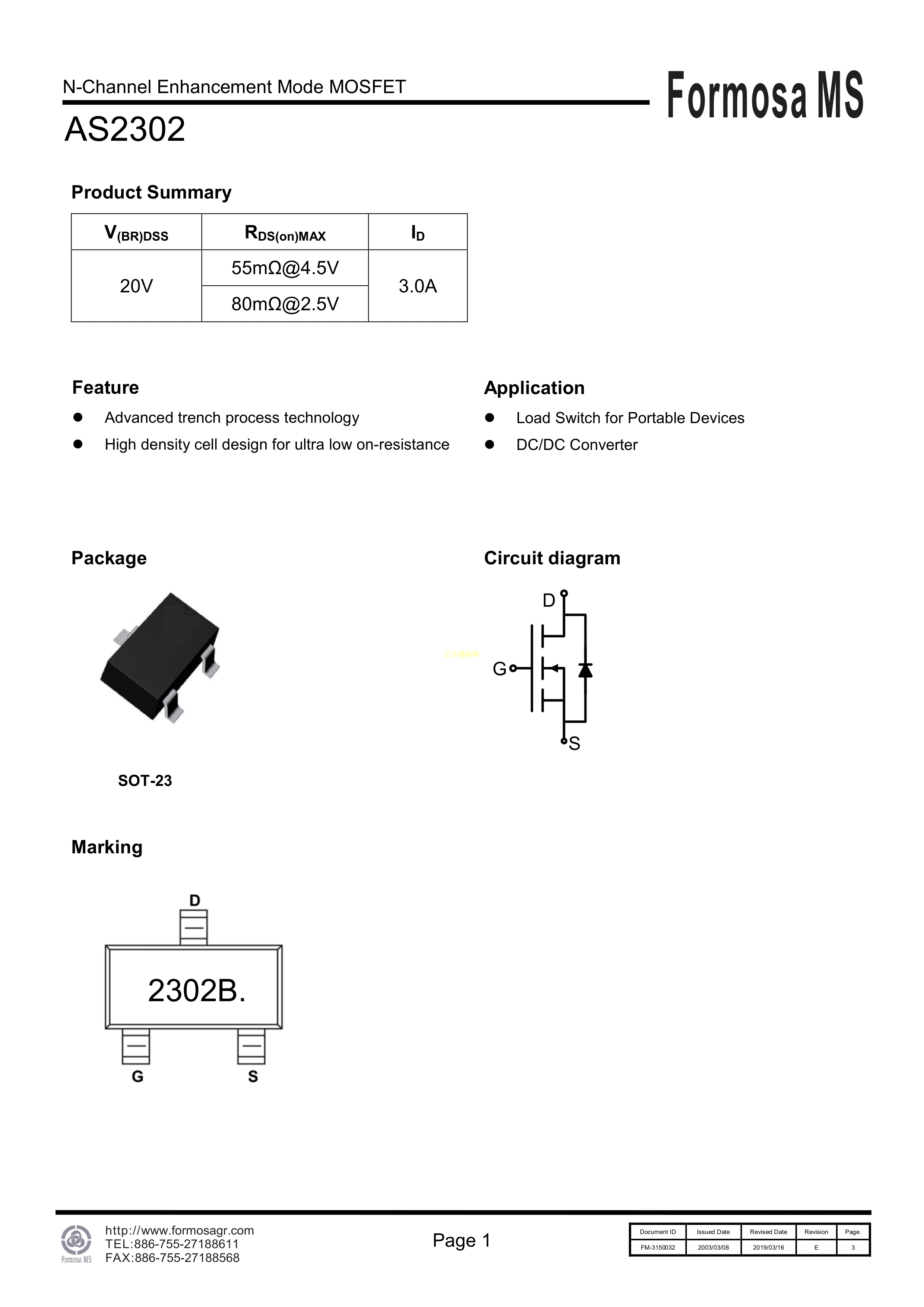 SI2302数据手册SOT-23(SOT-23-3)封装FMS(台湾美丽微)PDF规格书,中英文下载