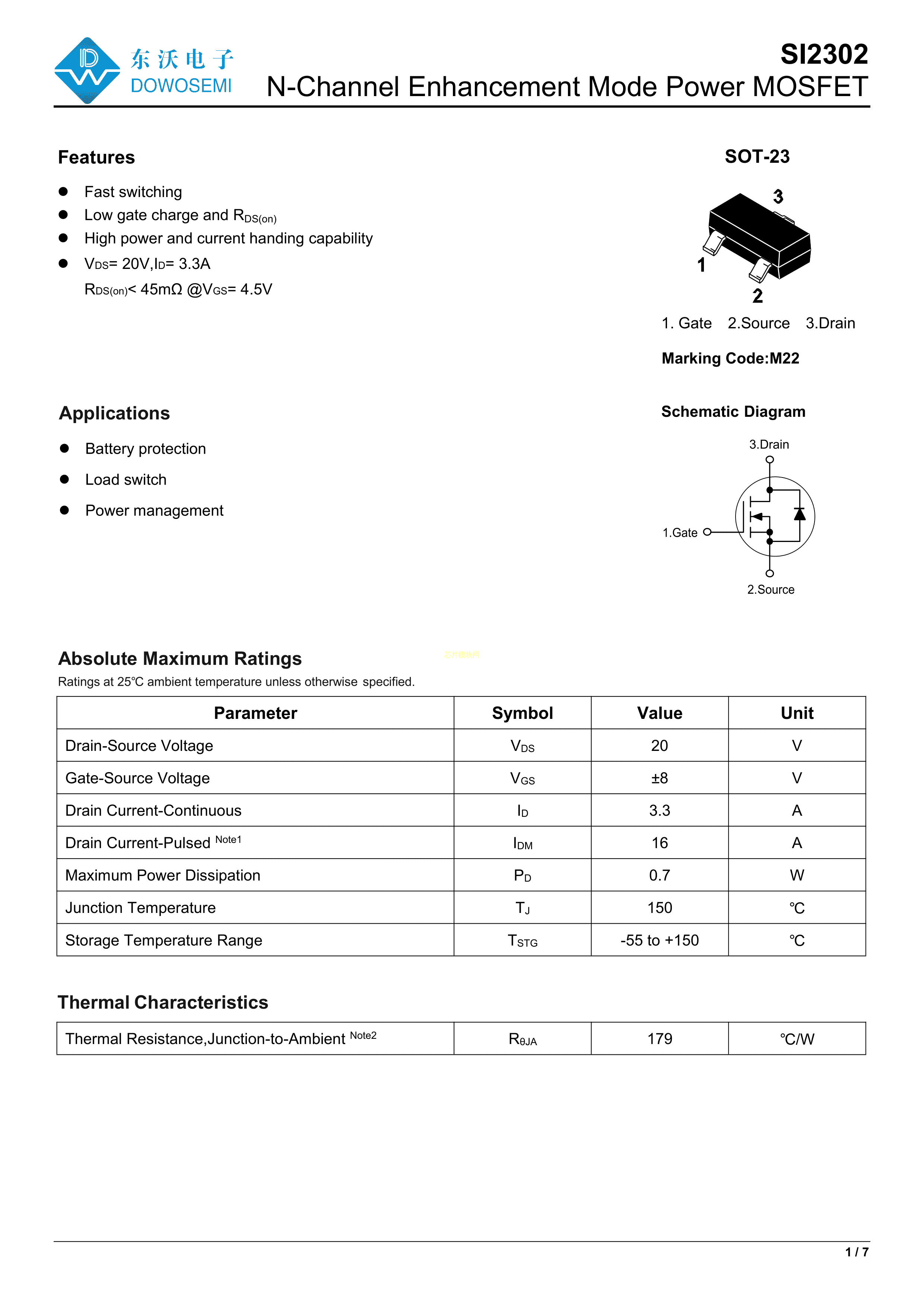 SI2302数据手册SOT-23封装DOWO(东沃)PDF规格书,中英文下载