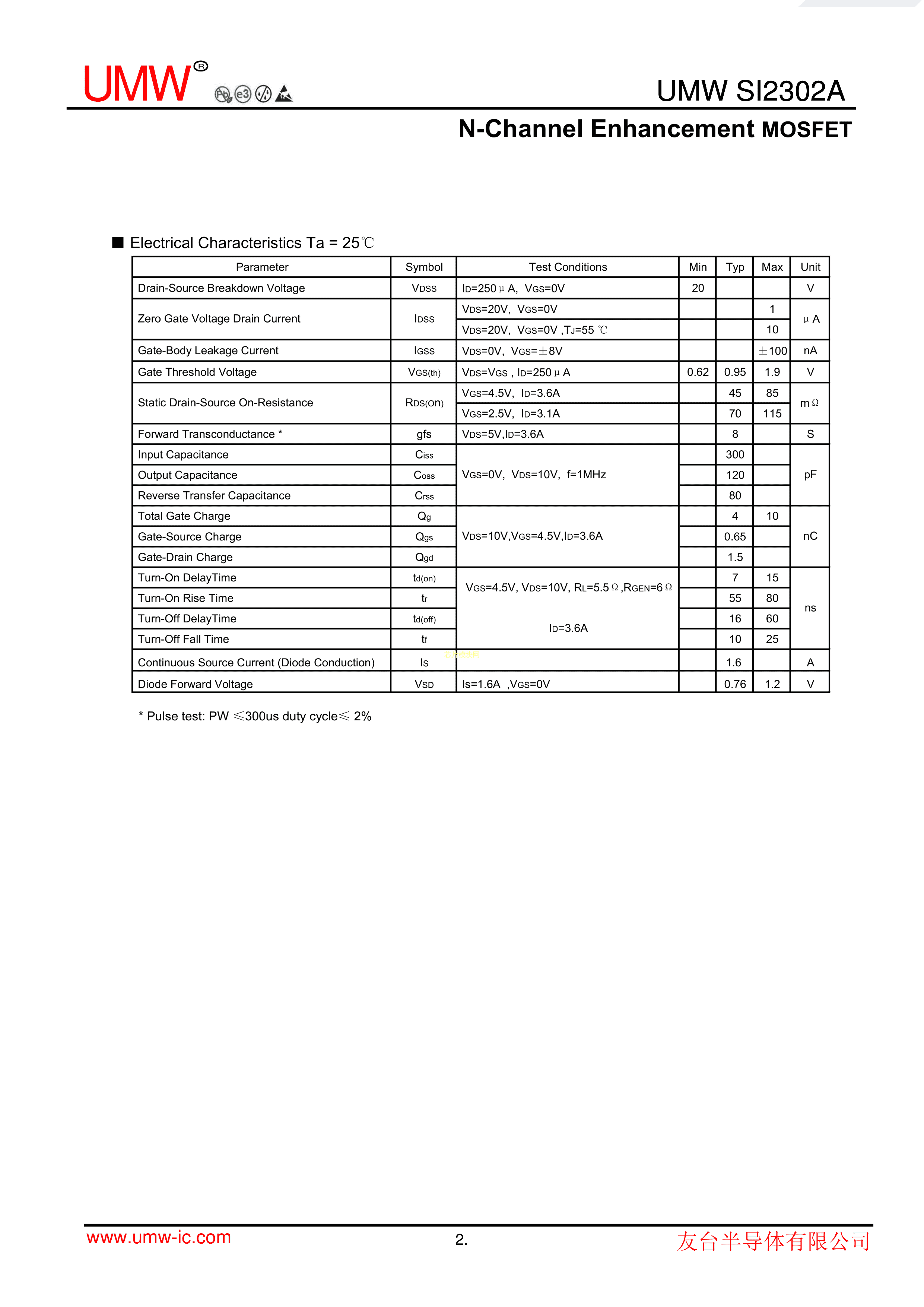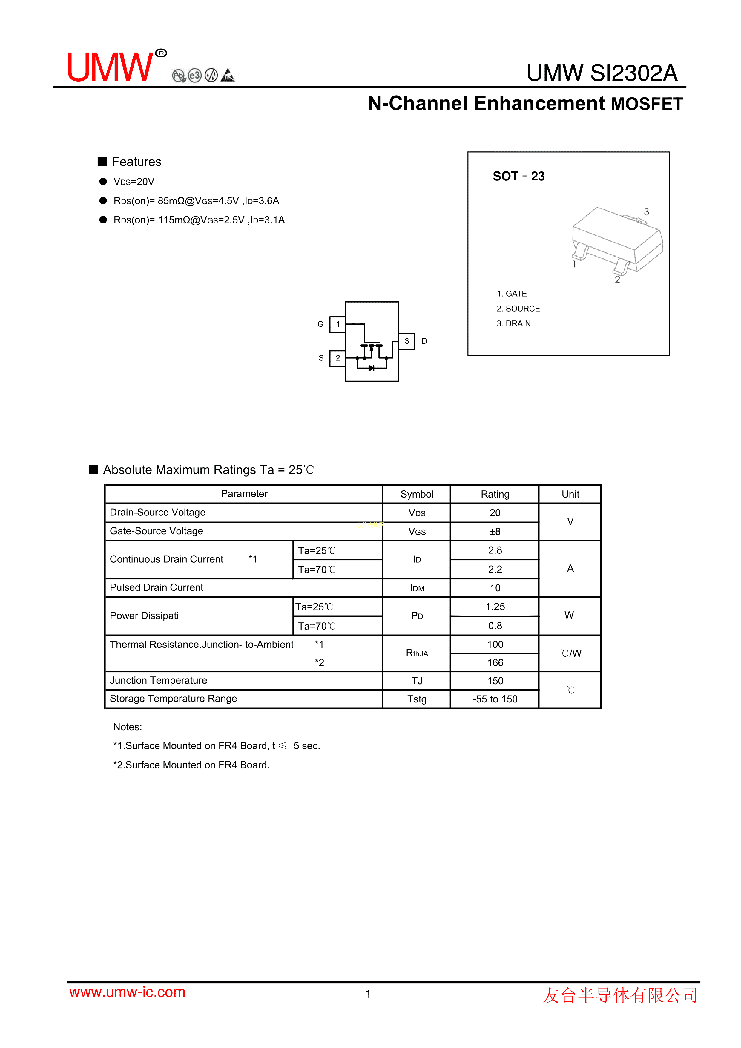 SI2302A数据手册SOT-23封装UMW(友台半导体)PDF规格书,中英文下载