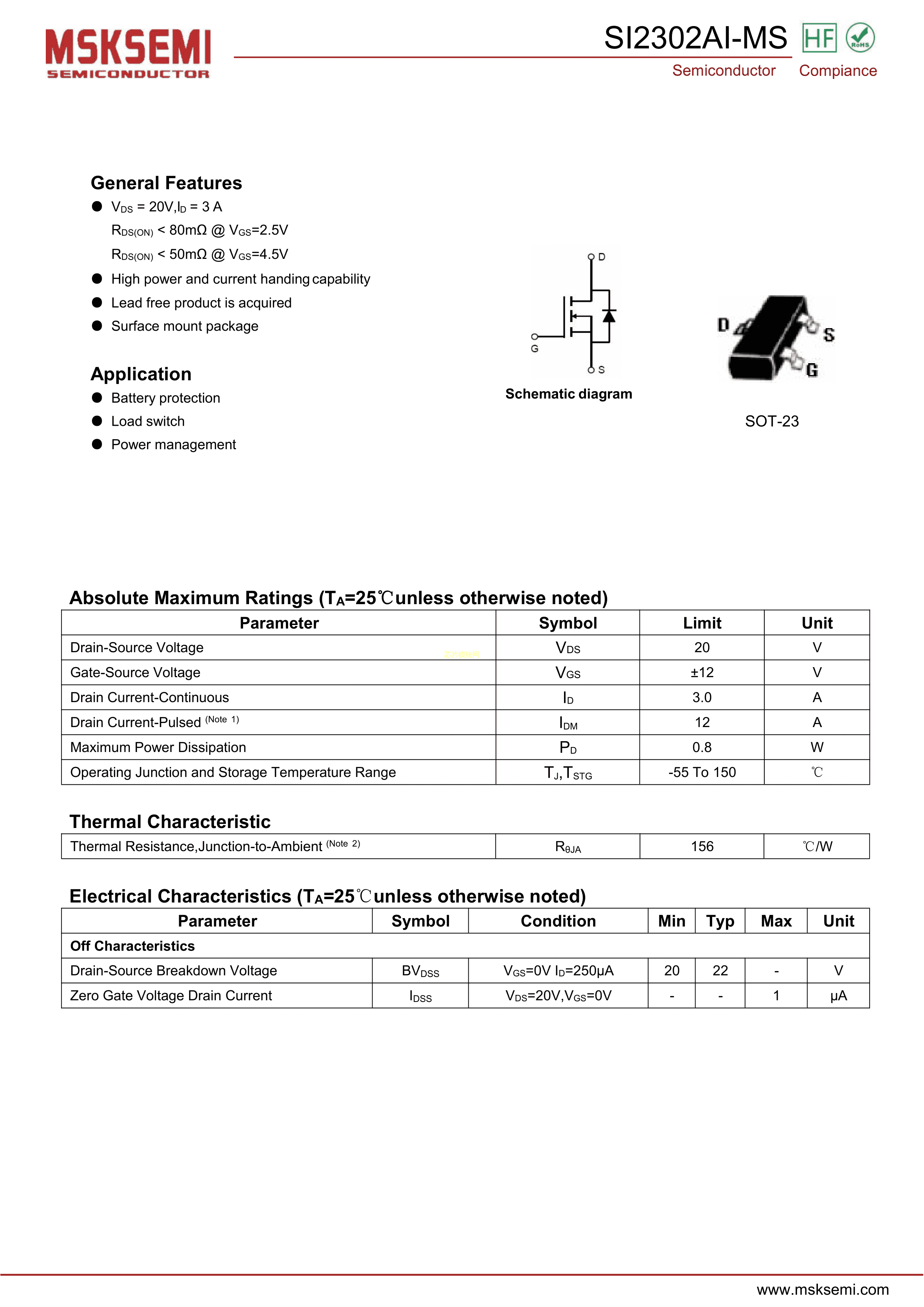 SI2302AI-MS数据手册SOT-23封装MSKSEMI(美森科)PDF规格书,中英文下载