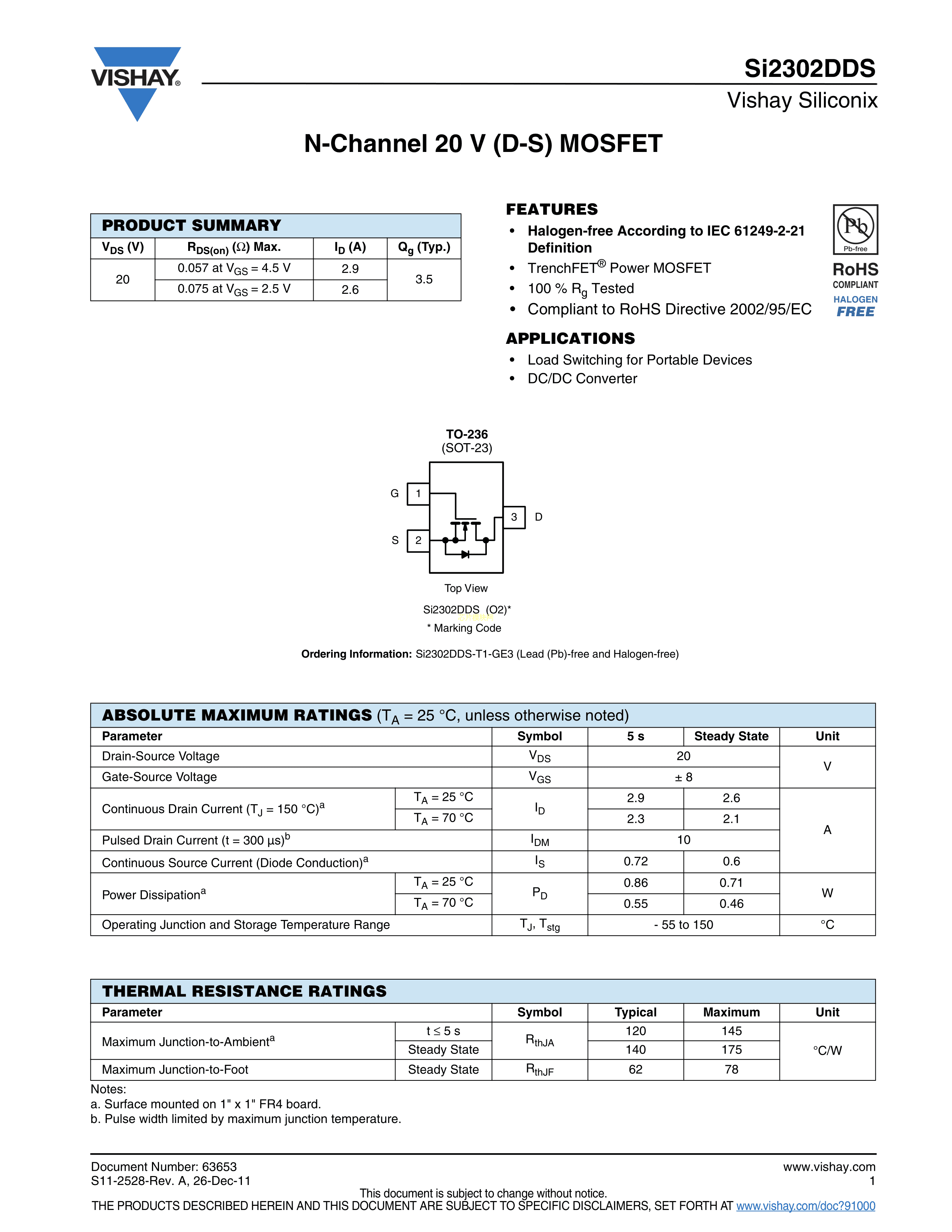 SI2302DDS-T1-GE3数据手册SOT-23(SOT-23-3)封装VISHAY(威世)PD