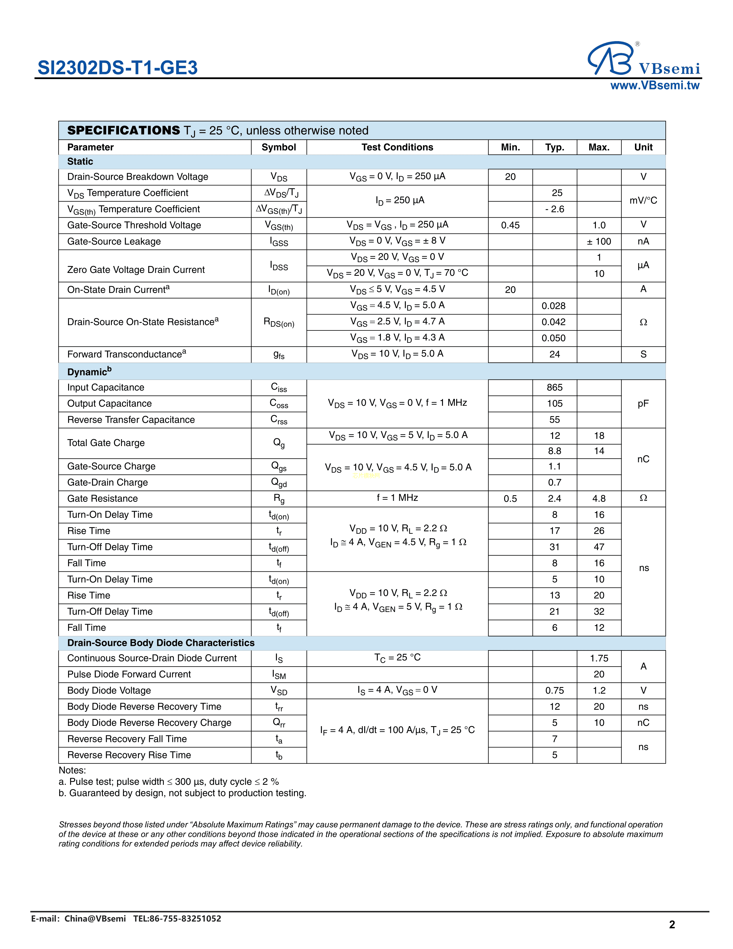 SI2302DS-T1-GE3数据手册SOT-23-3封装VBsemi(台湾微碧)PDF规格书,中英