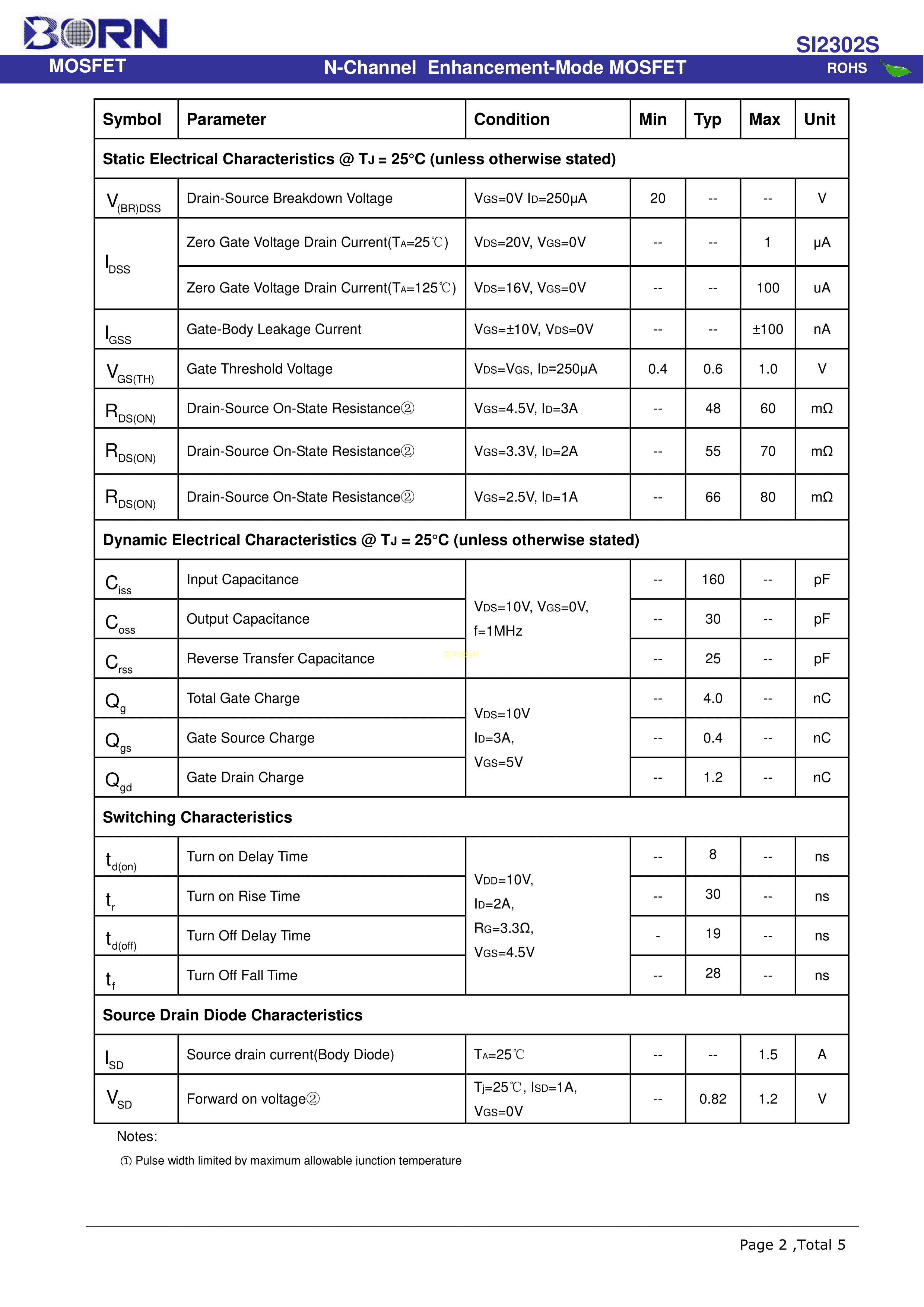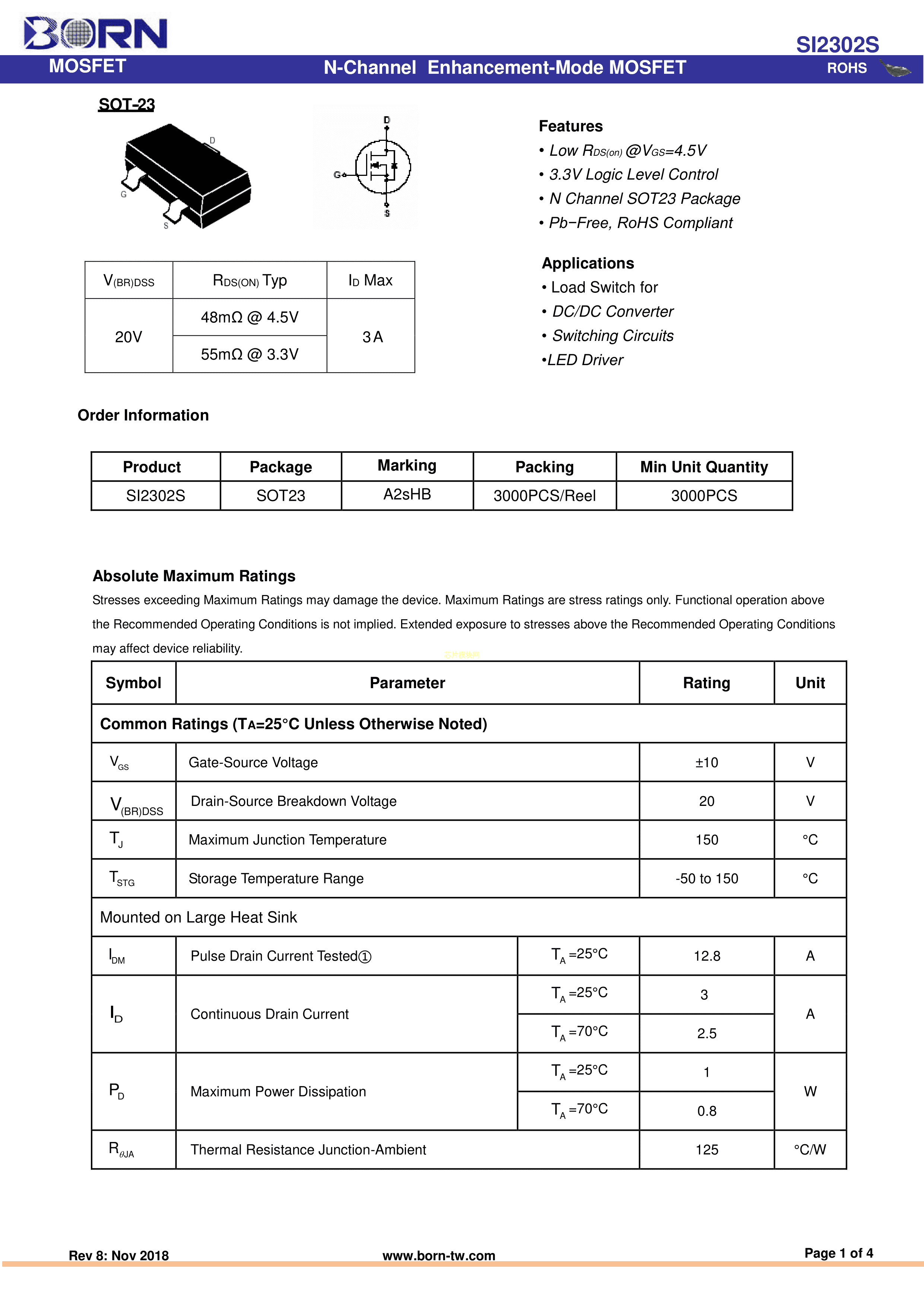 SI2302S数据手册SOT-23封装BORN(伯恩半导体)PDF规格书,中英文下载