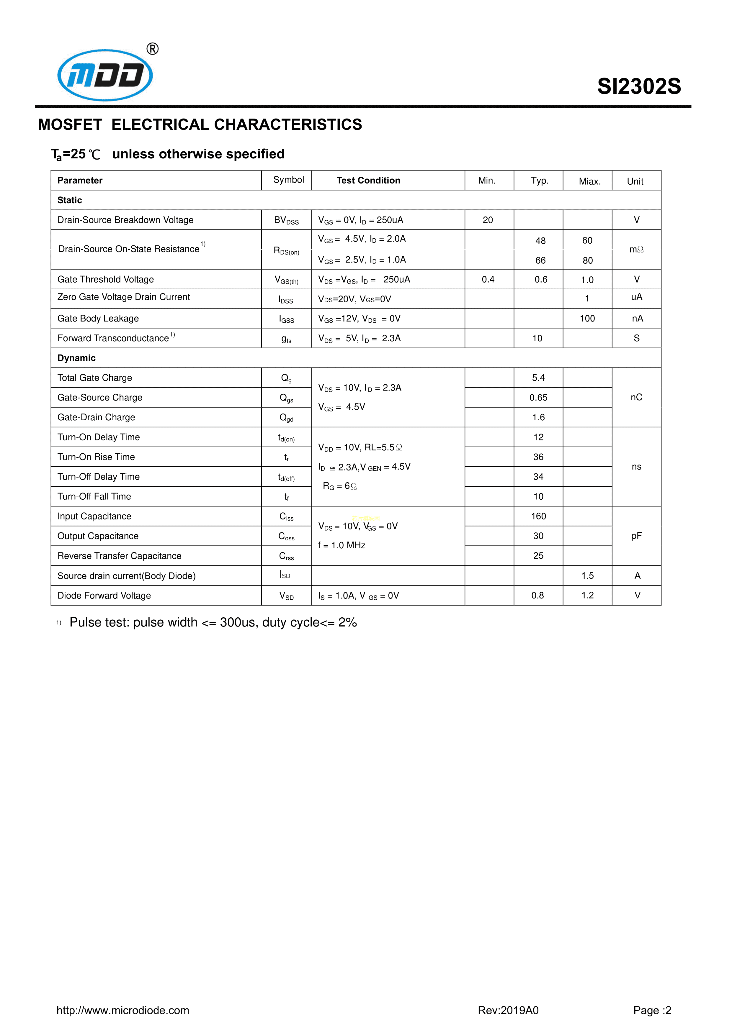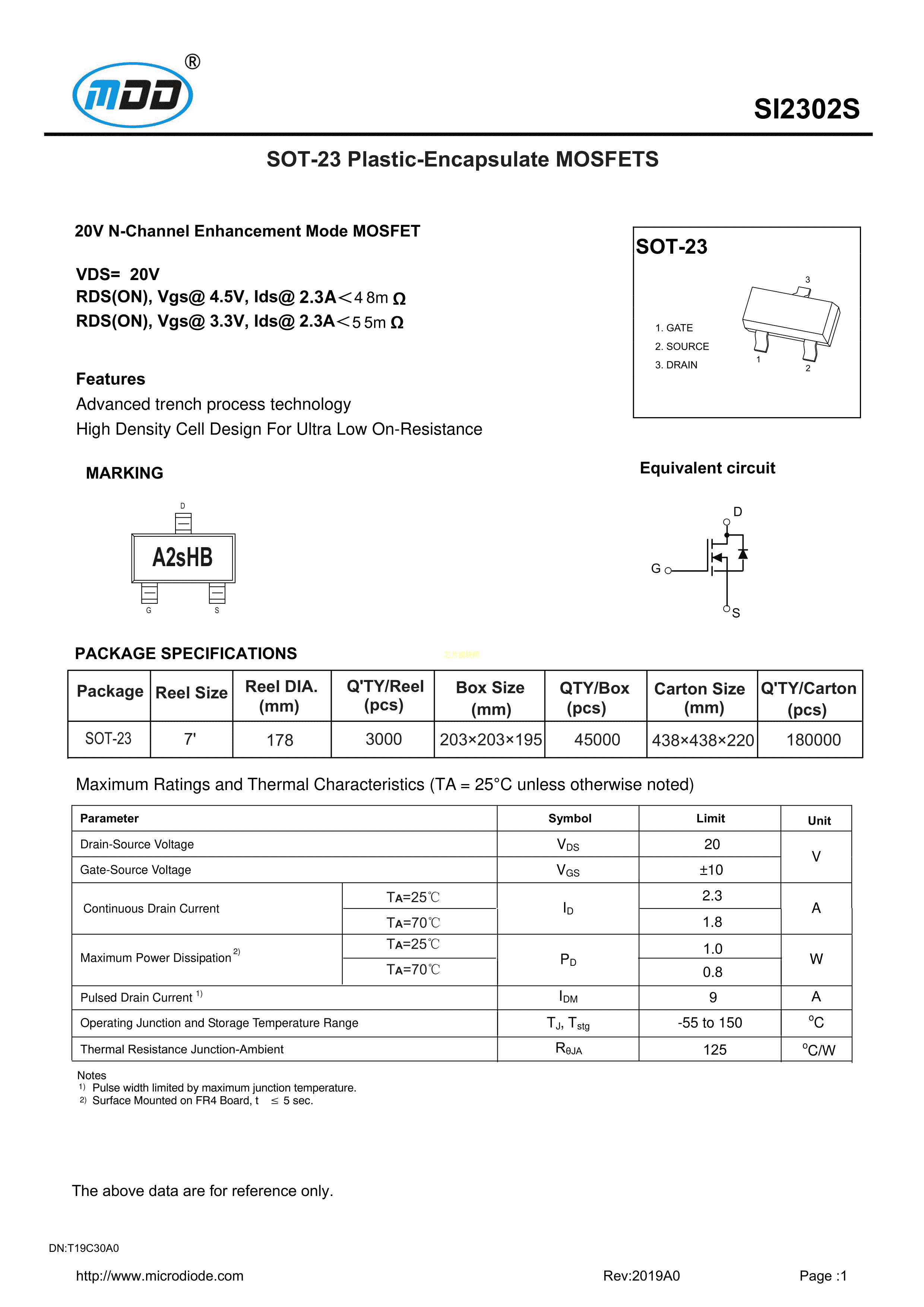 SI2302S数据手册SOT-23封装MDDPDF规格书,中英文下载
