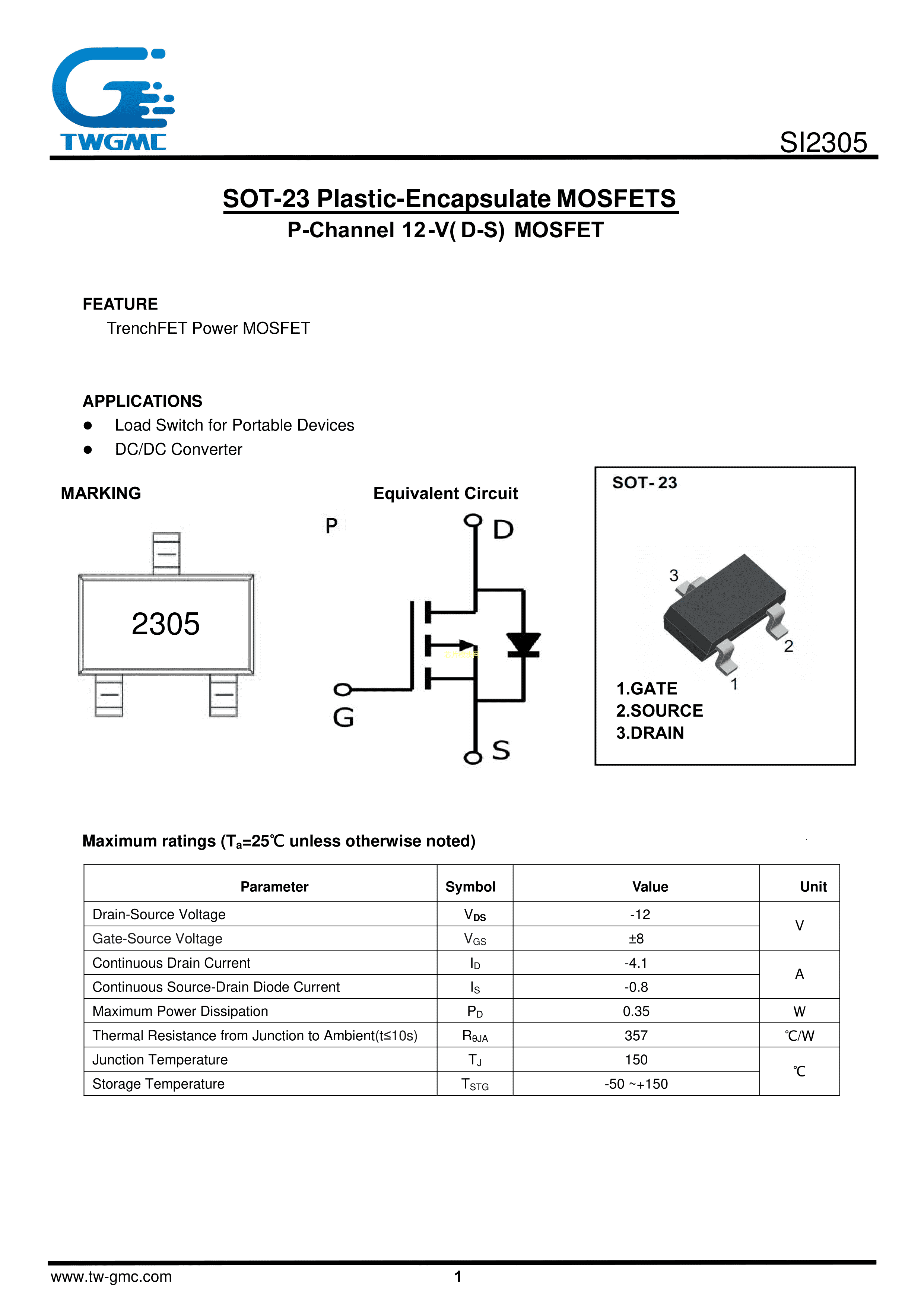 SI2305数据手册SOT-23封装TWGMC(台湾迪嘉)PDF规格书,中英文下载