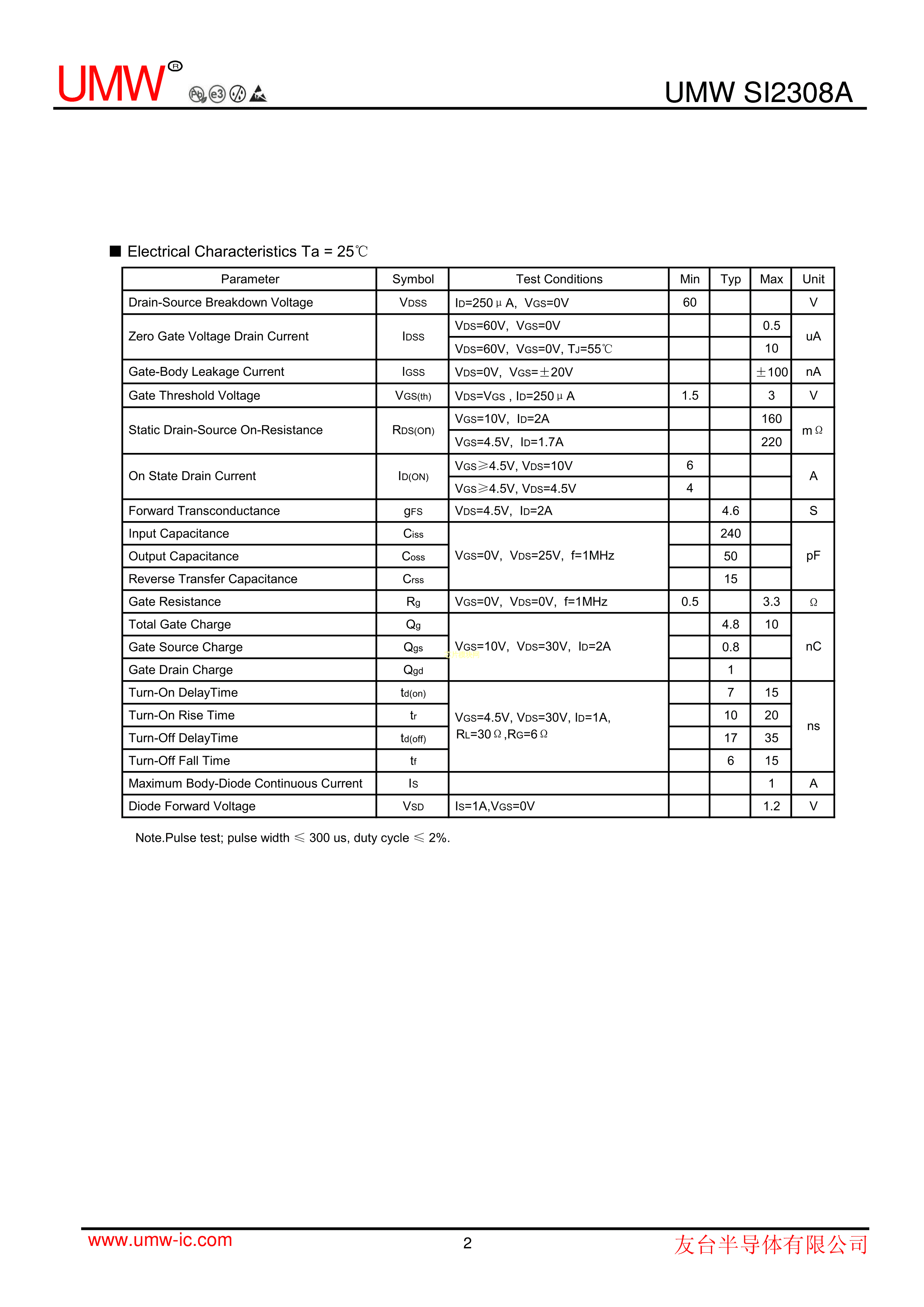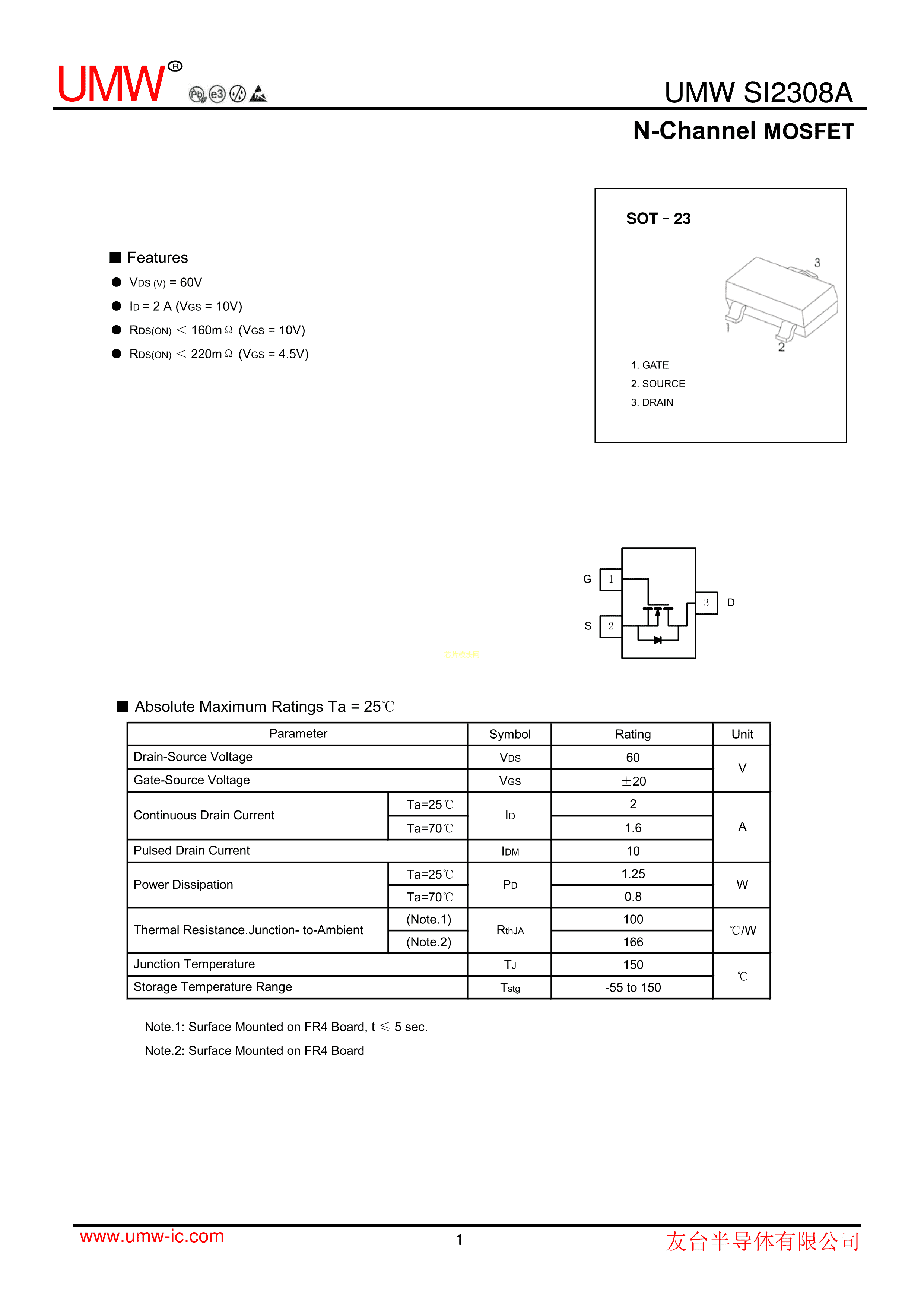SI2308A数据手册SOT-23封装UMW(友台半导体)PDF规格书,中英文下载