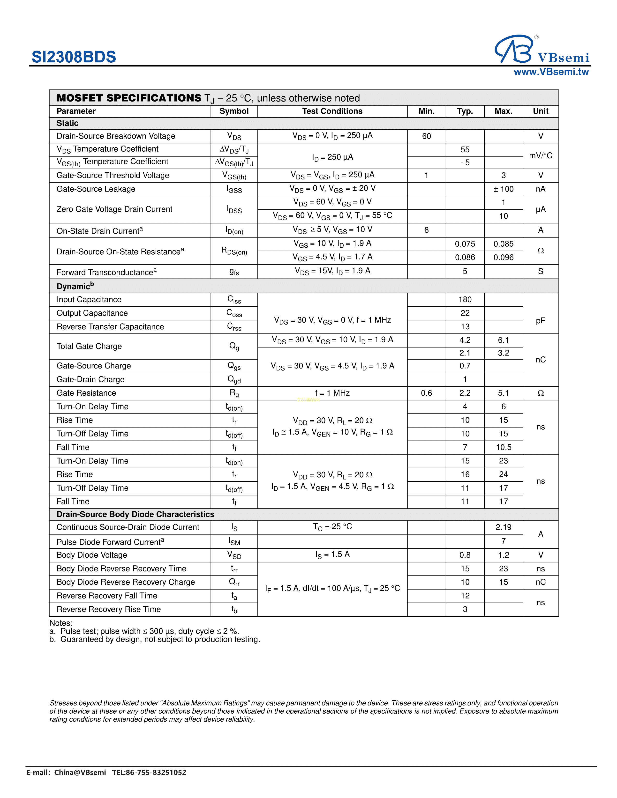 SI2308BDS数据手册SOT-23-3封装VBsemi(台湾微碧)PDF规格书,中英文下载