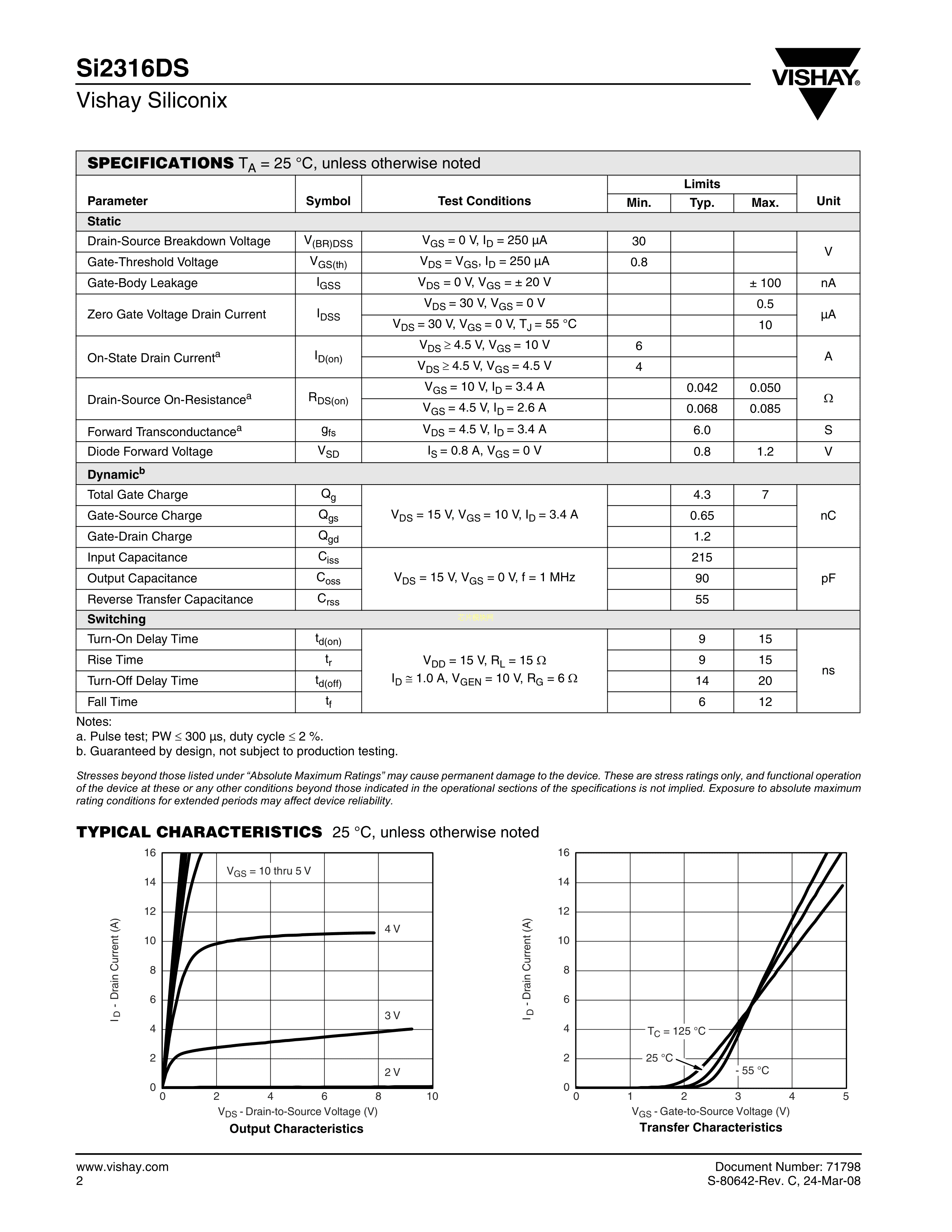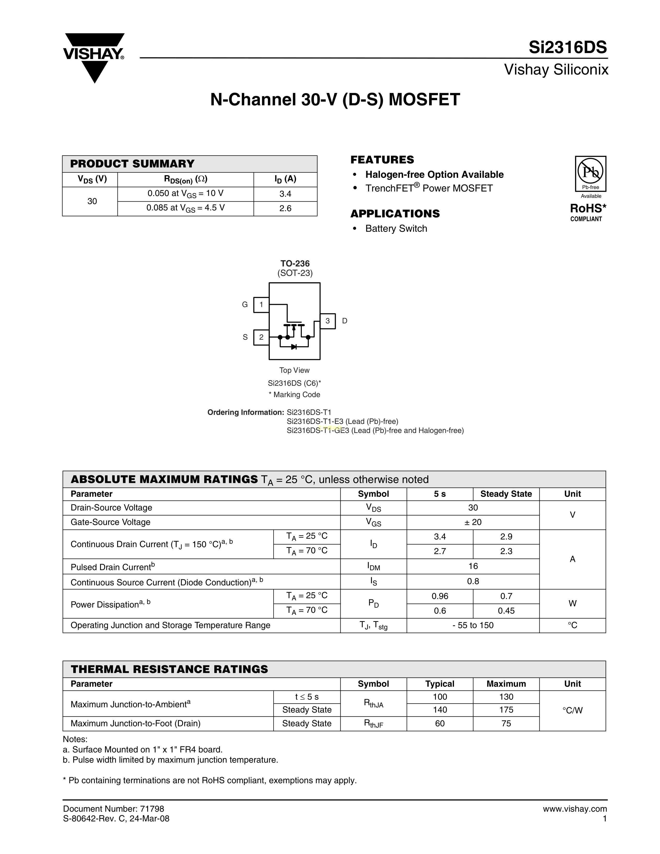 SI2316DS-T1-E3数据手册SOT-23(SOT-23-3)封装VISHAY(威世)PDF规格书,中英文下载