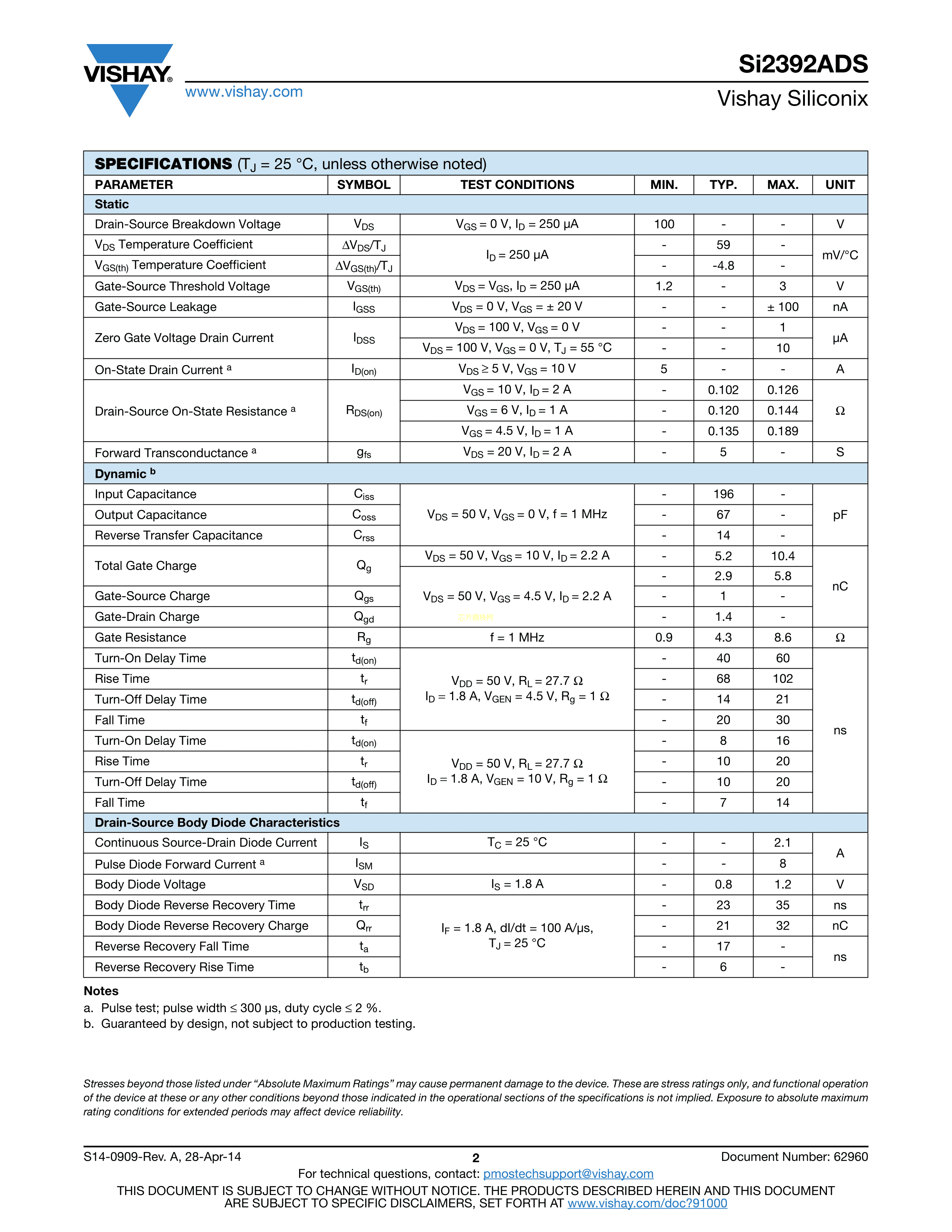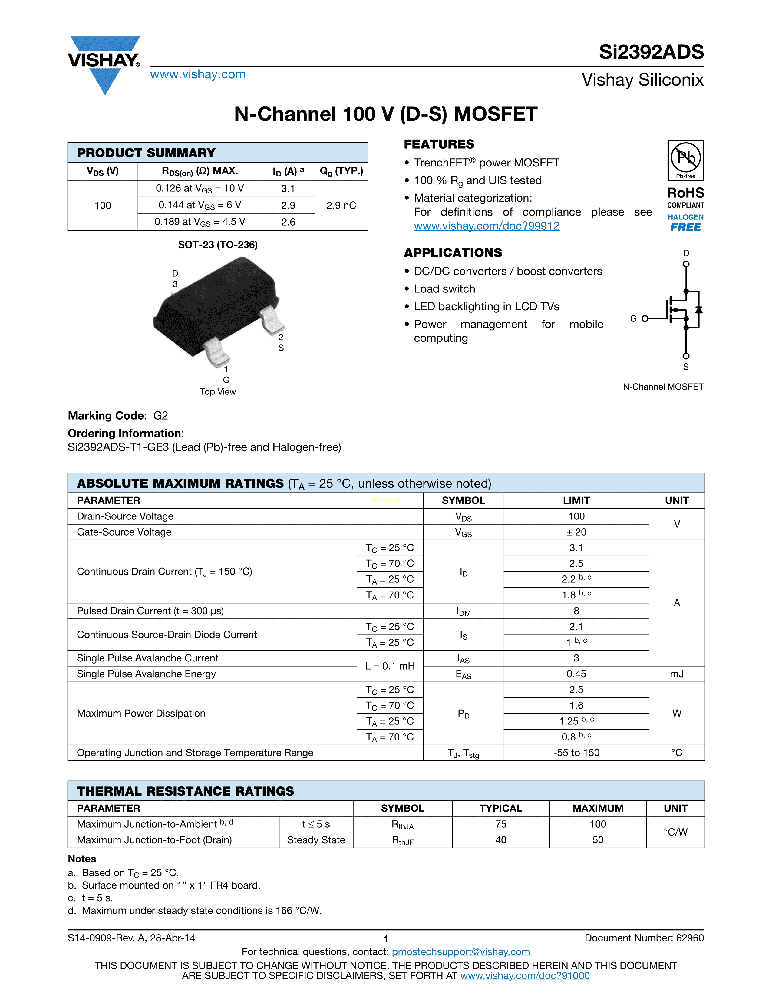 SI2392ADS-T1-GE3数据手册SOT-23(SOT-23-3)封装VISHAY(威世)PDF规格书,中英文下载