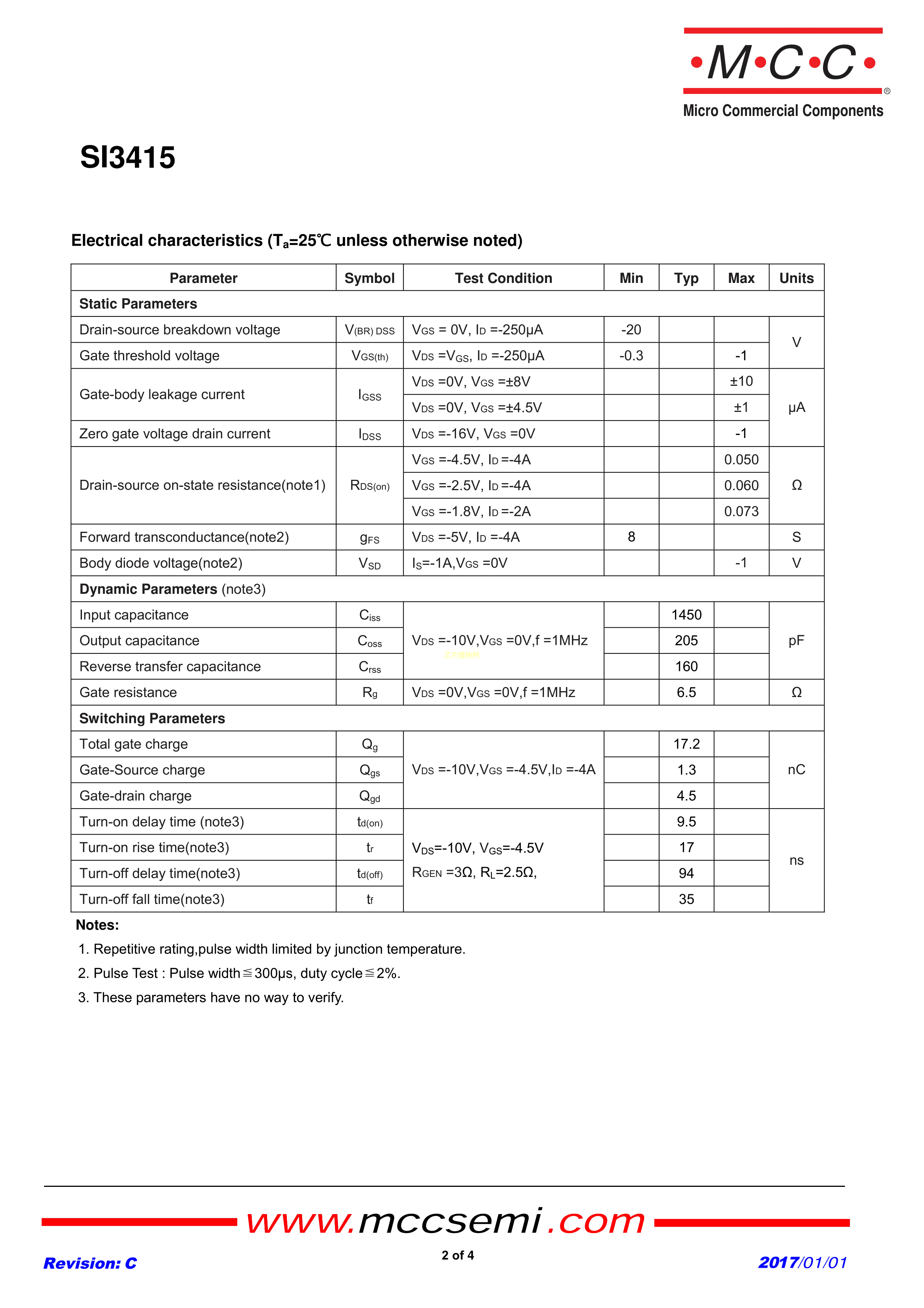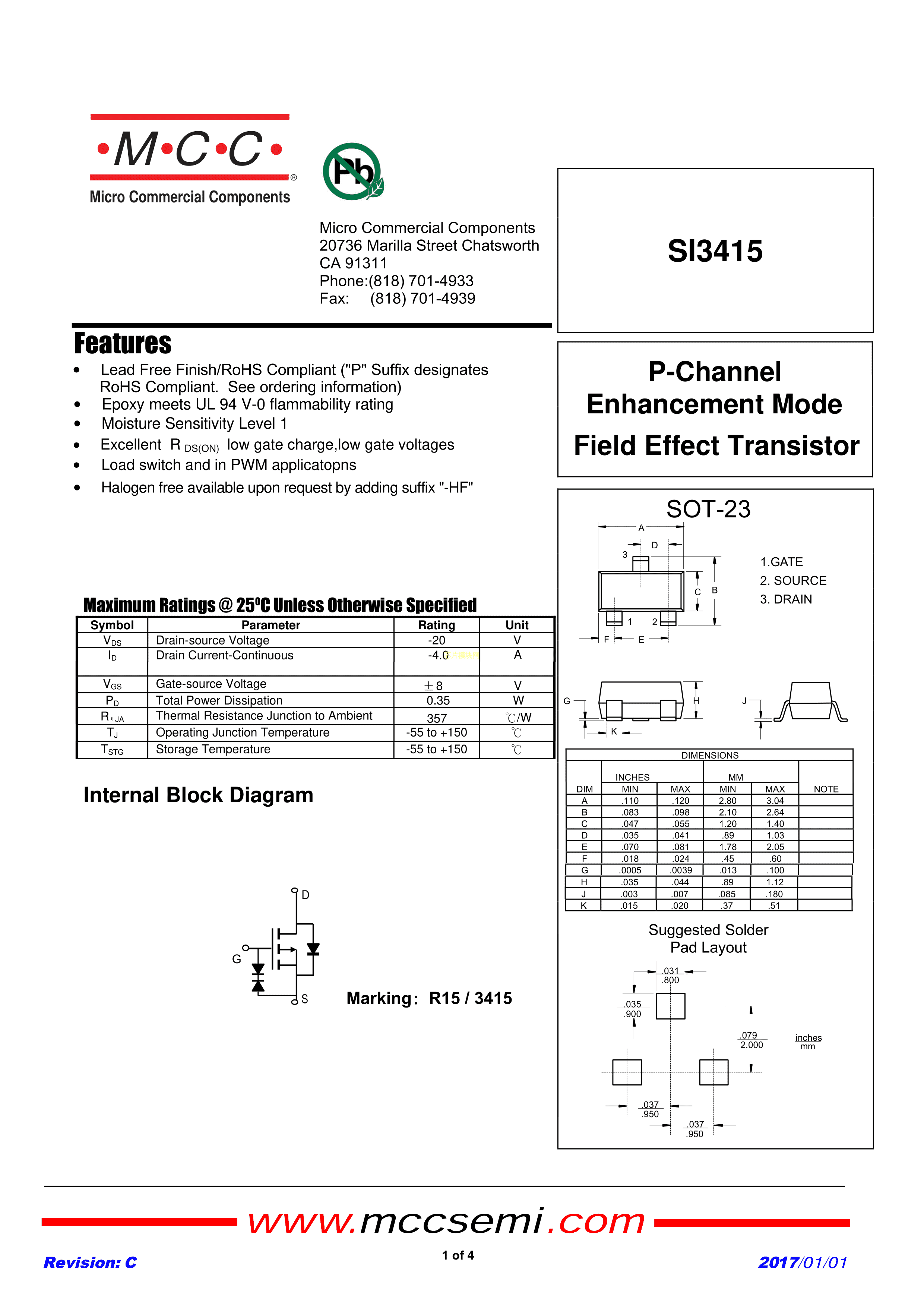 SI3415-TP数据手册SOT-23(SOT-23-3)封装MCC(美微科)PDF规格书,中英文下载
