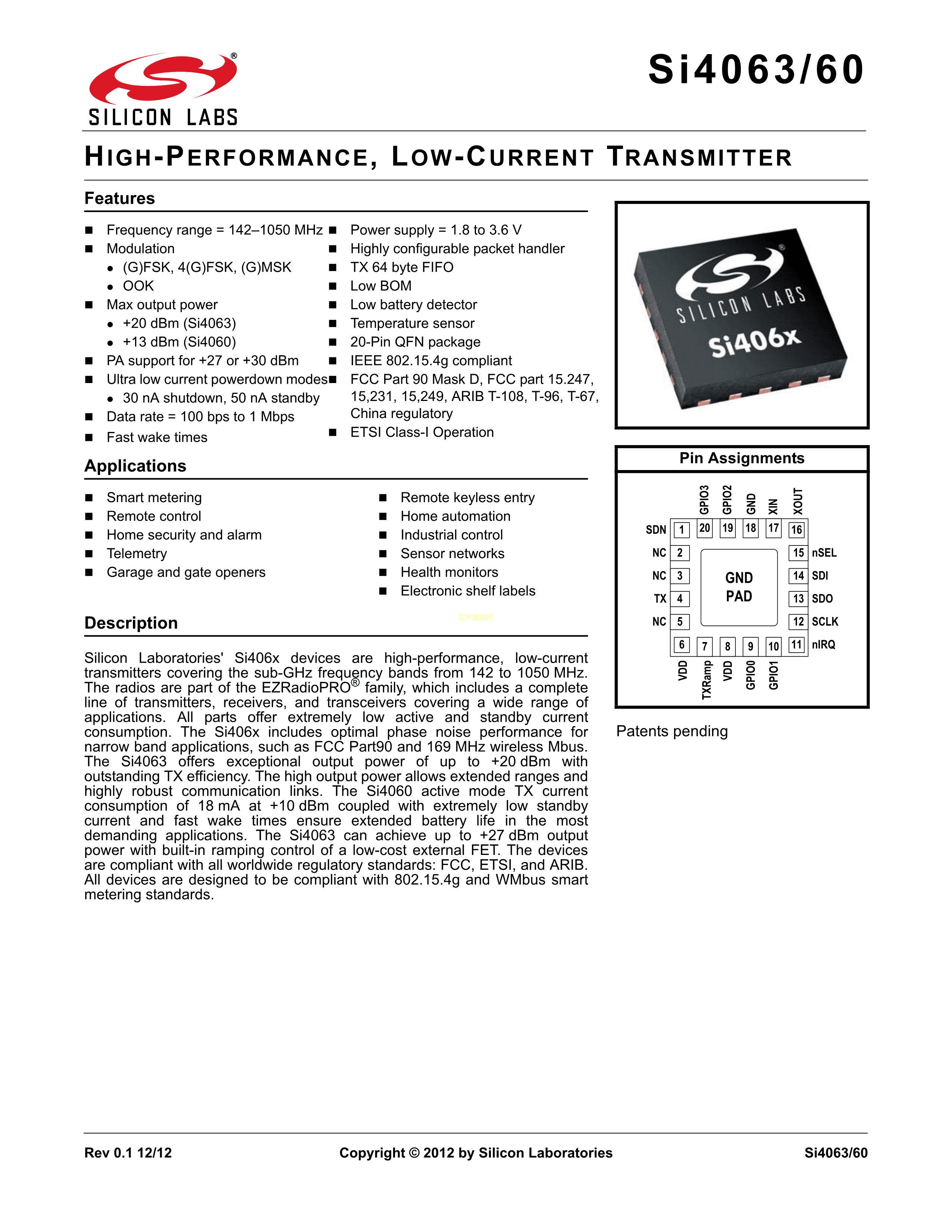 SI4063-B1B-FMR数据手册QFN-20(4x4)封装SILICON-LABS(芯科)PDF