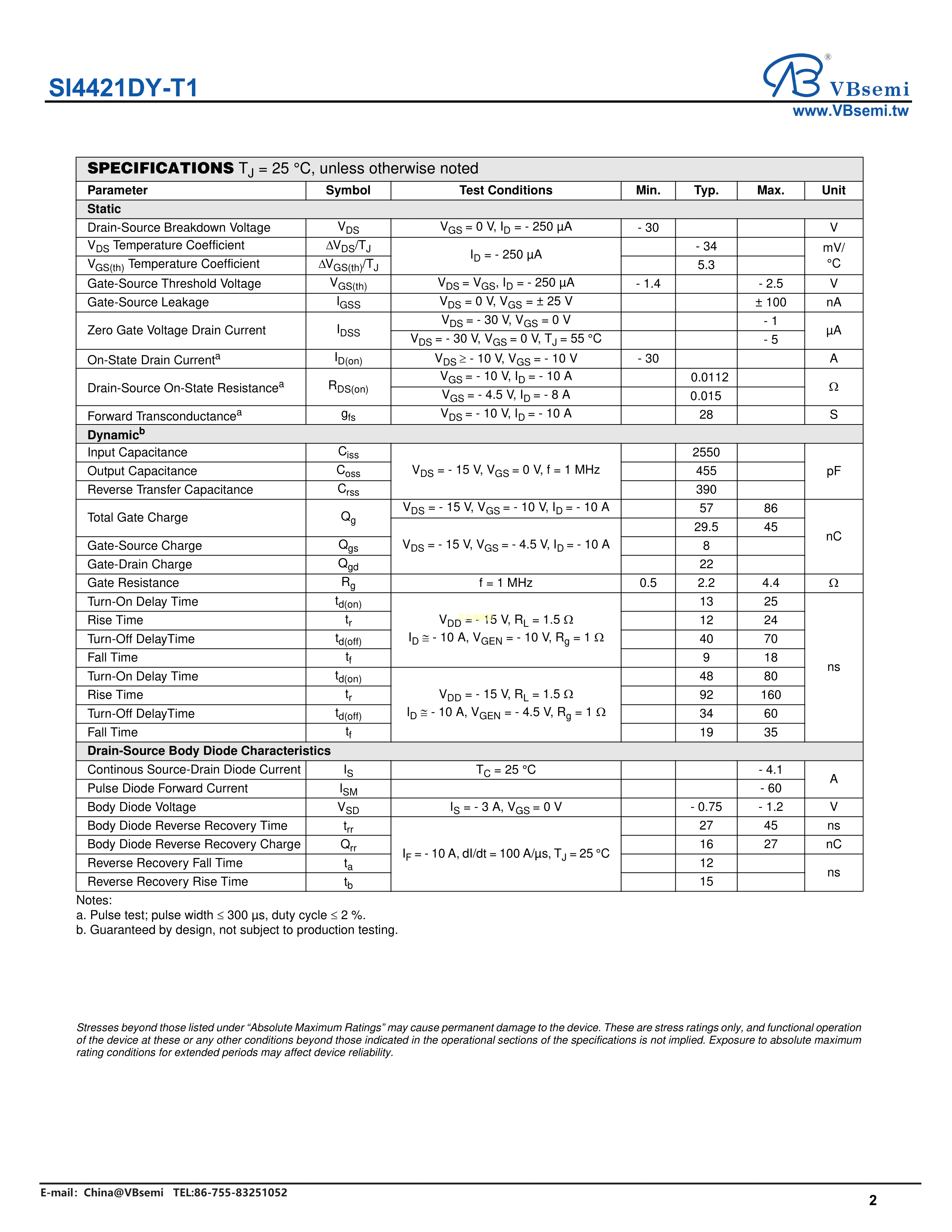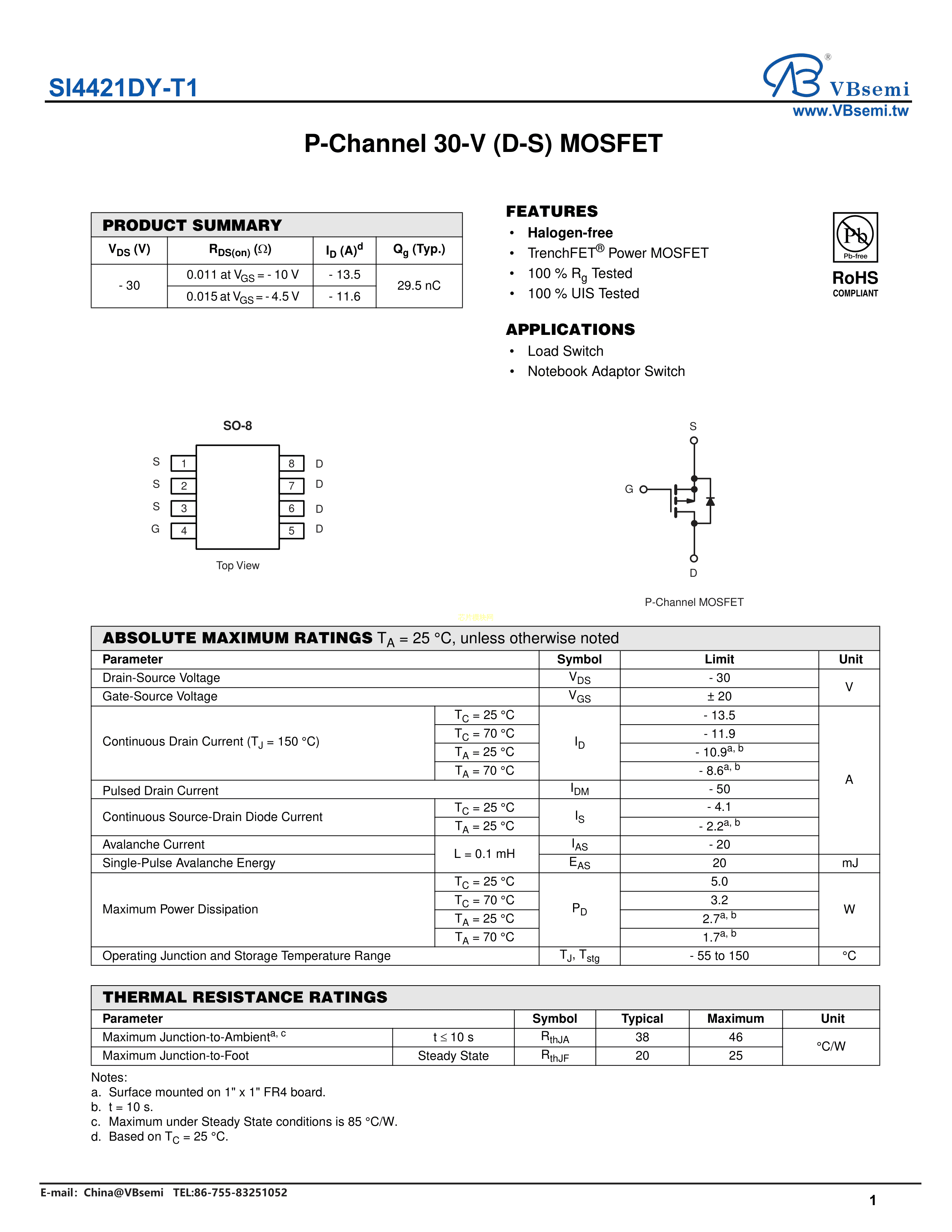 SI4421DY-T1数据手册SO-8封装VBsemi(台湾微碧)PDF规格书,中英文下载