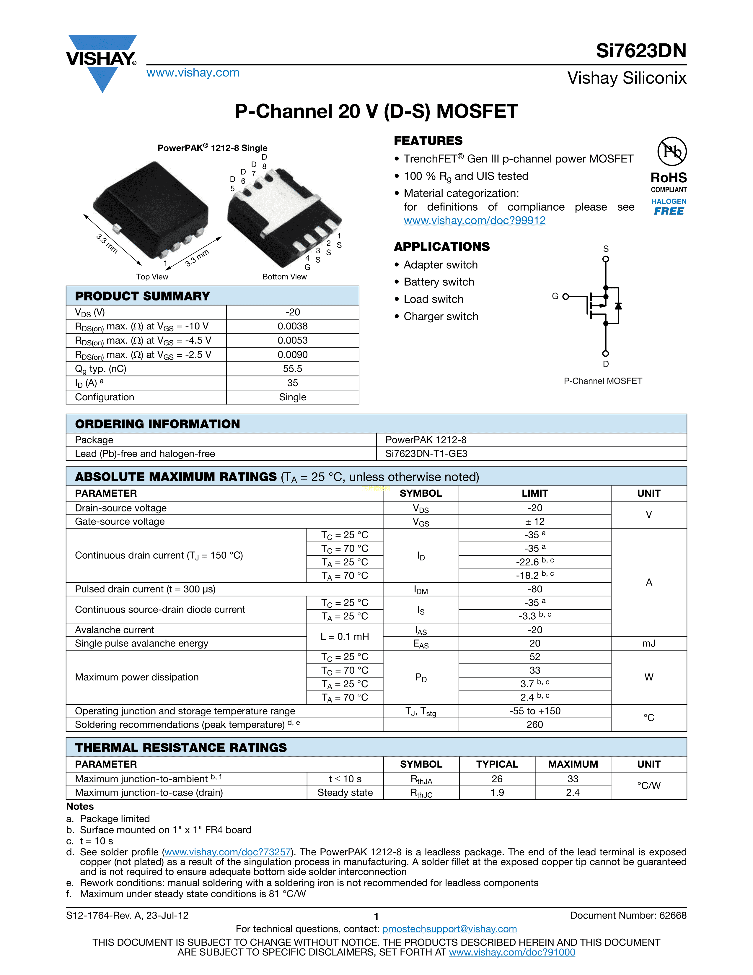 SI7623DN-T1-GE3数据手册PowerPAK-1212-8封装VISHAY(威世)PDF规