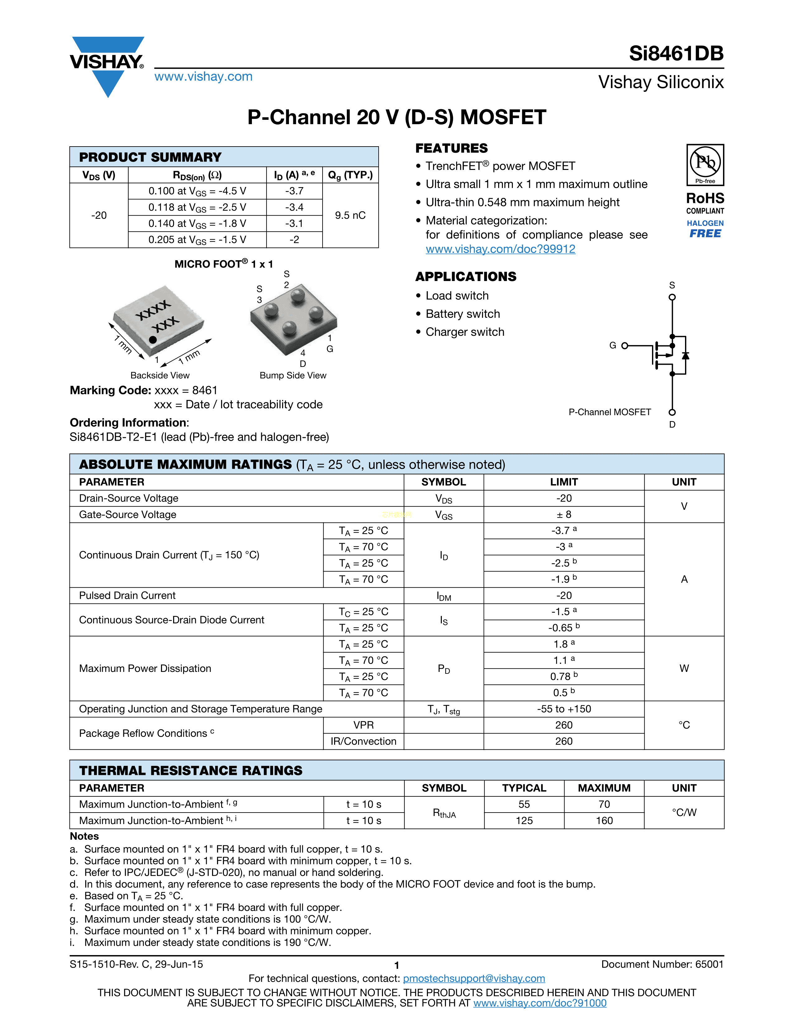 SI8461DB-T2-E1数据手册XFBGA-4封装VISHAY(威世)PDF规格书,中英文下载
