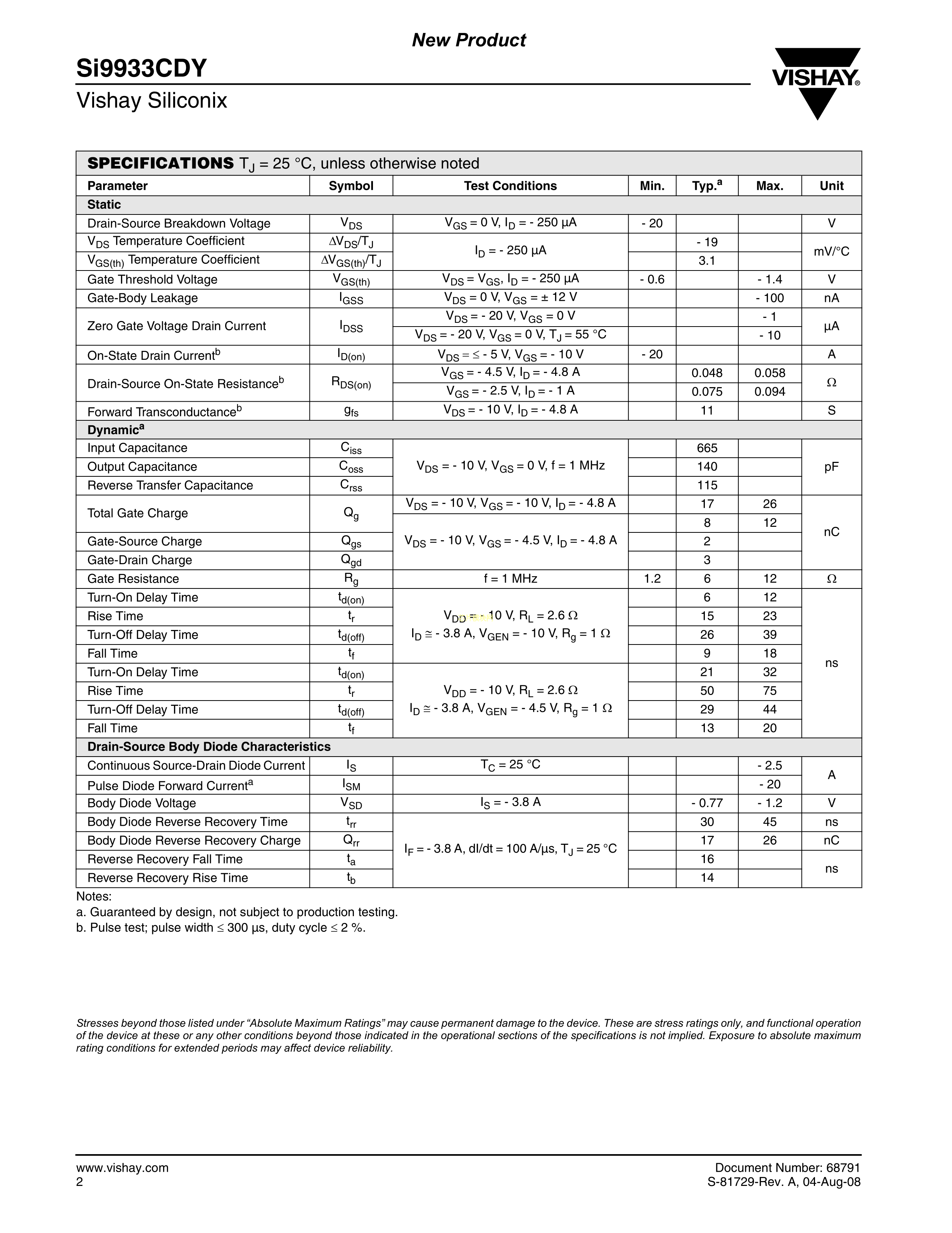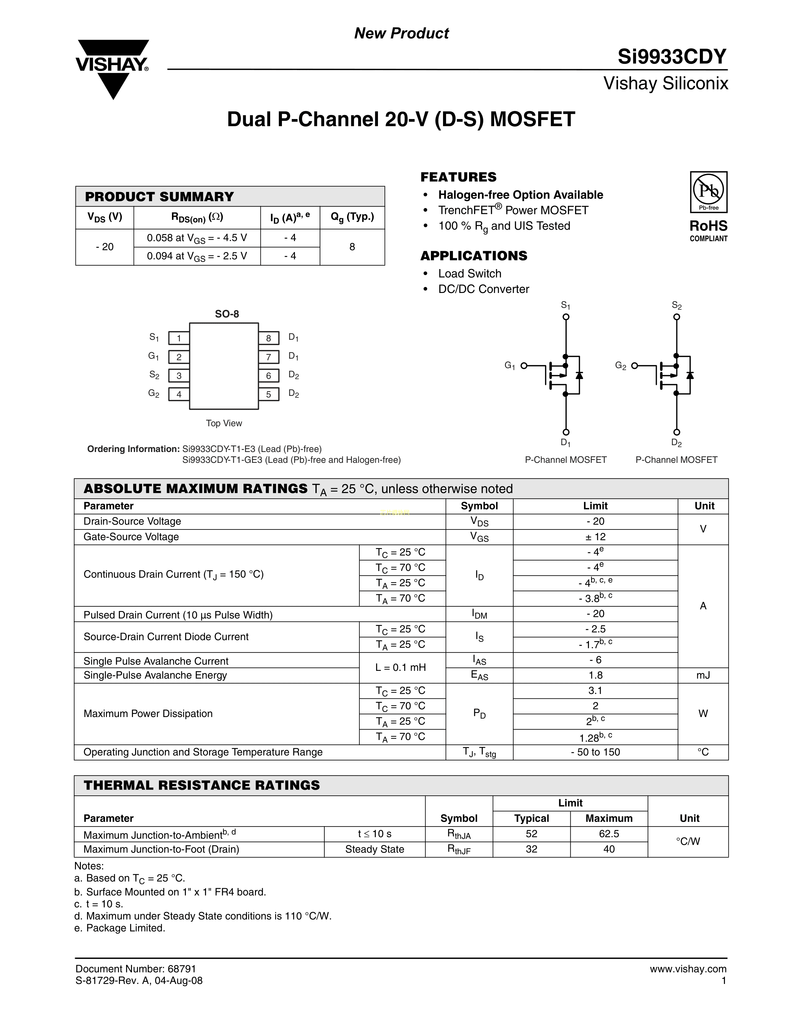 SI9933CDY-T1-GE3数据手册SOIC-8_150mil封装VISHAY(威世)PDF规格