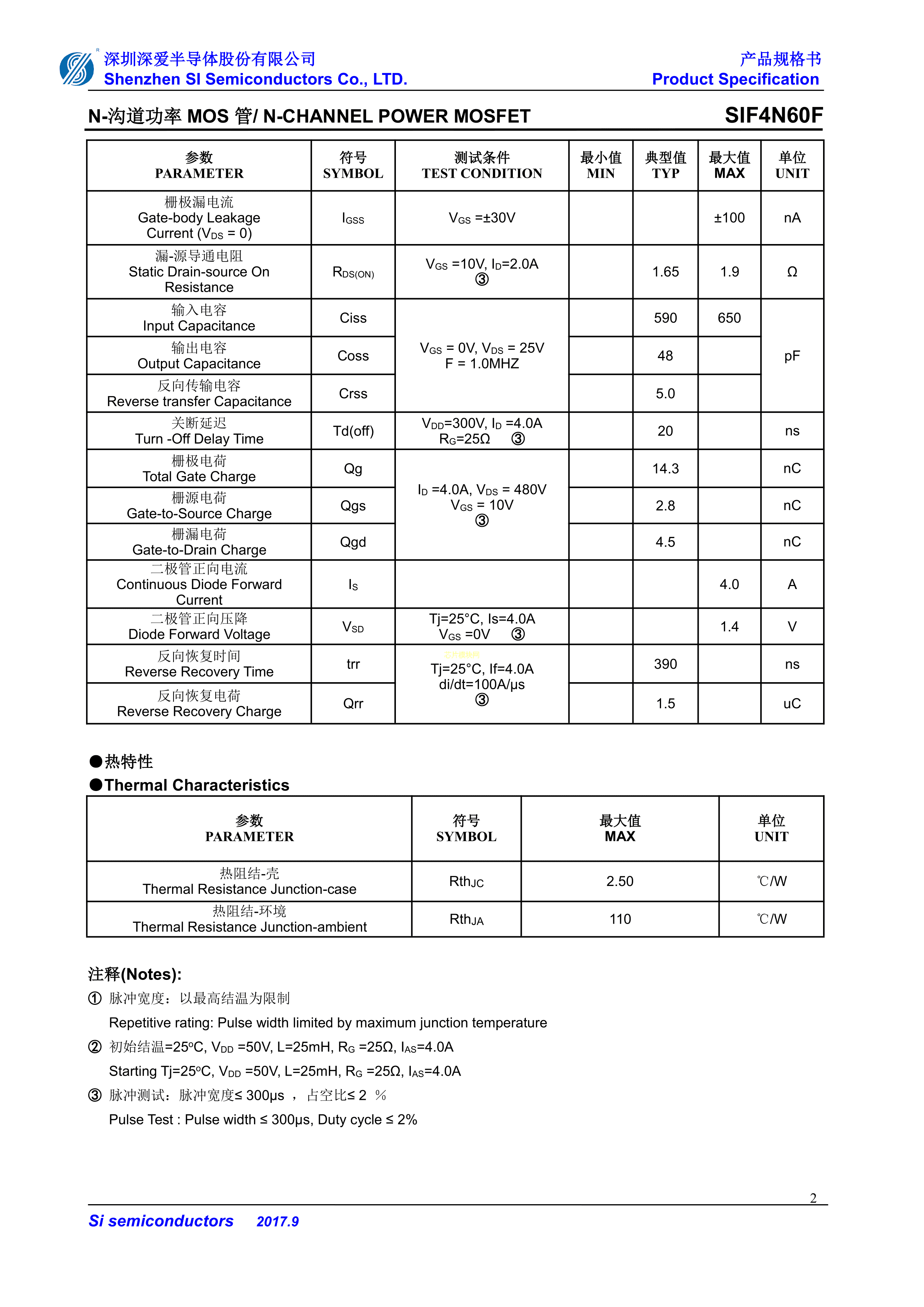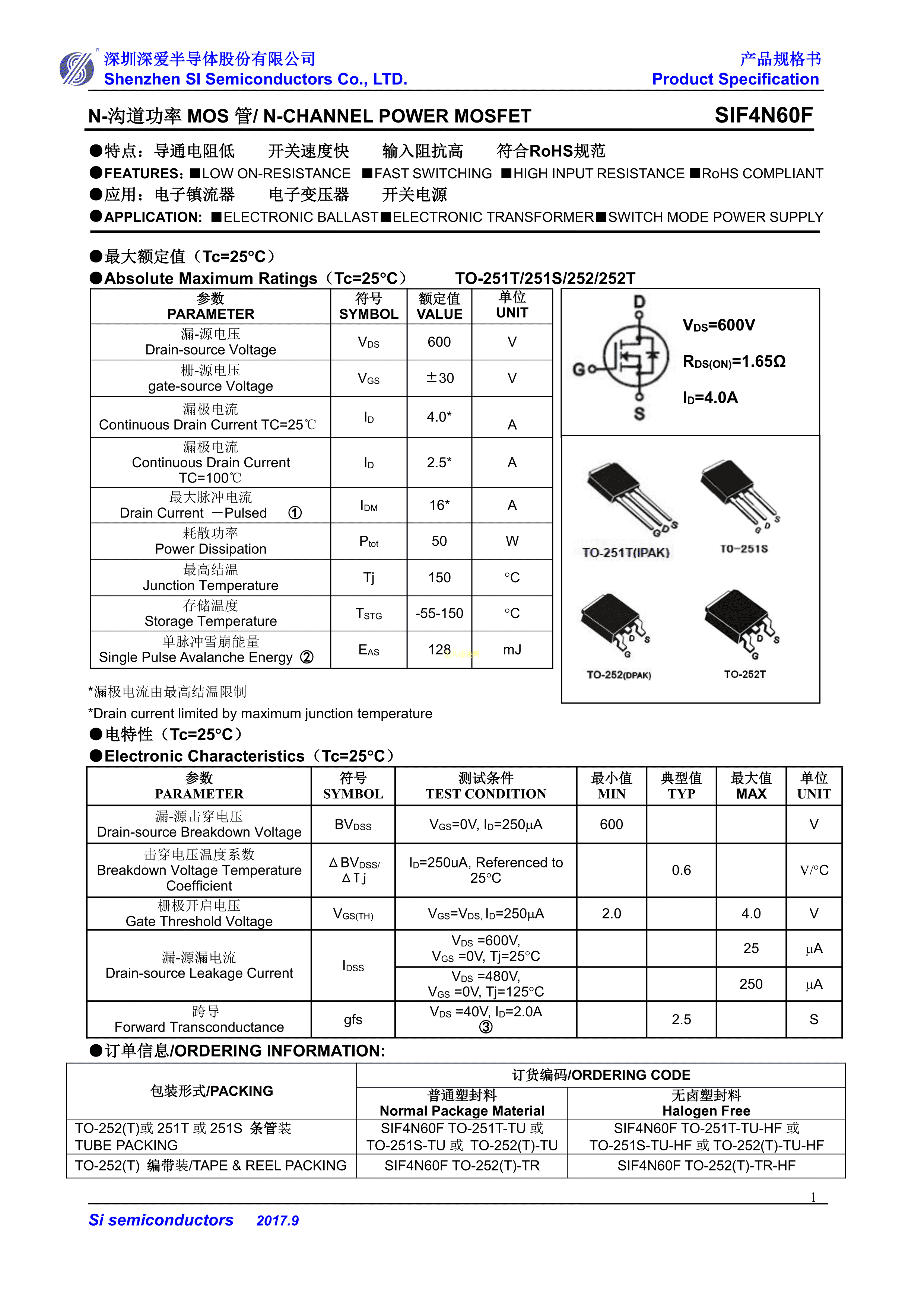 SIF4N60F数据手册TO-220FPL-TU-HF封装SI(深爱)PDF规格书,中英文下载