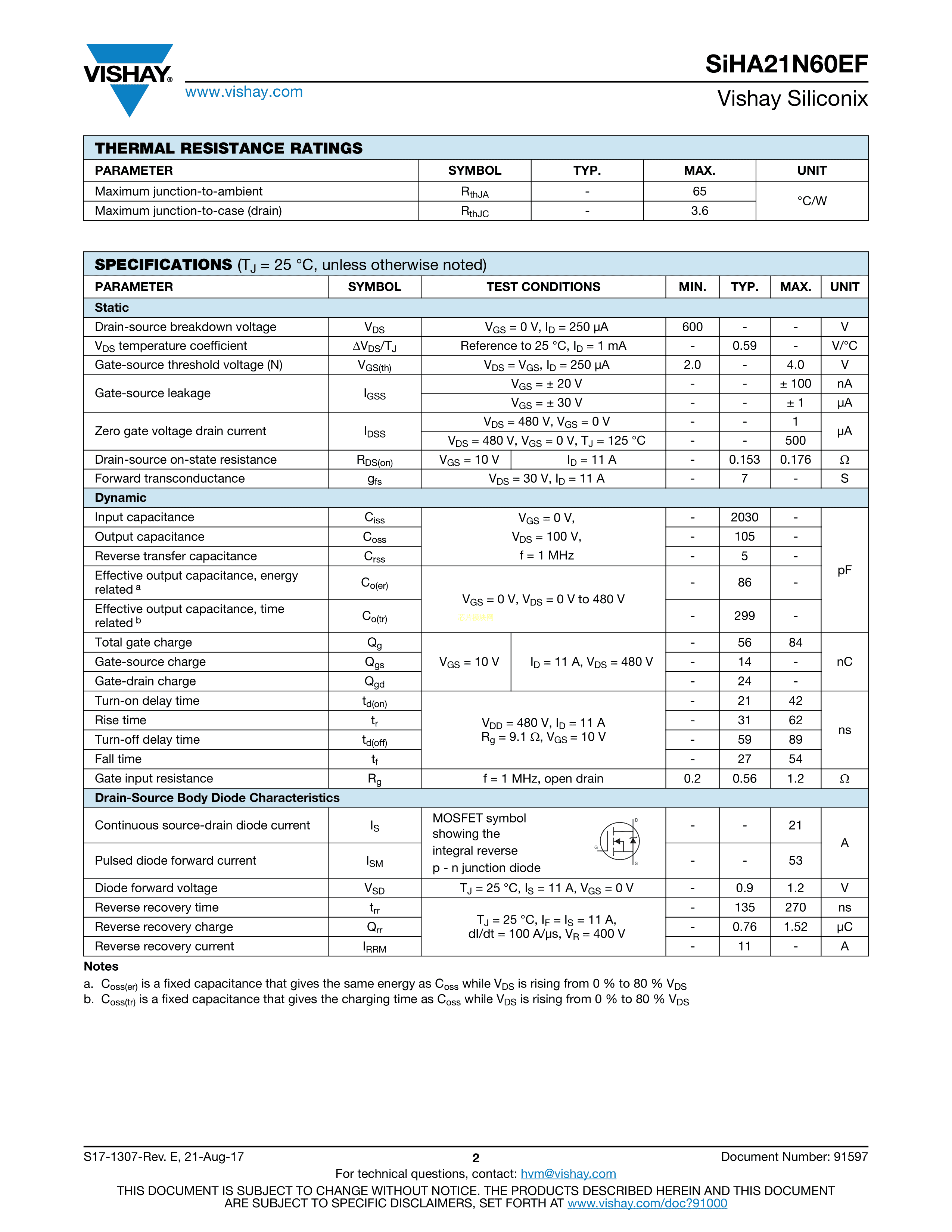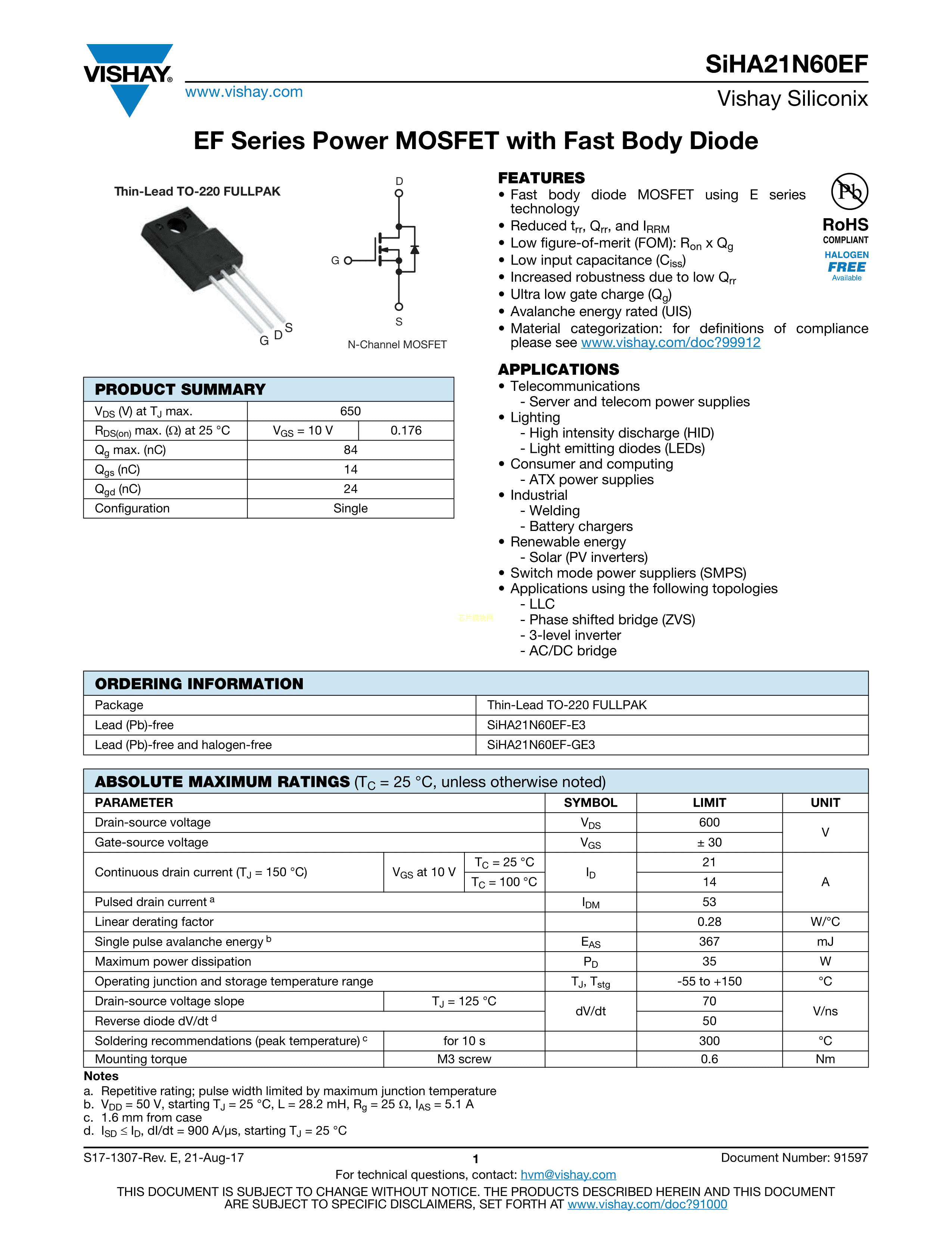 SIHA21N60EF-E3数据手册TO-220封装VISHAY(威世)PDF规格书,中英文下载