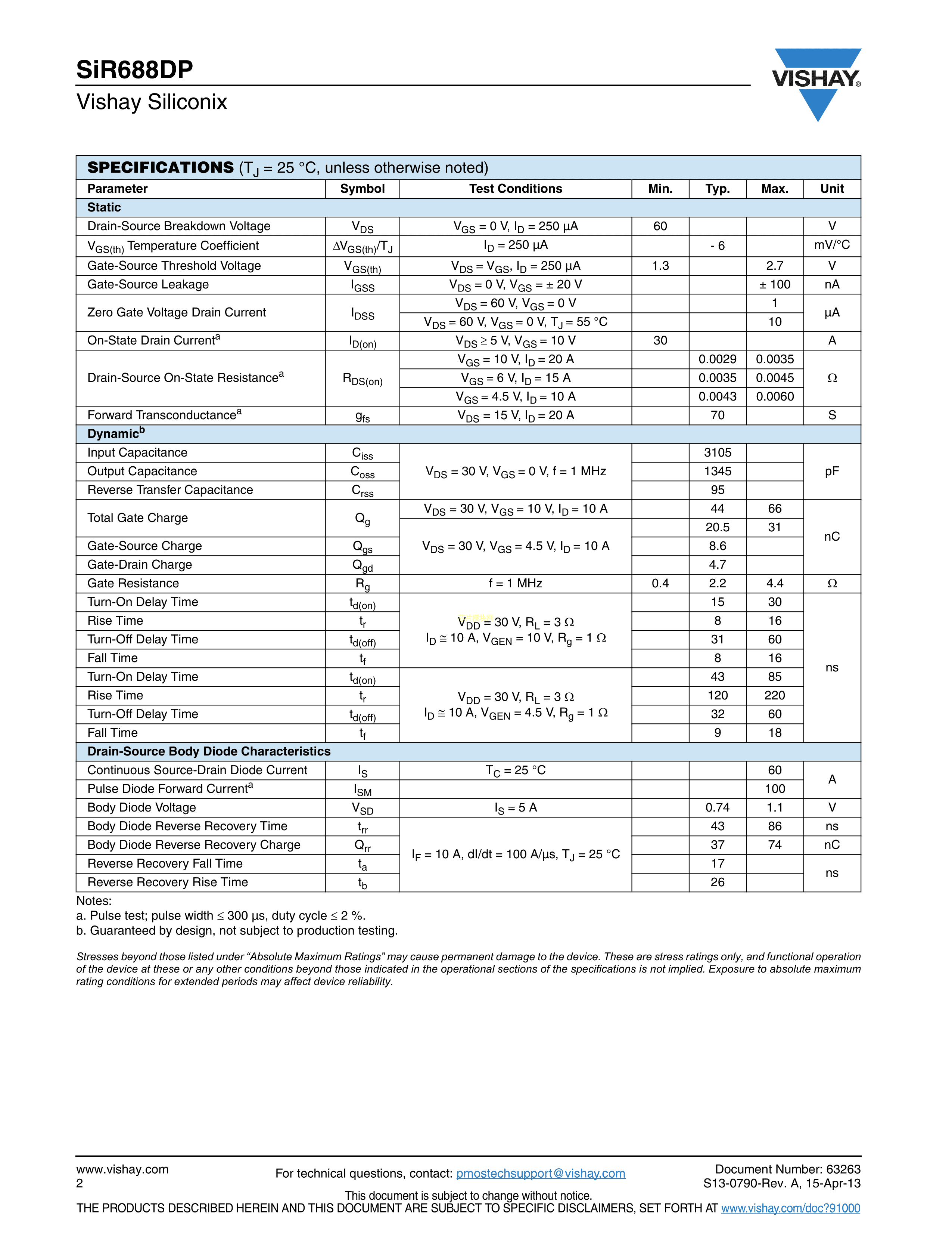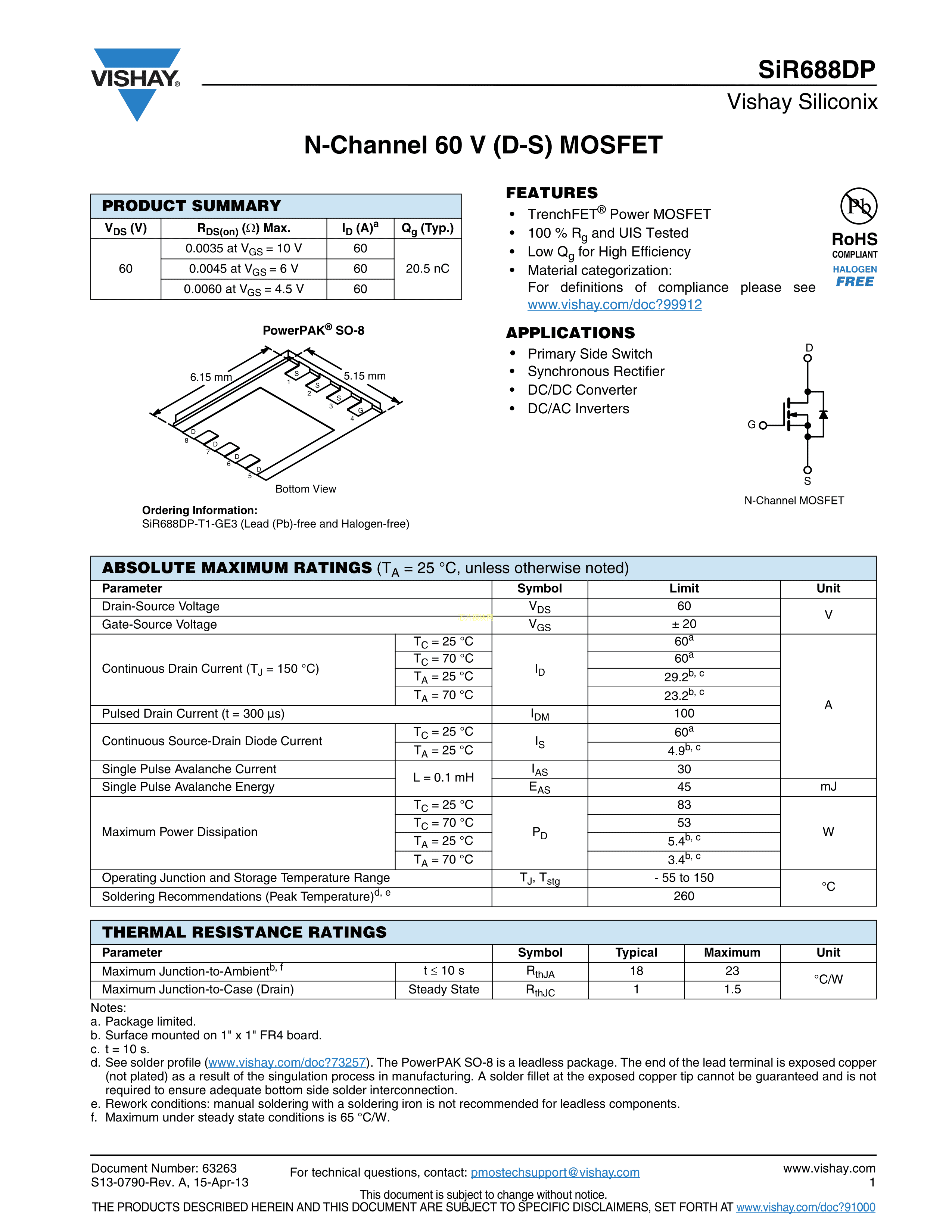 SIR688DP-T1-GE3数据手册PowerPAK SO-8封装VISHAY(威世)PDF规格书