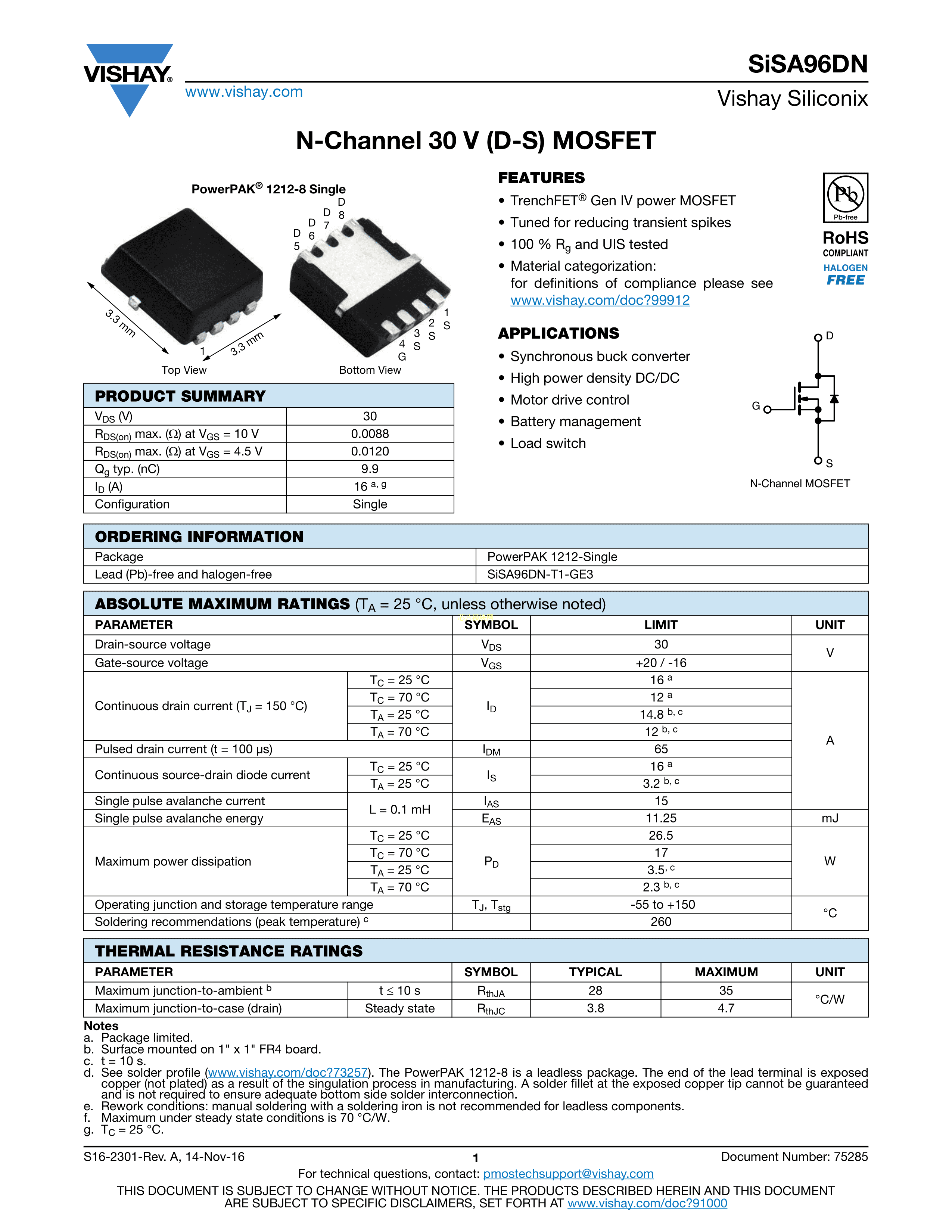 SISA96DN-T1-GE3数据手册PowerPAK 1212-8封装VISHAY(威世)PDF规