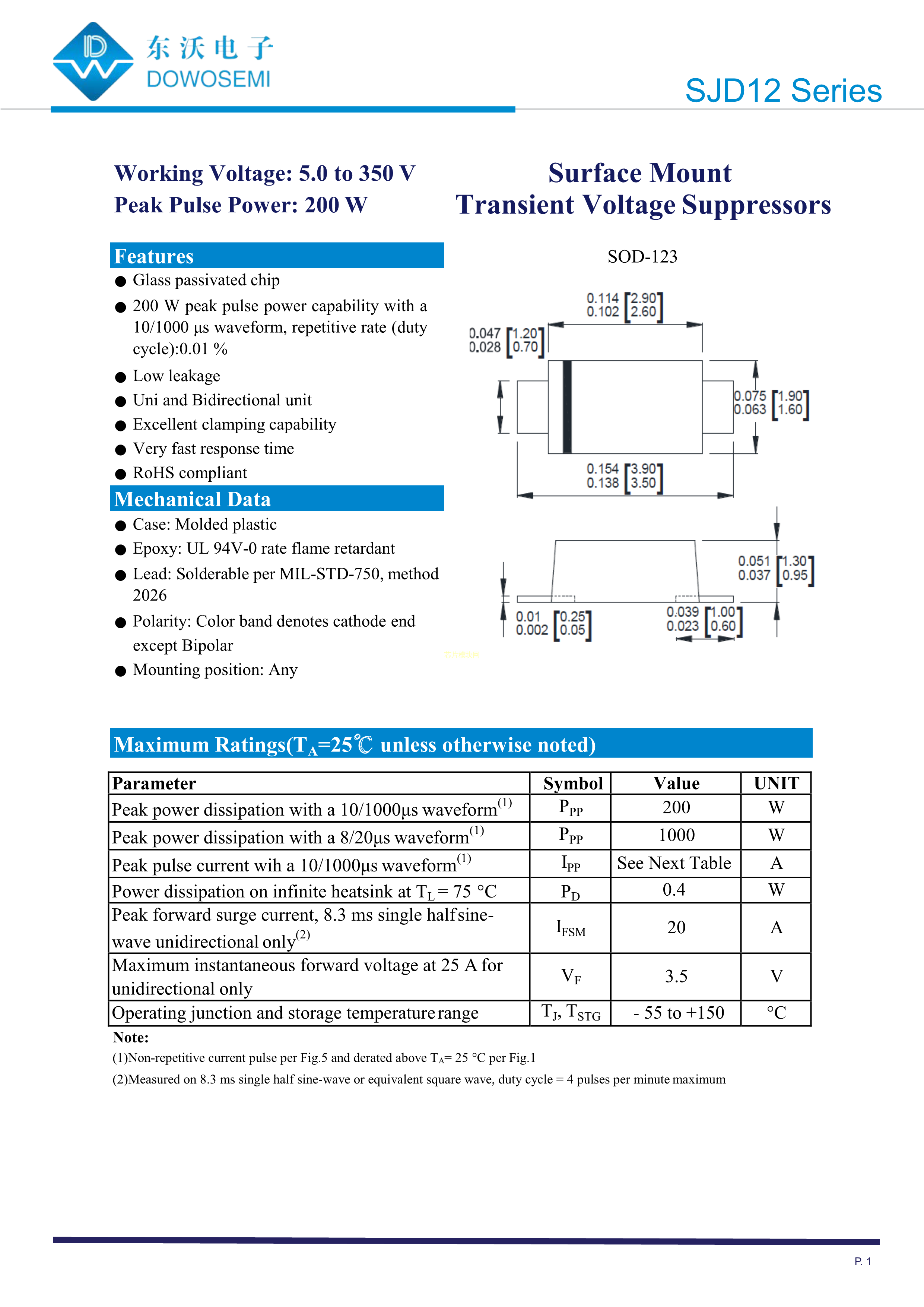 SJD12C30L01数据手册SOD-123封装DOWO(东沃)PDF规格书,中英文下载