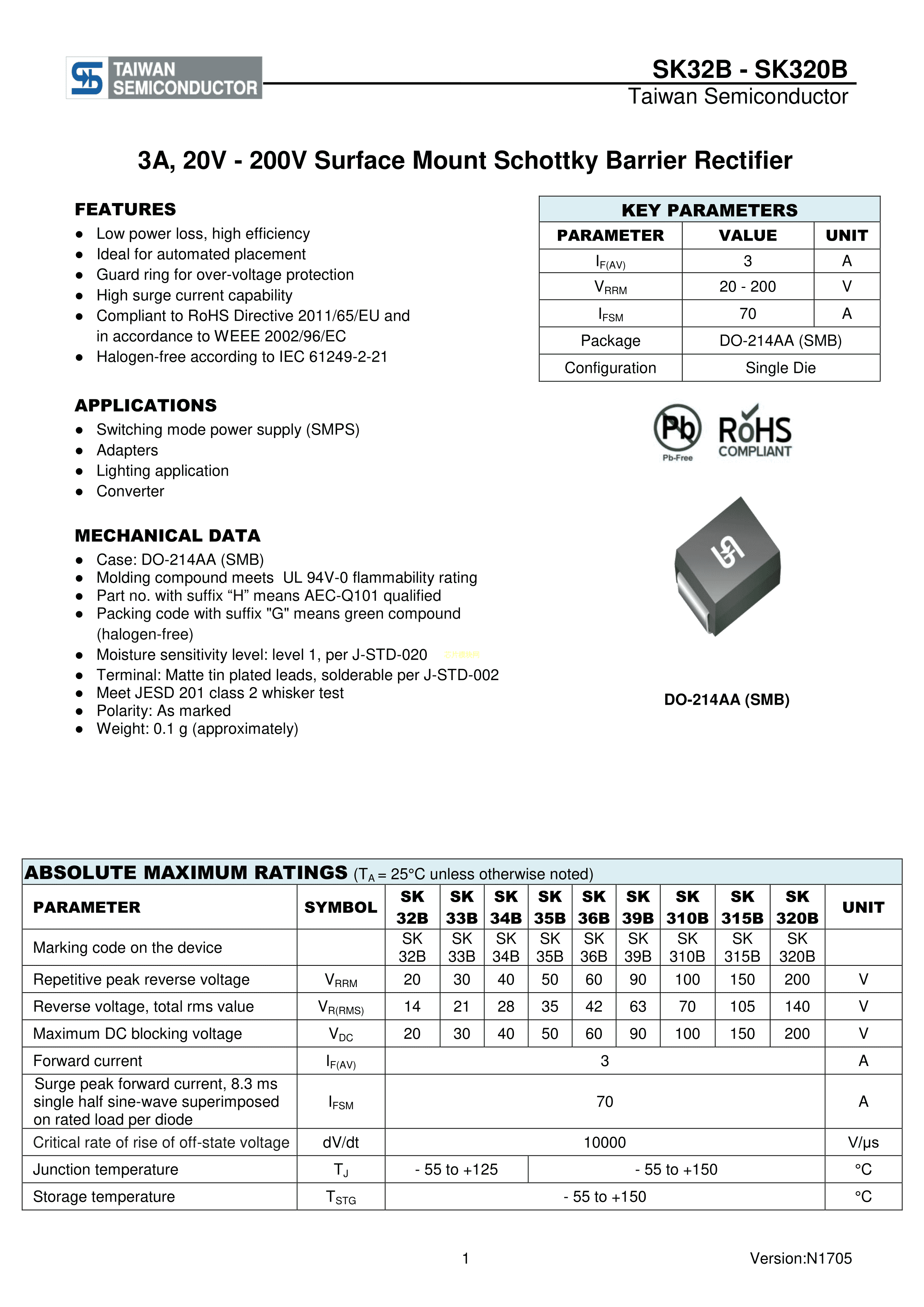 SK310BR5G数据手册SMB(DO-214AA)封装TaiwanSemiconductor(台湾半导体)PDF规格书,中英文下载
