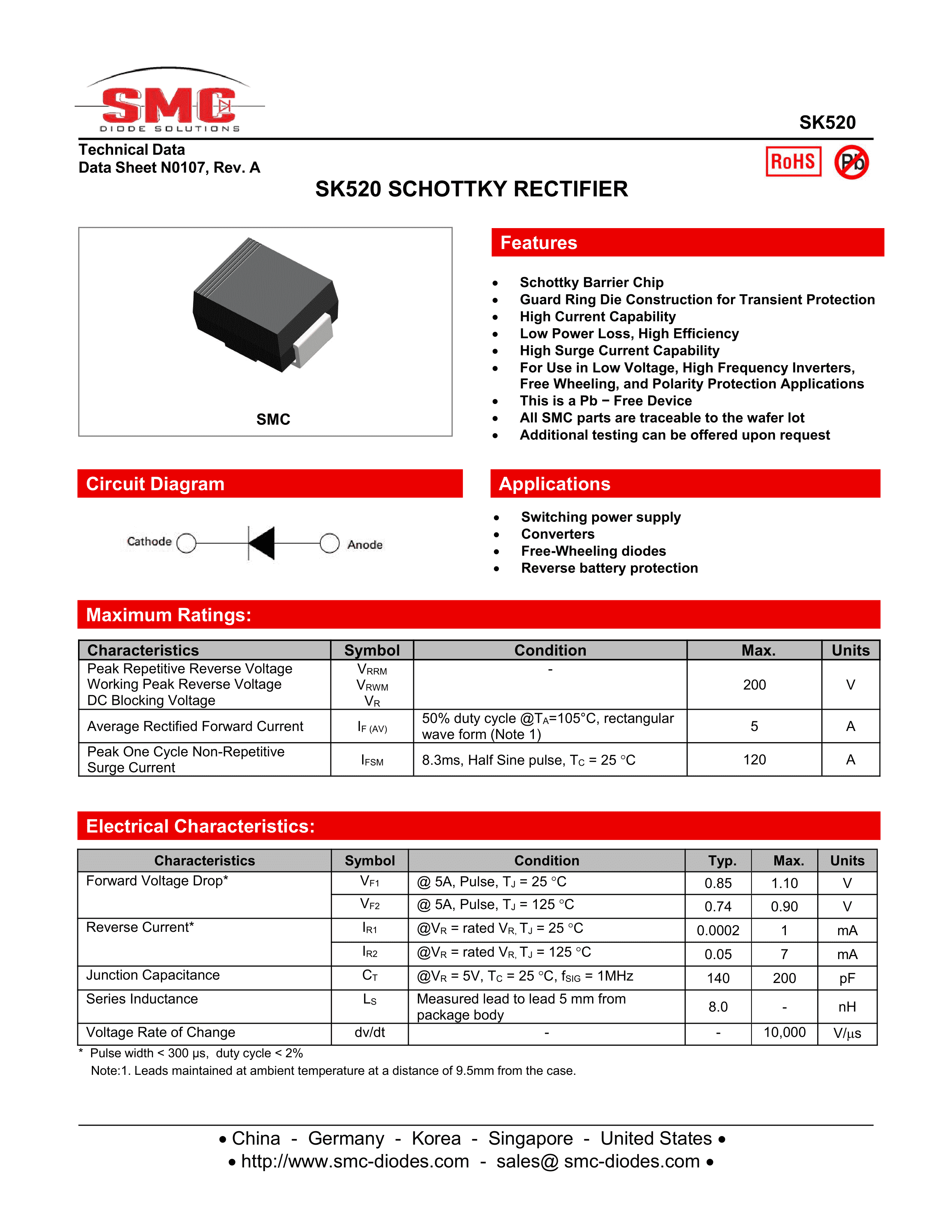 SK520数据手册SMC(DO-214AB)封装SMC(桑德斯)PDF规格书,中英文下载