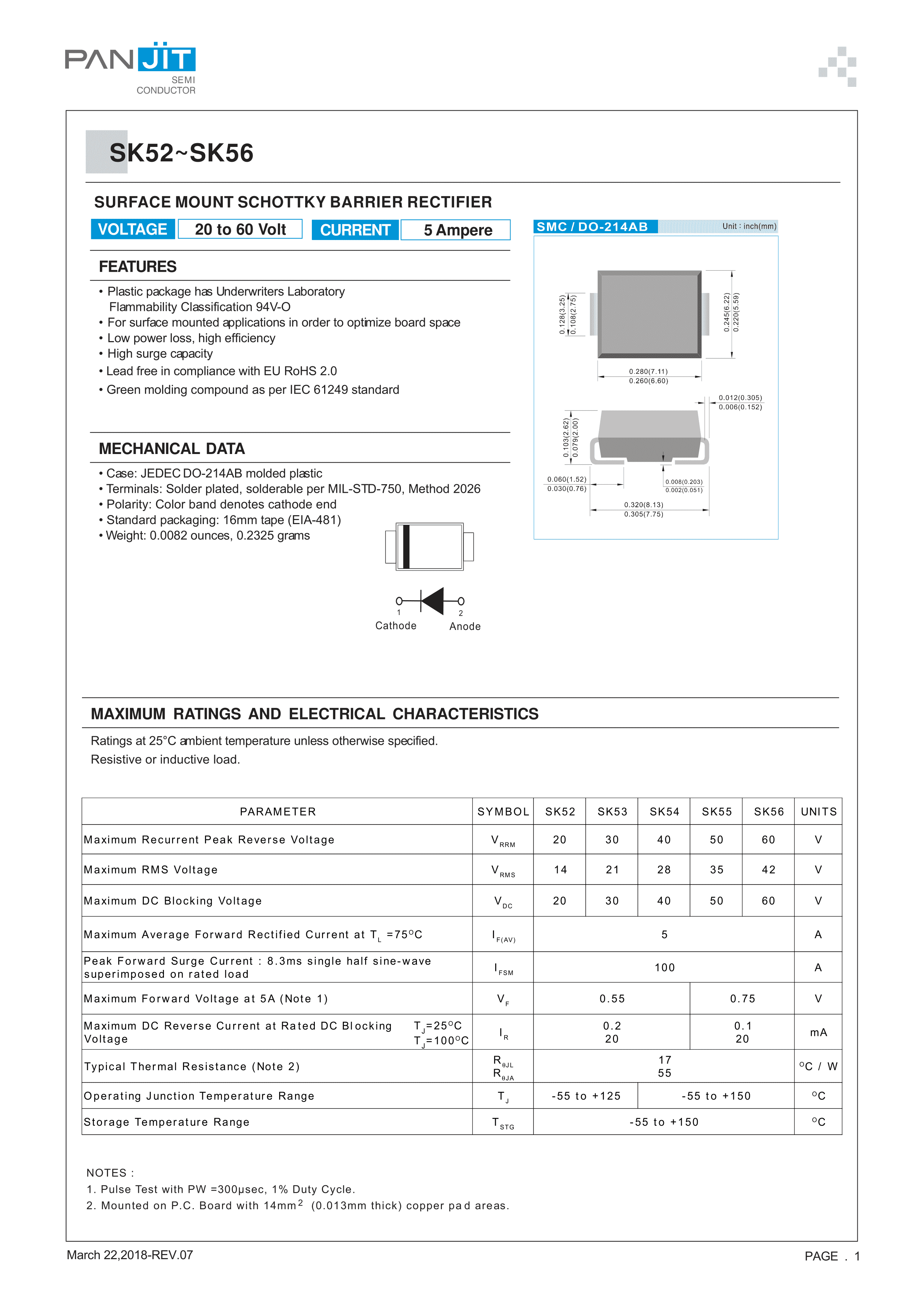 SK54_R1_00001数据手册SMC(DO-214AB)封装PANJIT(强茂)PDF规格书,中