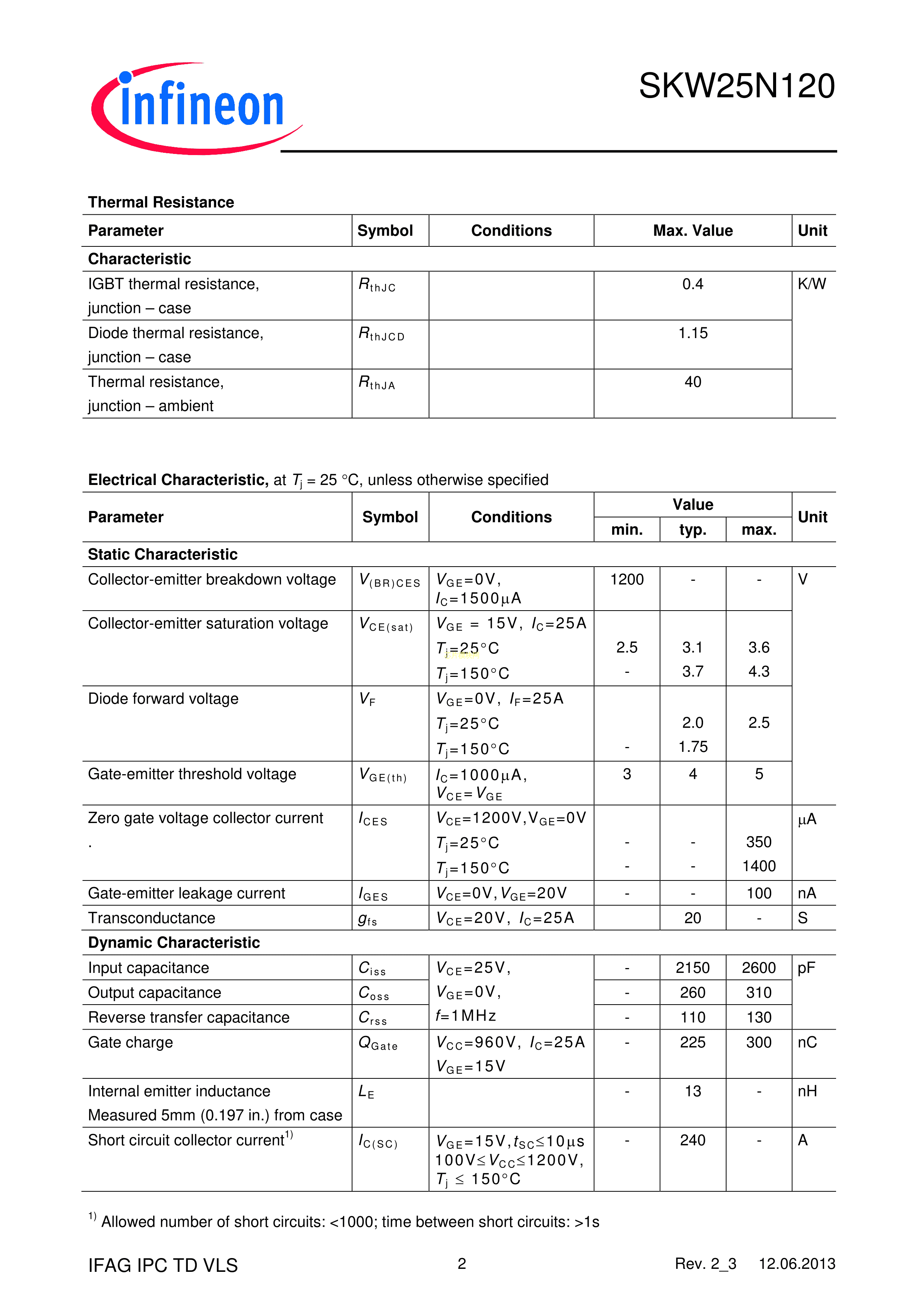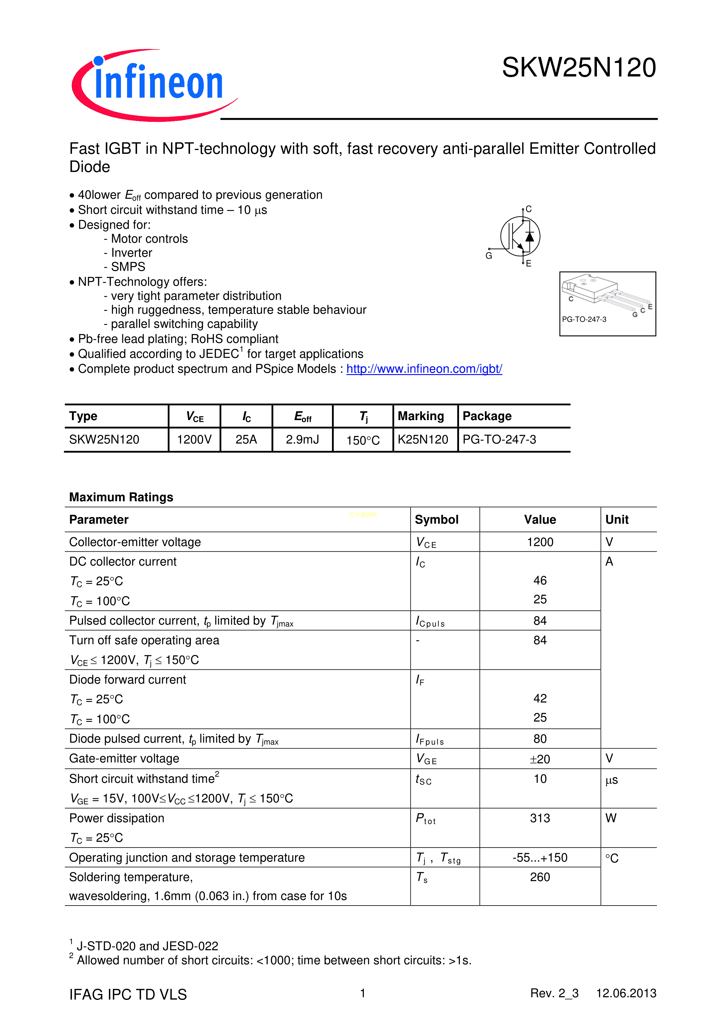 SKW25N120数据手册PG-TO247-3封装Infineon(英飞凌)PDF规格书,中英文下载
