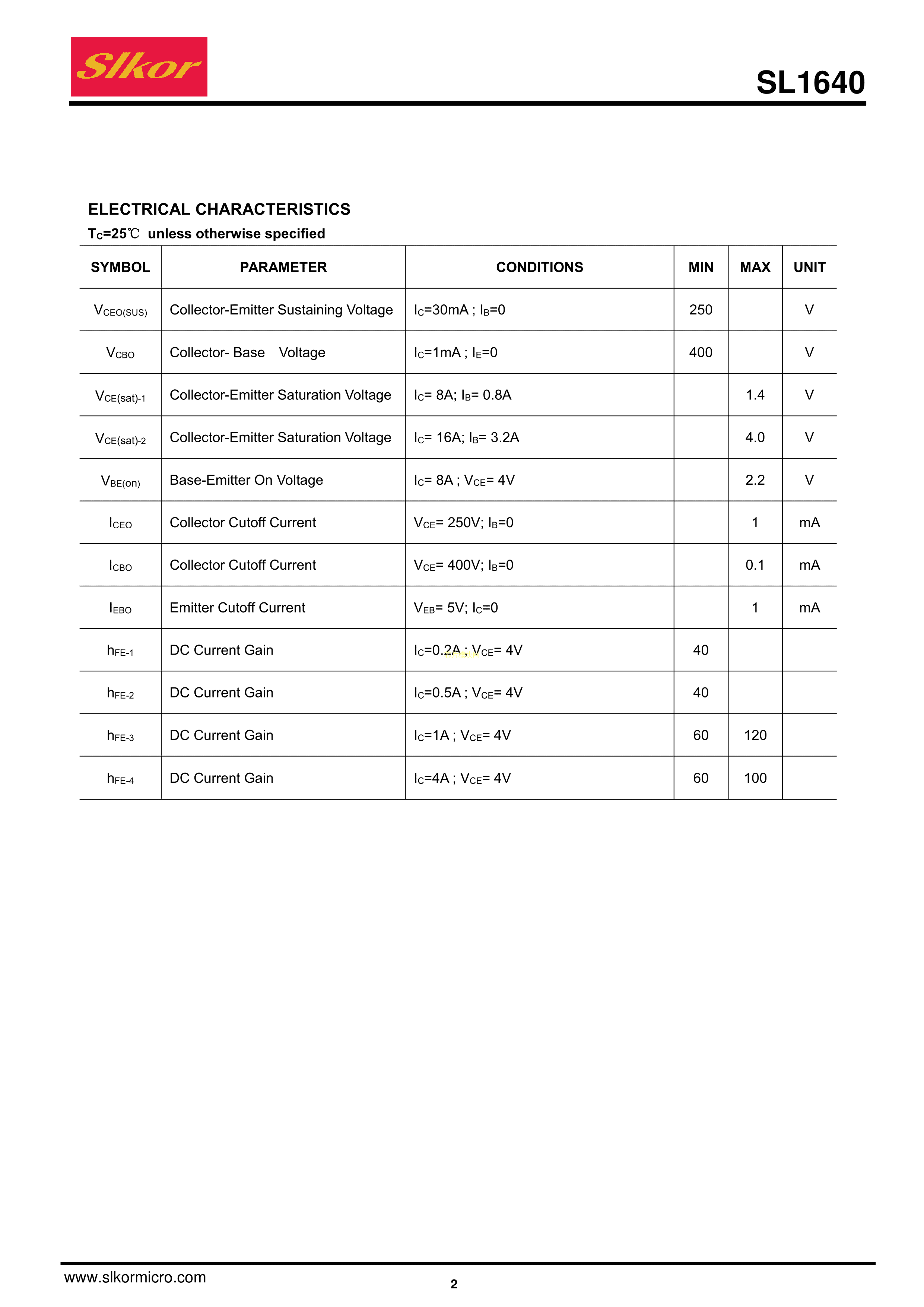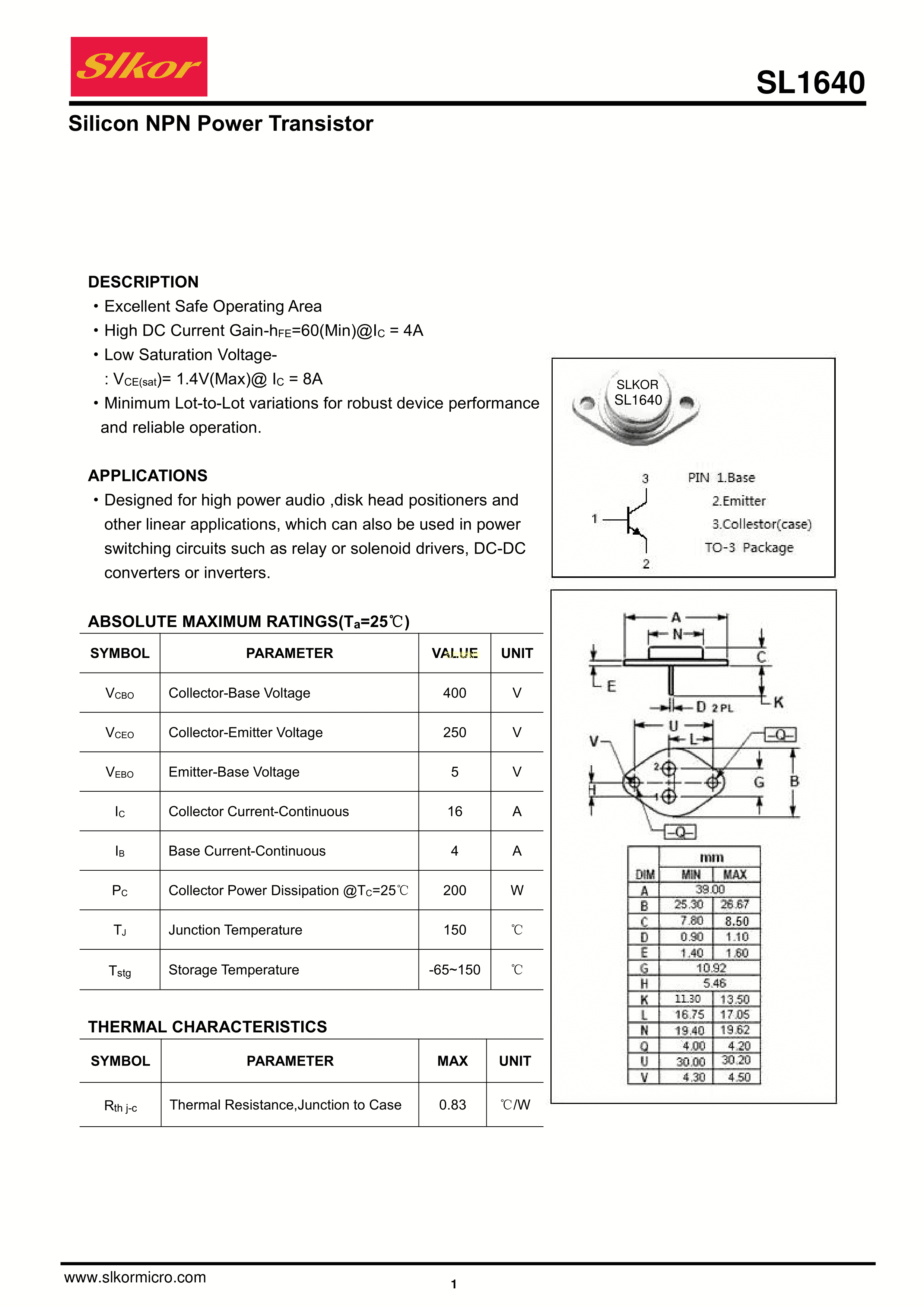 SL1640数据手册TO-3封装Slkor(萨科微)PDF规格书,中英文下载
