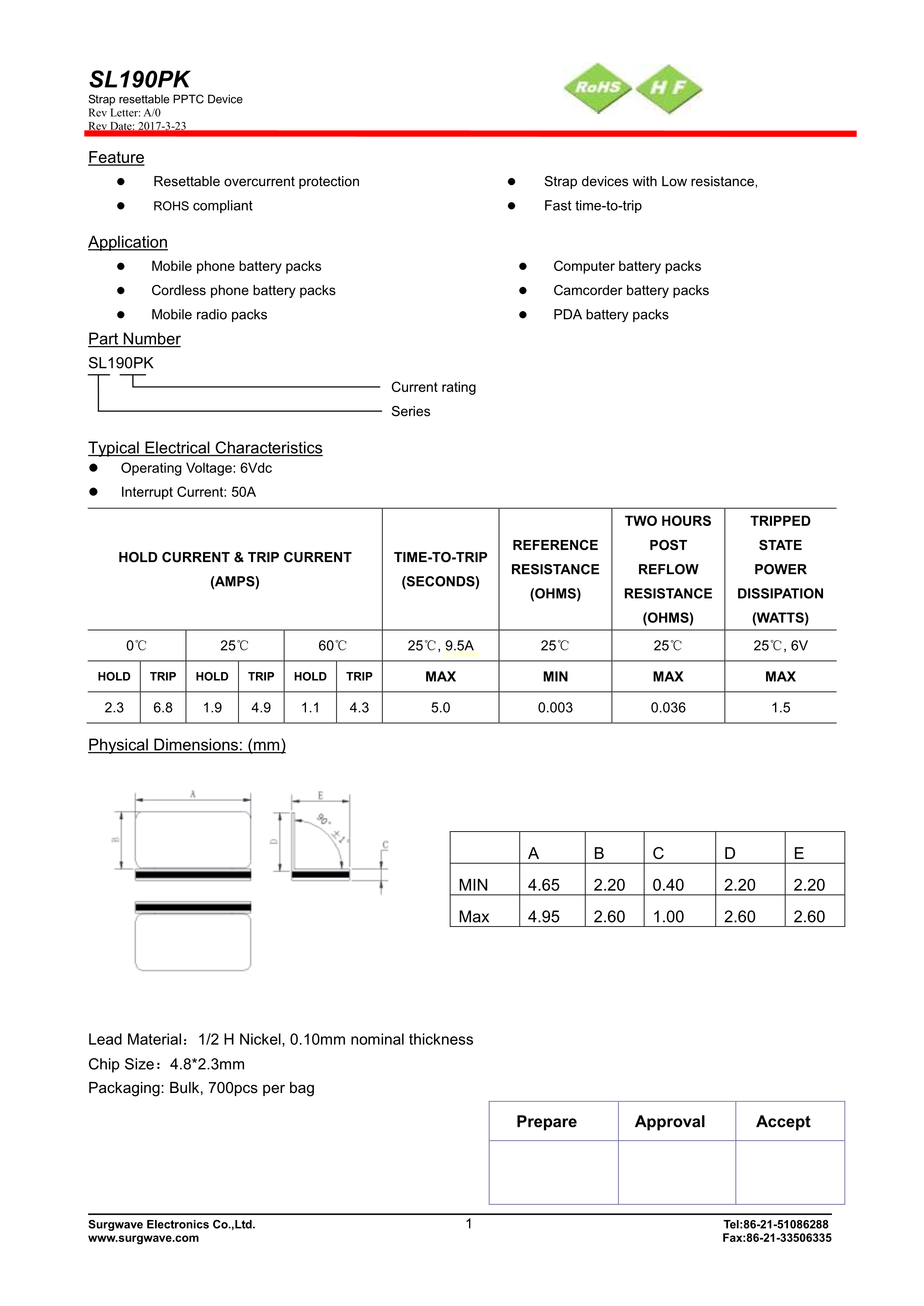 SL190PK数据手册SMD封装Surgwave(神沃)PDF规格书,中英文下载