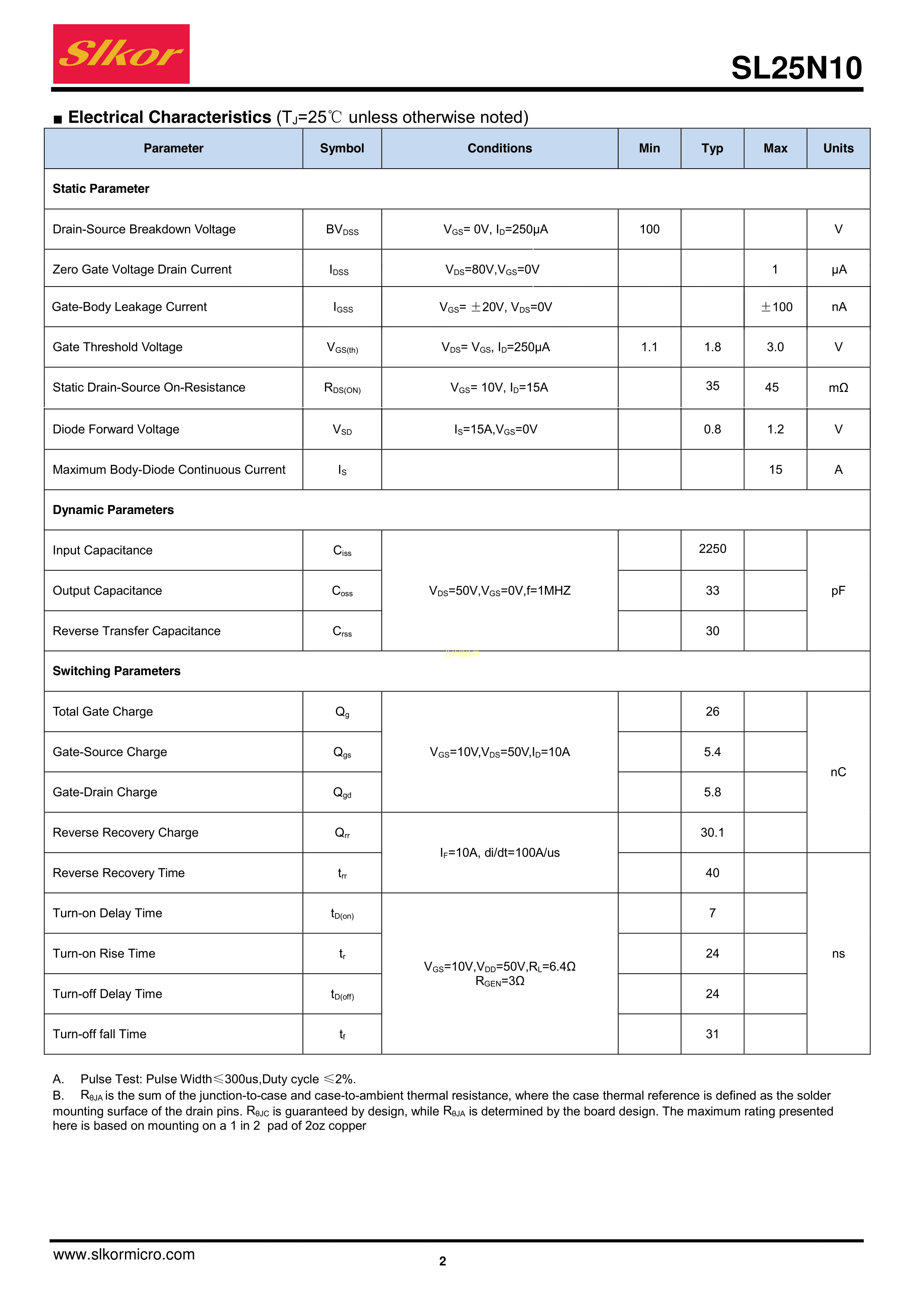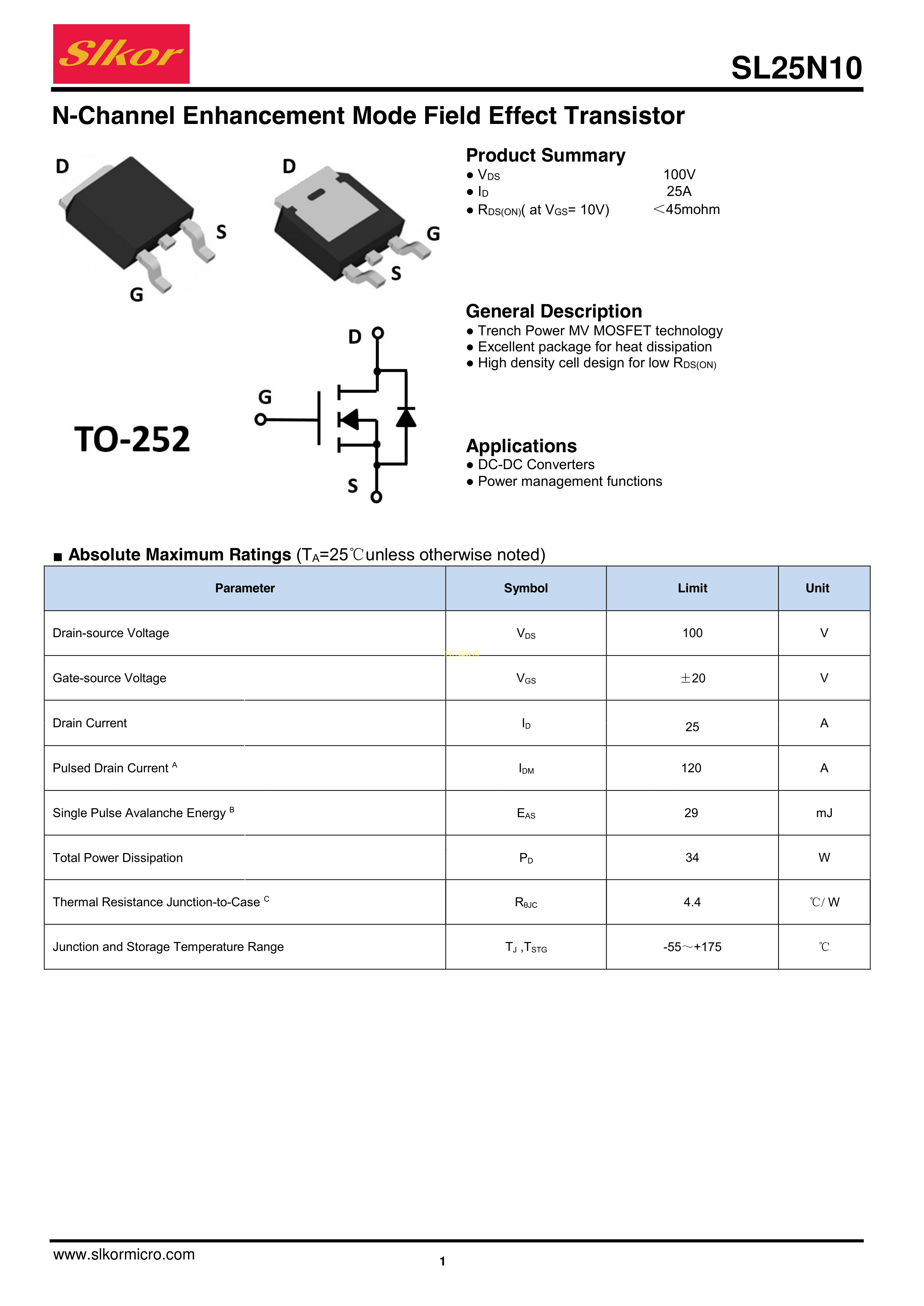 SL25N10数据手册TO-252封装Slkor(萨科微)PDF规格书,中英文下载