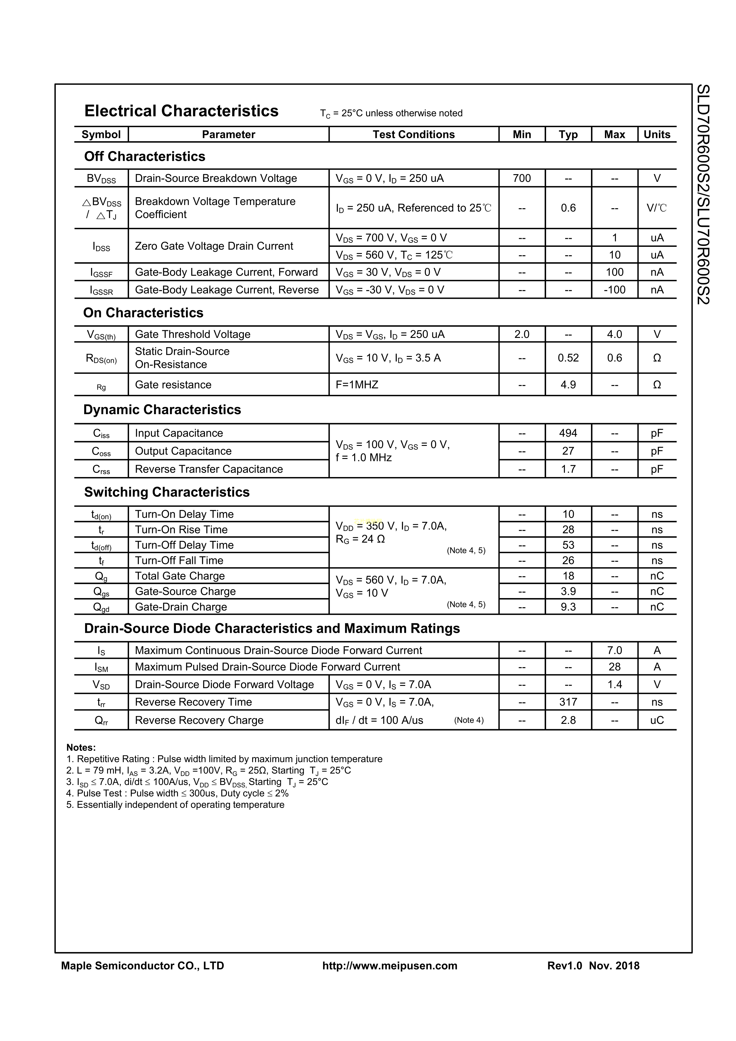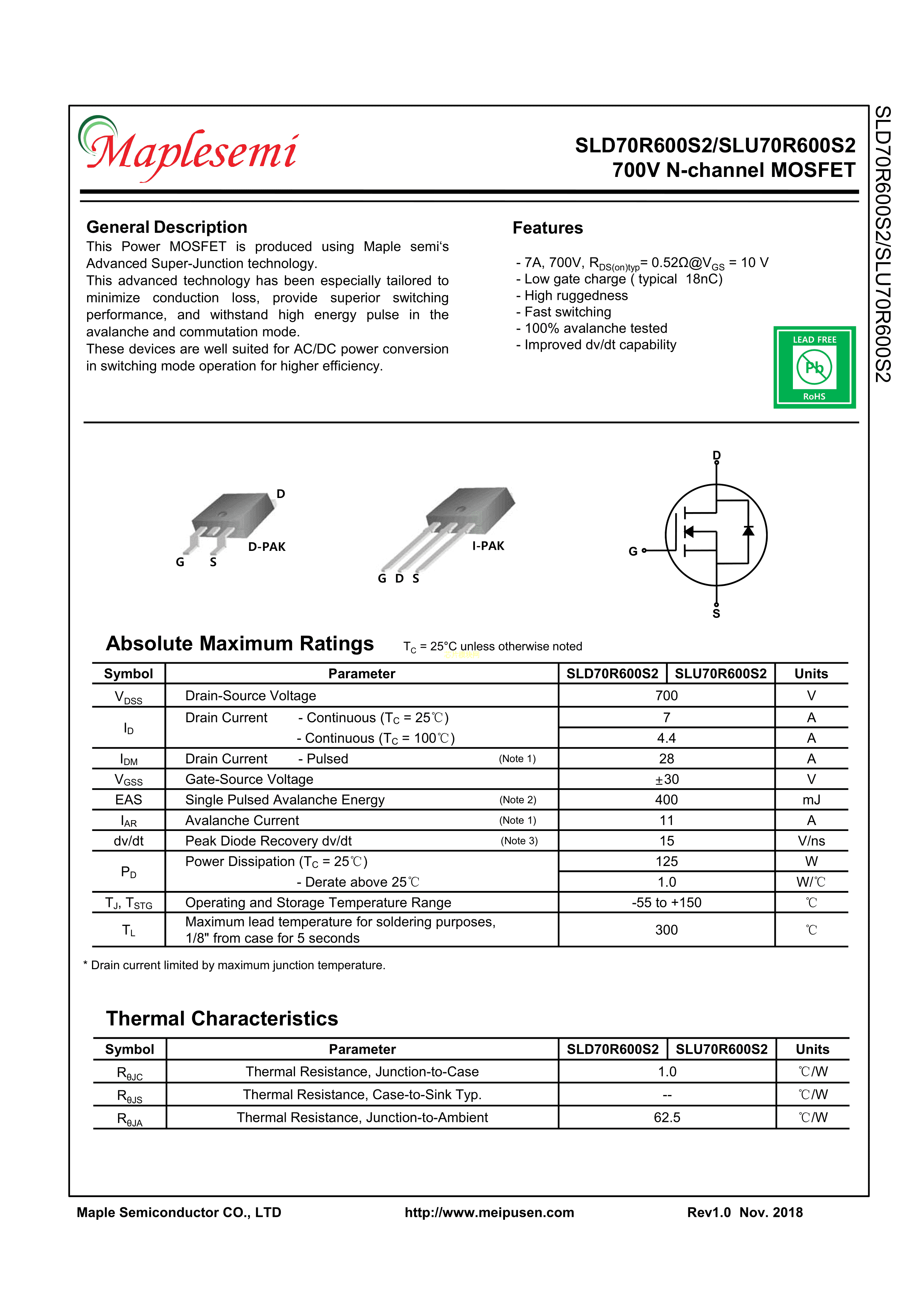 SLD70R600S2数据手册TO-252封装Maplesemi(美浦森)PDF规格书,中英文下载