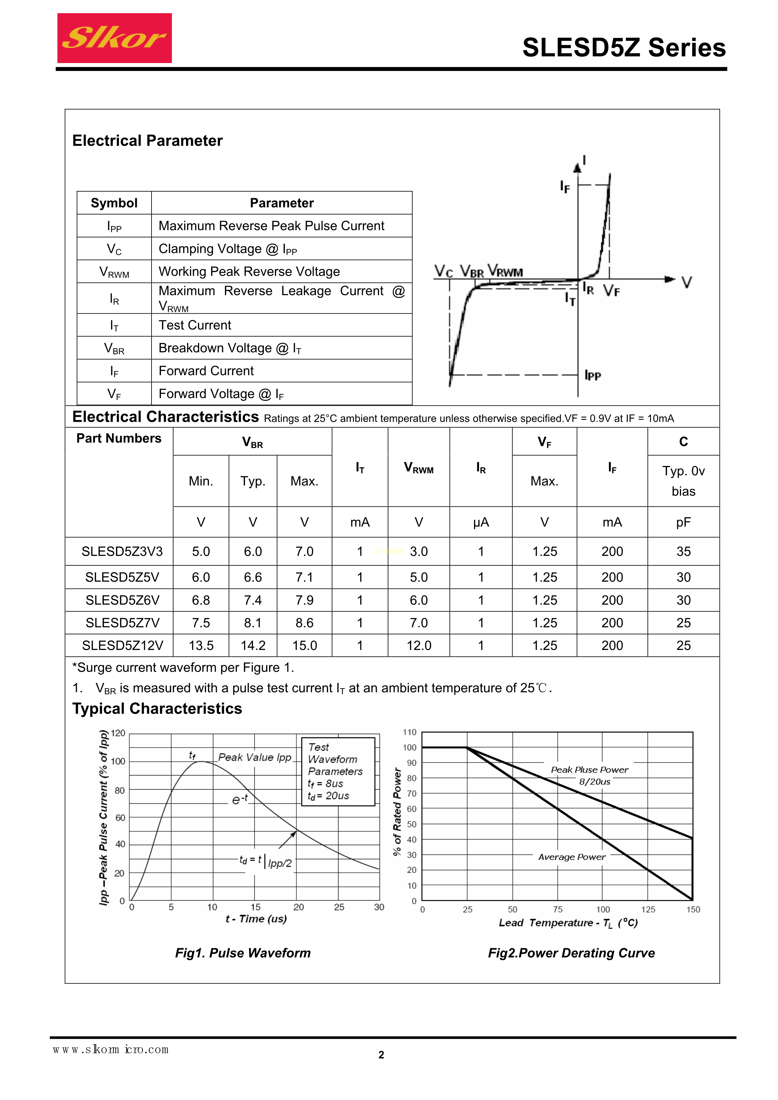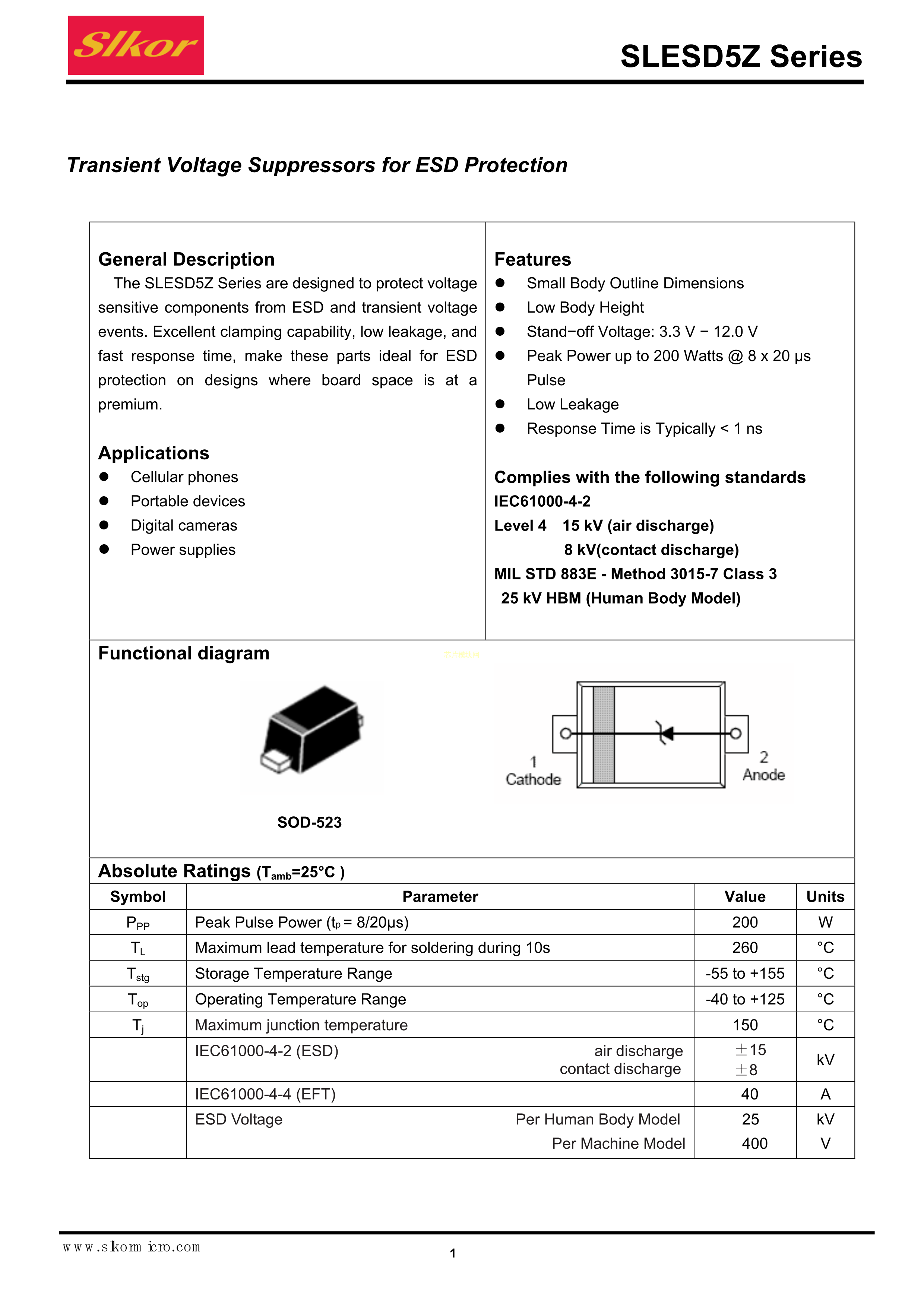 SLESD5Z5V数据手册SOD-523封装Slkor(萨科微)PDF规格书,中英文下载