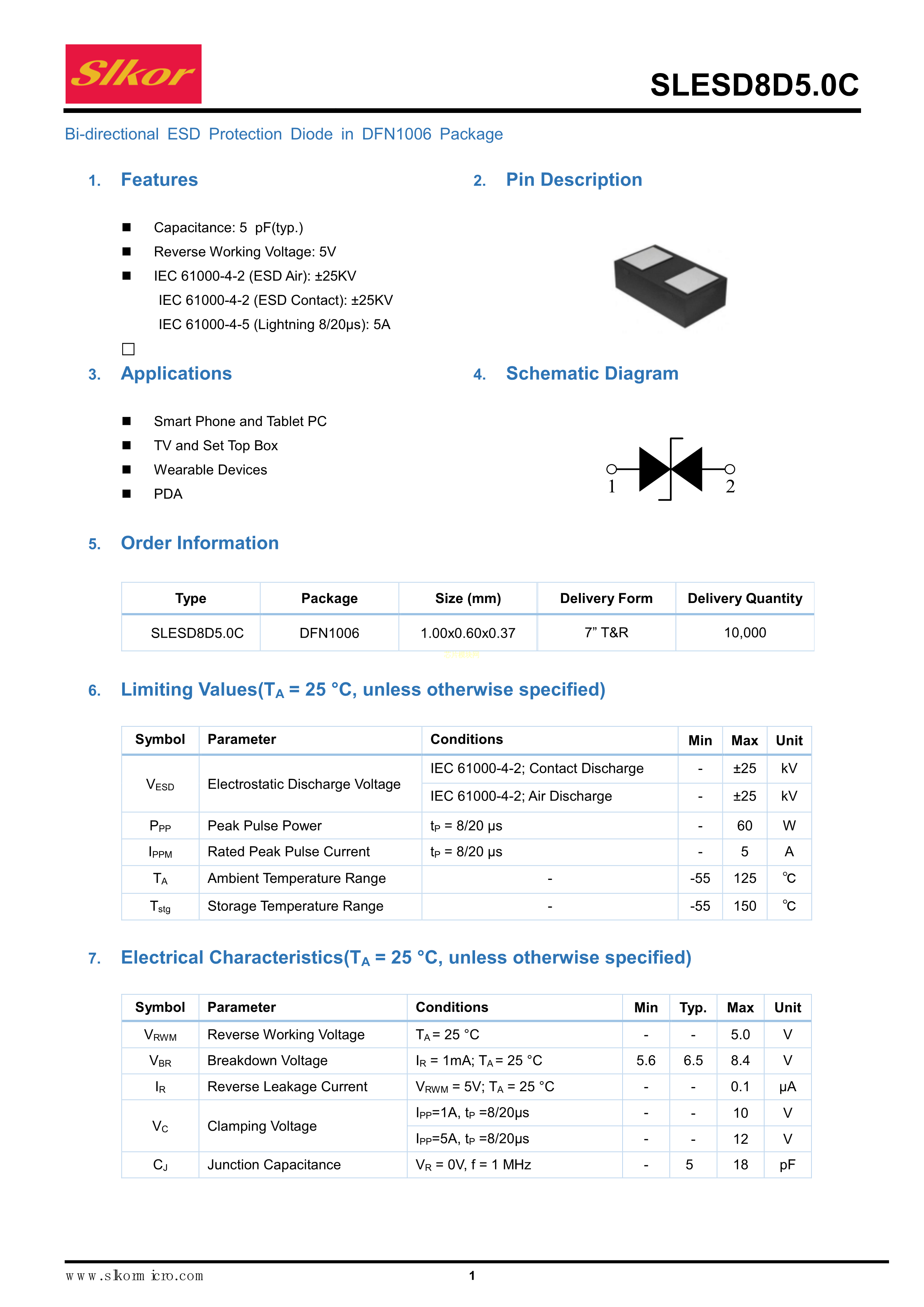 SLESD8D5.0C数据手册DFN1006封装Slkor(萨科微)PDF规格书,中英文下载